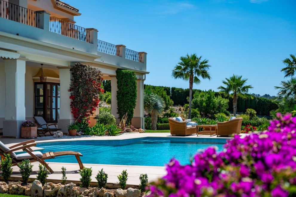 At this immaculate home, the outdoor spaces are just as impressive as the interiors. Large covered terraces face south and west, ensuring sun throughout the day. A heated saltwater swimming pool forms the centrepiece of the garden. Around it, you find generous sunbathing areas and (again!) open views of the landscape.