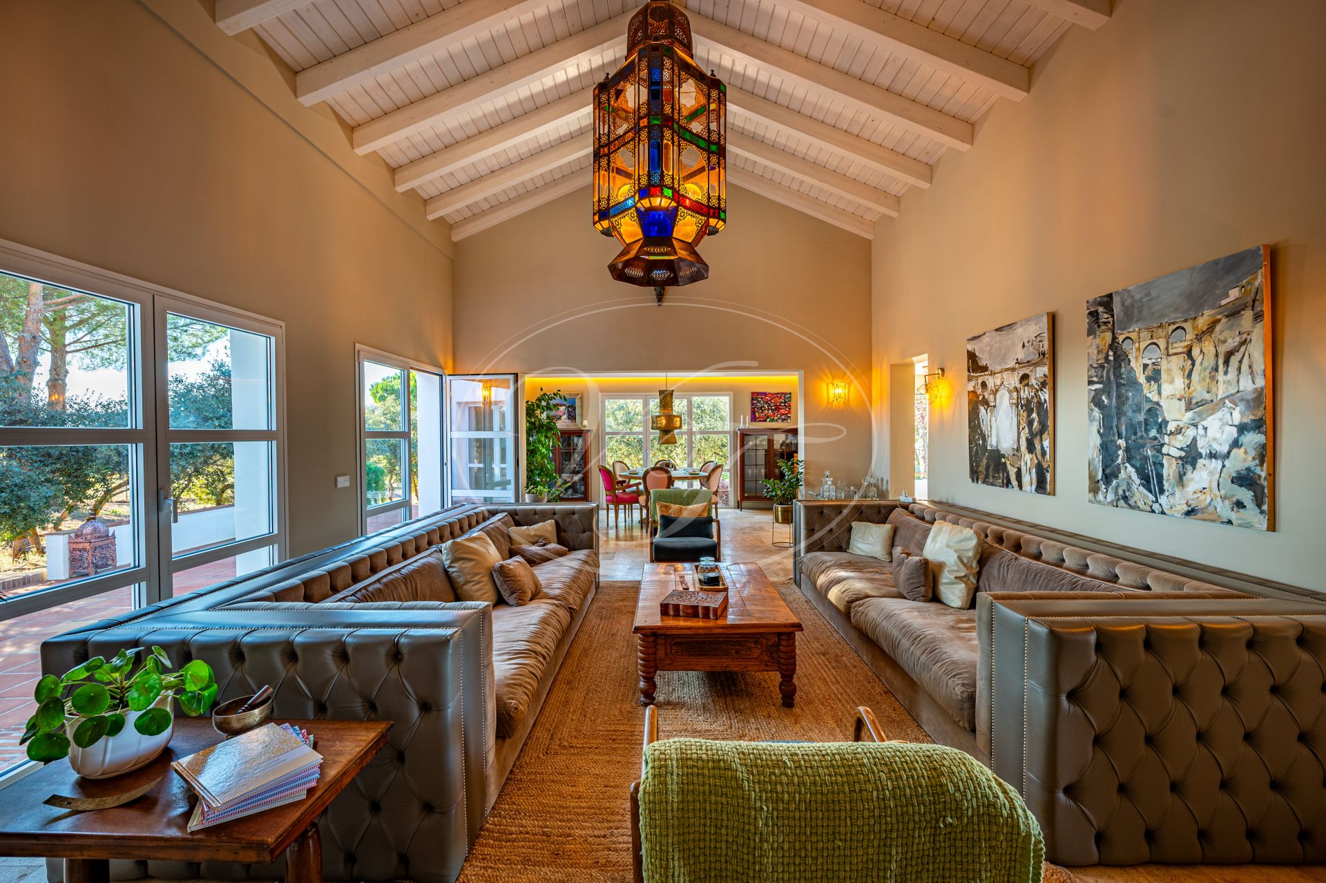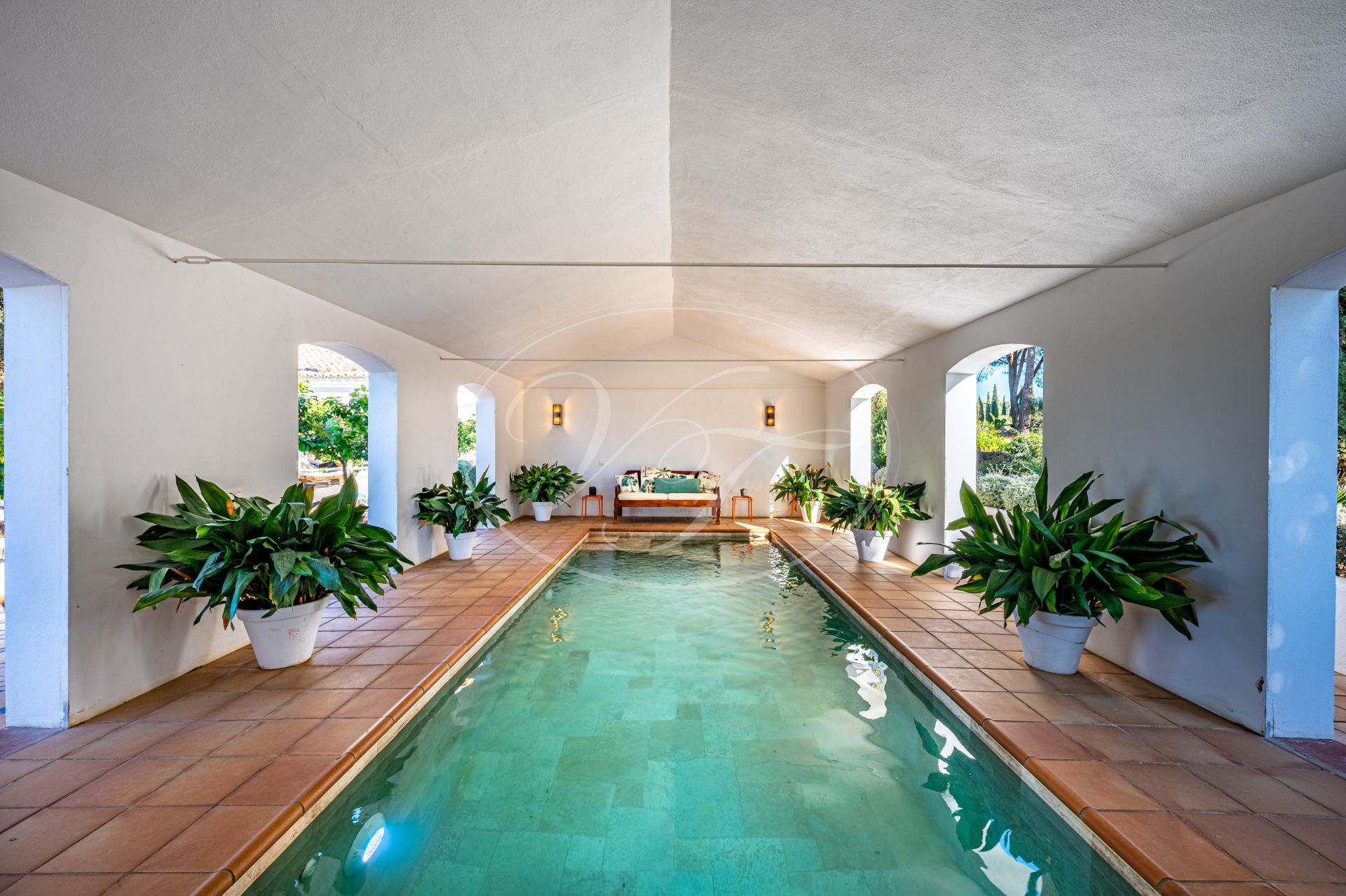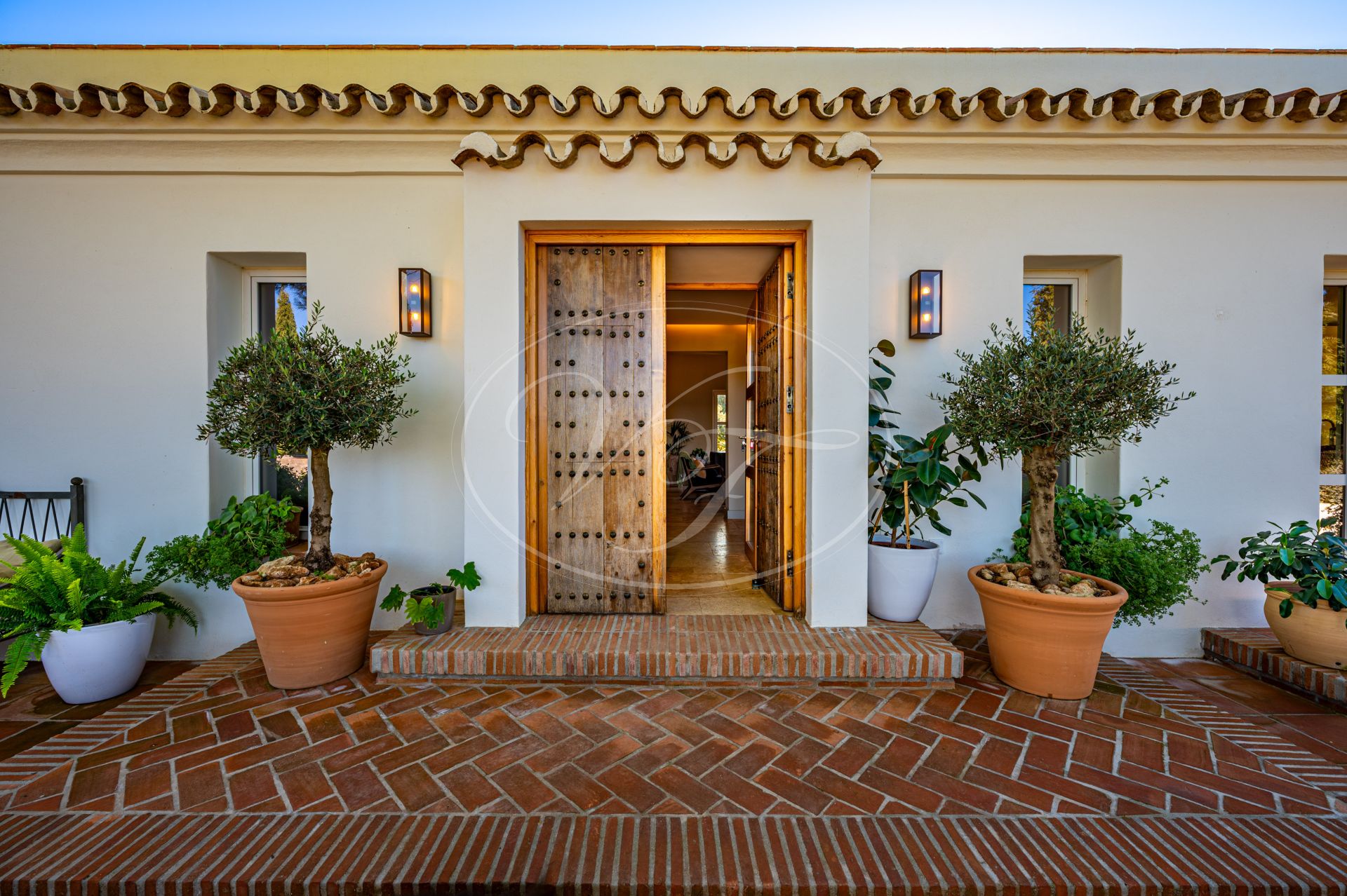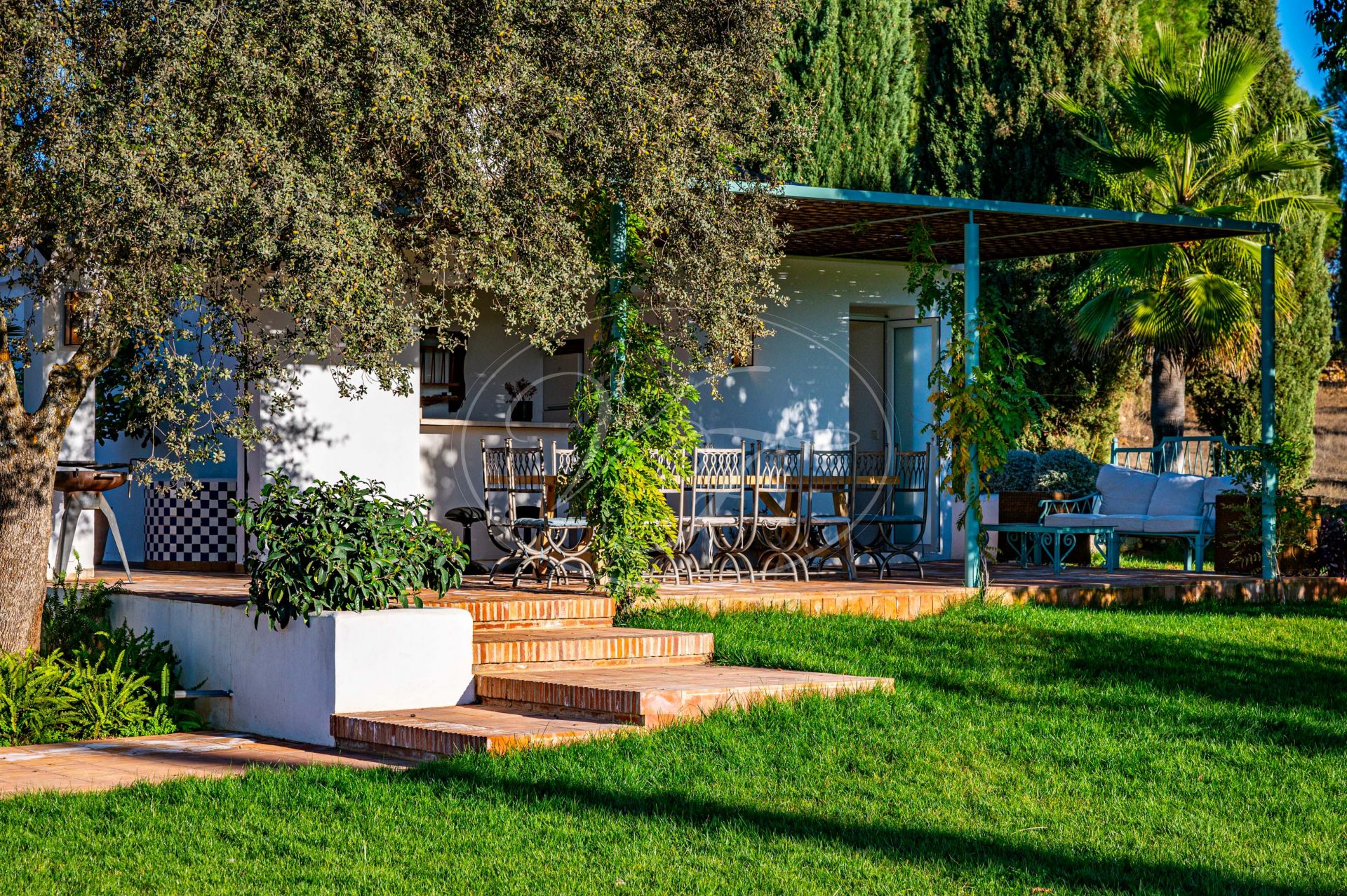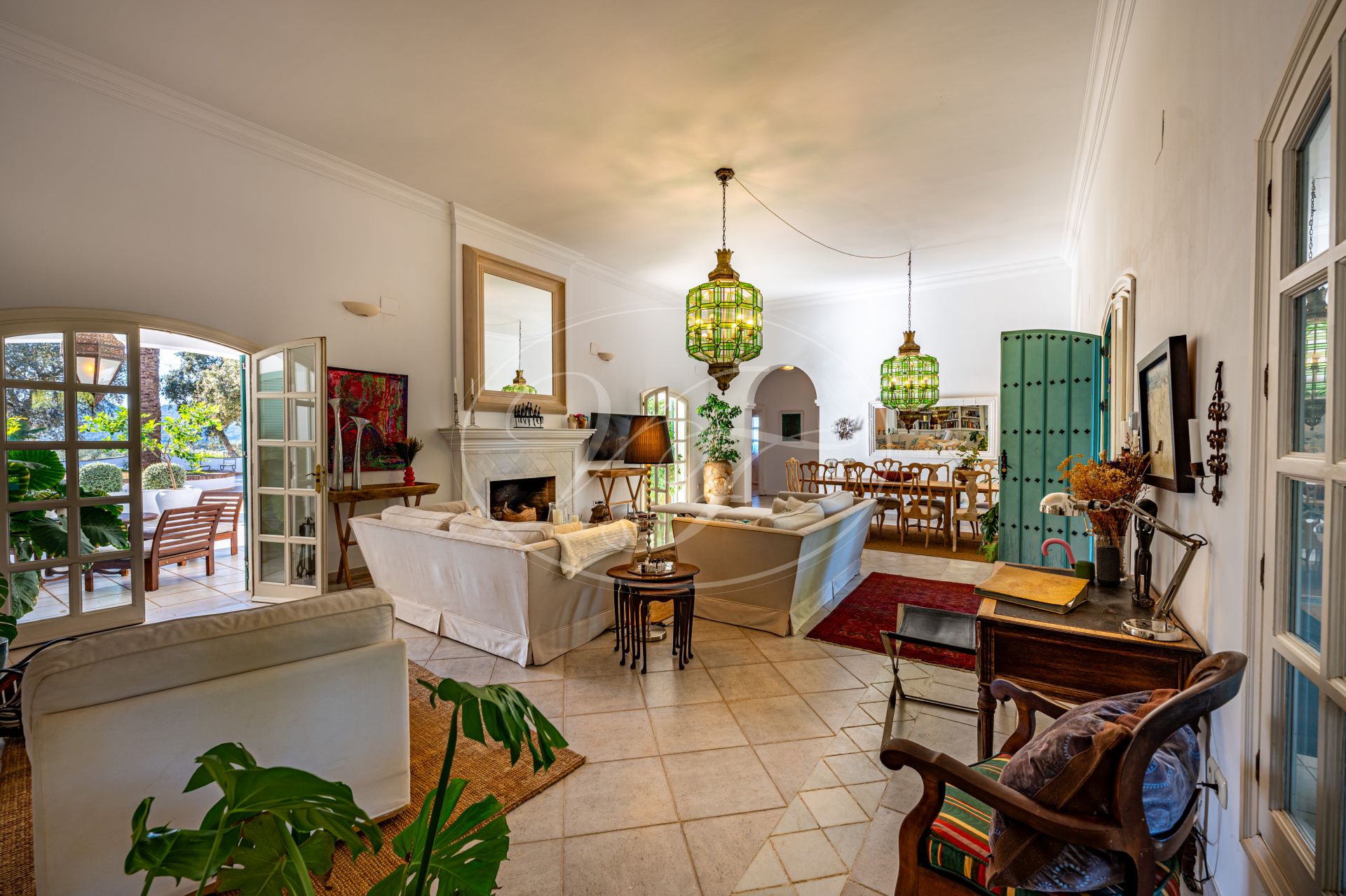 Vom Wohnzimmer führen schöne Glastüren auf die überdachten Terrassen mit andalusischen Bögen und zum zentralen Patio. Auf den Terrassen befinden sich eine gemütliche Lounge-Ecke sowie ein fantastischer Essbereich im Freien. In der Mitte des Patios steht eine prächtige Palme – ein echter Hingucker. Die Terrassen und der Innenhof sind, ebenso wie der vordere Patio, liebevoll mit duftenden und farbenfrohen Pflanzen dekoriert.
