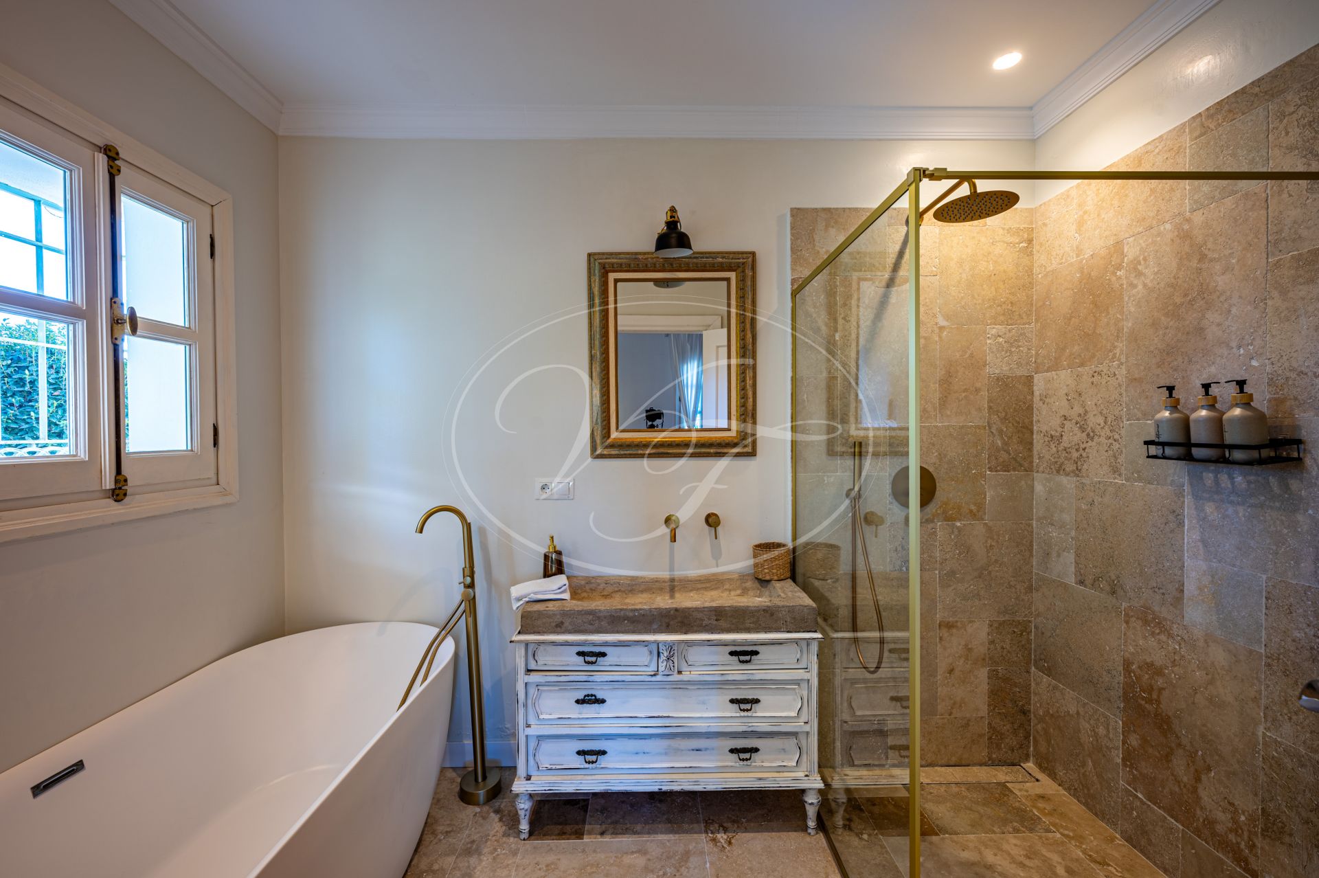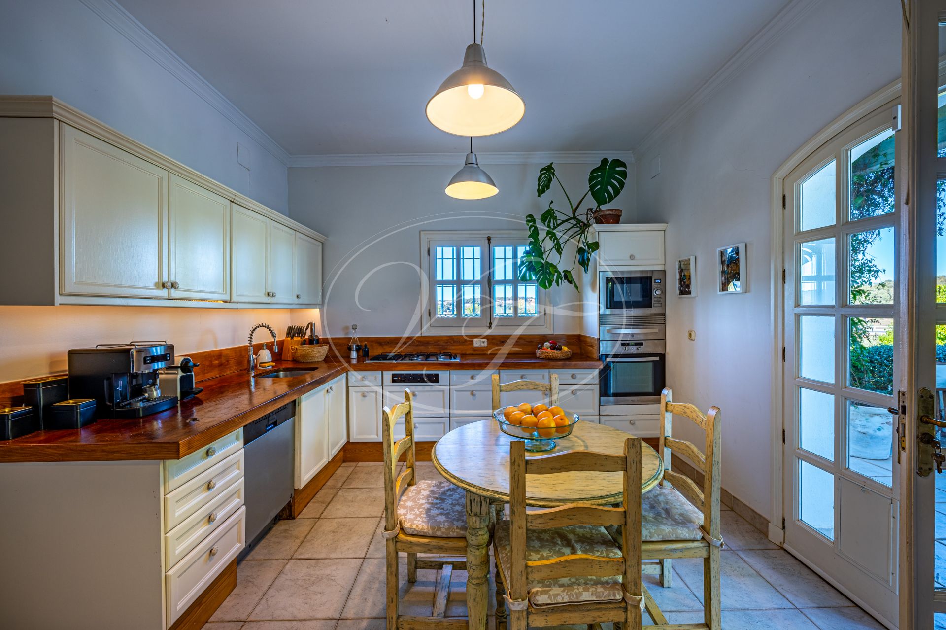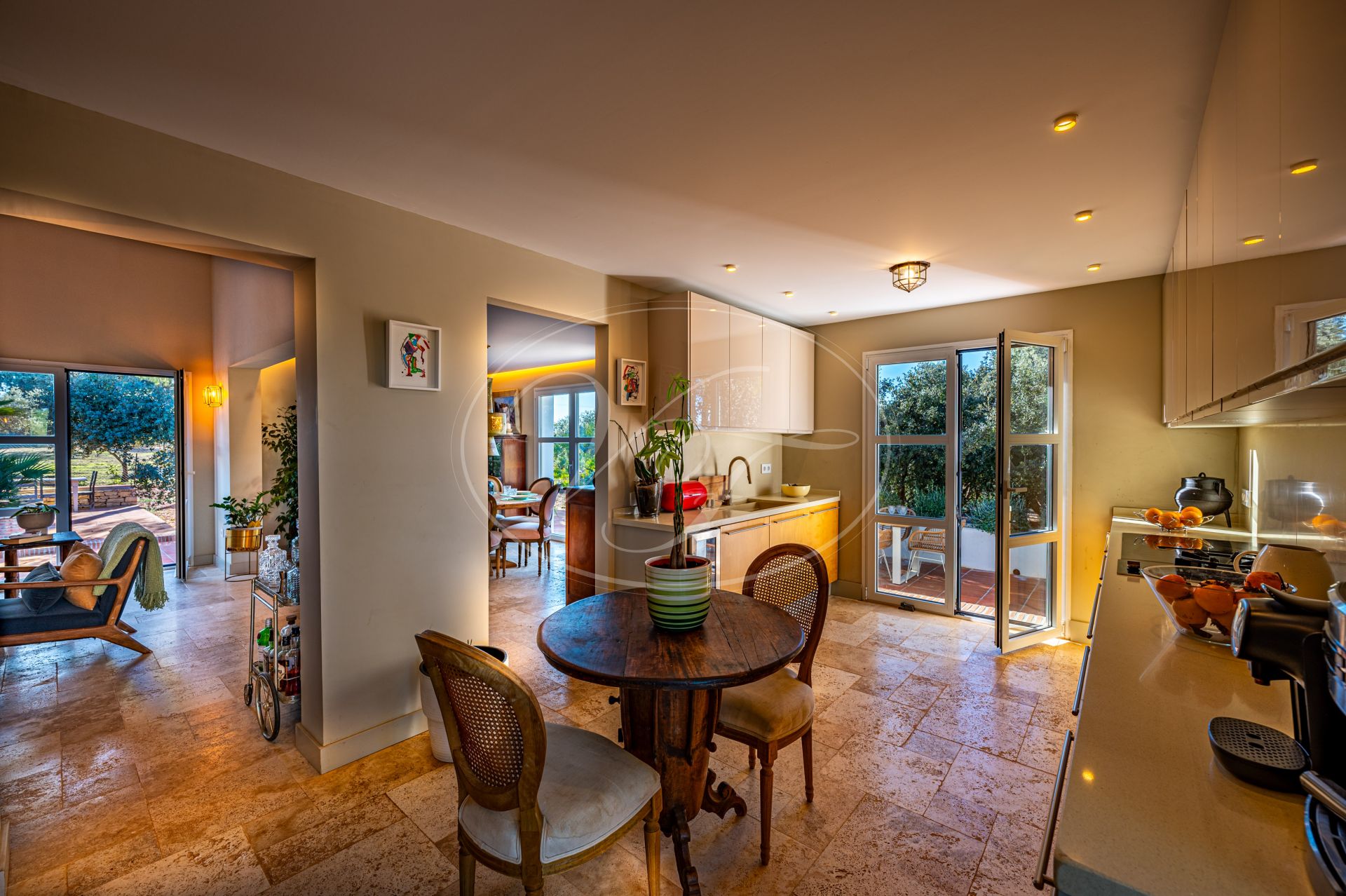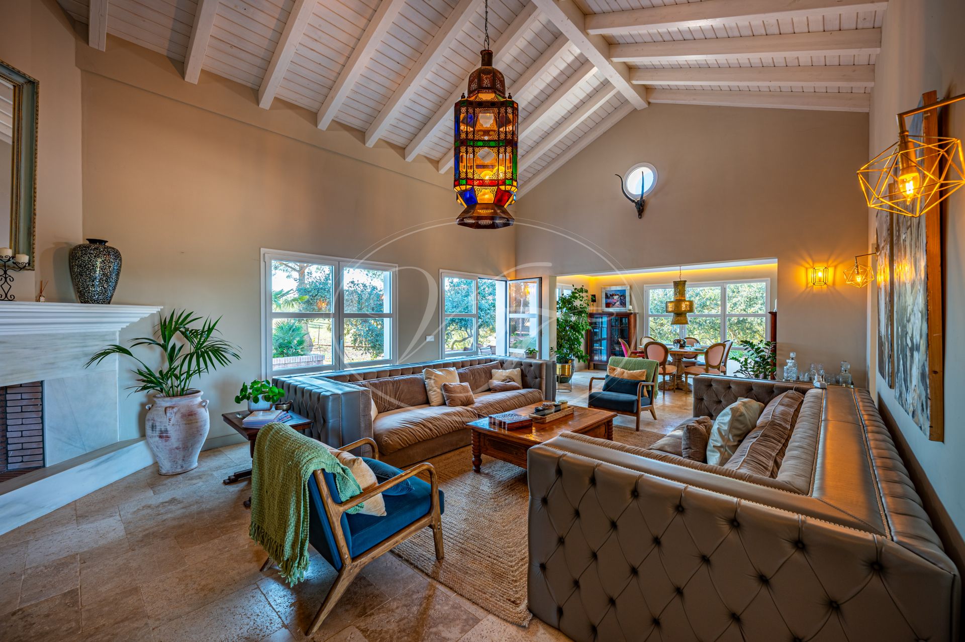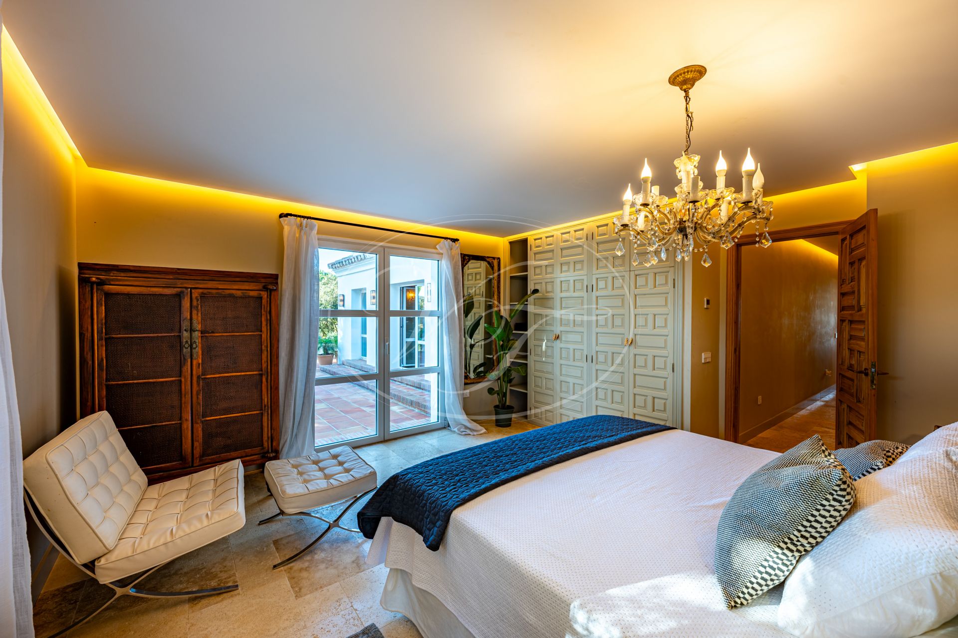 Vom Wohnzimmer führen schöne Glastüren auf die überdachten Terrassen mit andalusischen Bögen und zum zentralen Patio. Auf den Terrassen befinden sich eine gemütliche Lounge-Ecke sowie ein fantastischer Essbereich im Freien. In der Mitte des Patios steht eine prächtige Palme – ein echter Hingucker. Die Terrassen und der Innenhof sind, ebenso wie der vordere Patio, liebevoll mit duftenden und farbenfrohen Pflanzen dekoriert.