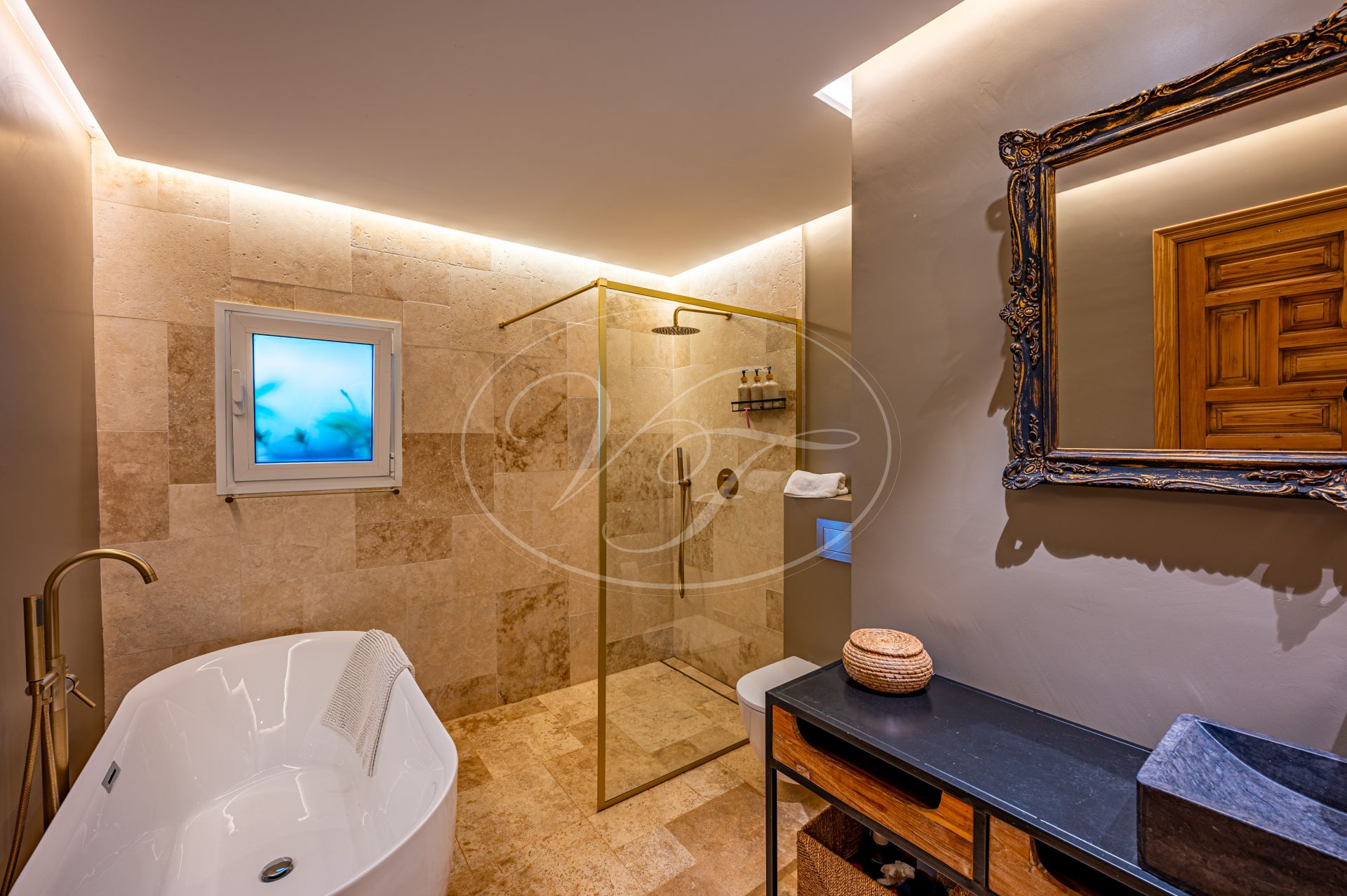 Das sehr großzügige Gästehaus, ebenfalls vollständig renoviert, ist entweder über den „zukünftigen“ Weinberg oder über eine Privatstraße erreichbar. Auch hier sorgt eine Fußbodenheizung im gesamten Haus für Komfort, und die hohen Decken fallen sofort ins Auge. Beim Betreten durch schöne Holztüren gelangt man in eine einladende Eingangshalle, die direkt in das offene Wohn- und Esszimmer führt. Große französische Türen durchfluten die Casita mit natürlichem Licht und schaffen eine angenehme, luftige Atmosphäre. Auch das Wohnzimmer verfügt über einen Kamin. Hauswirtschaftsraum vorhanden.
