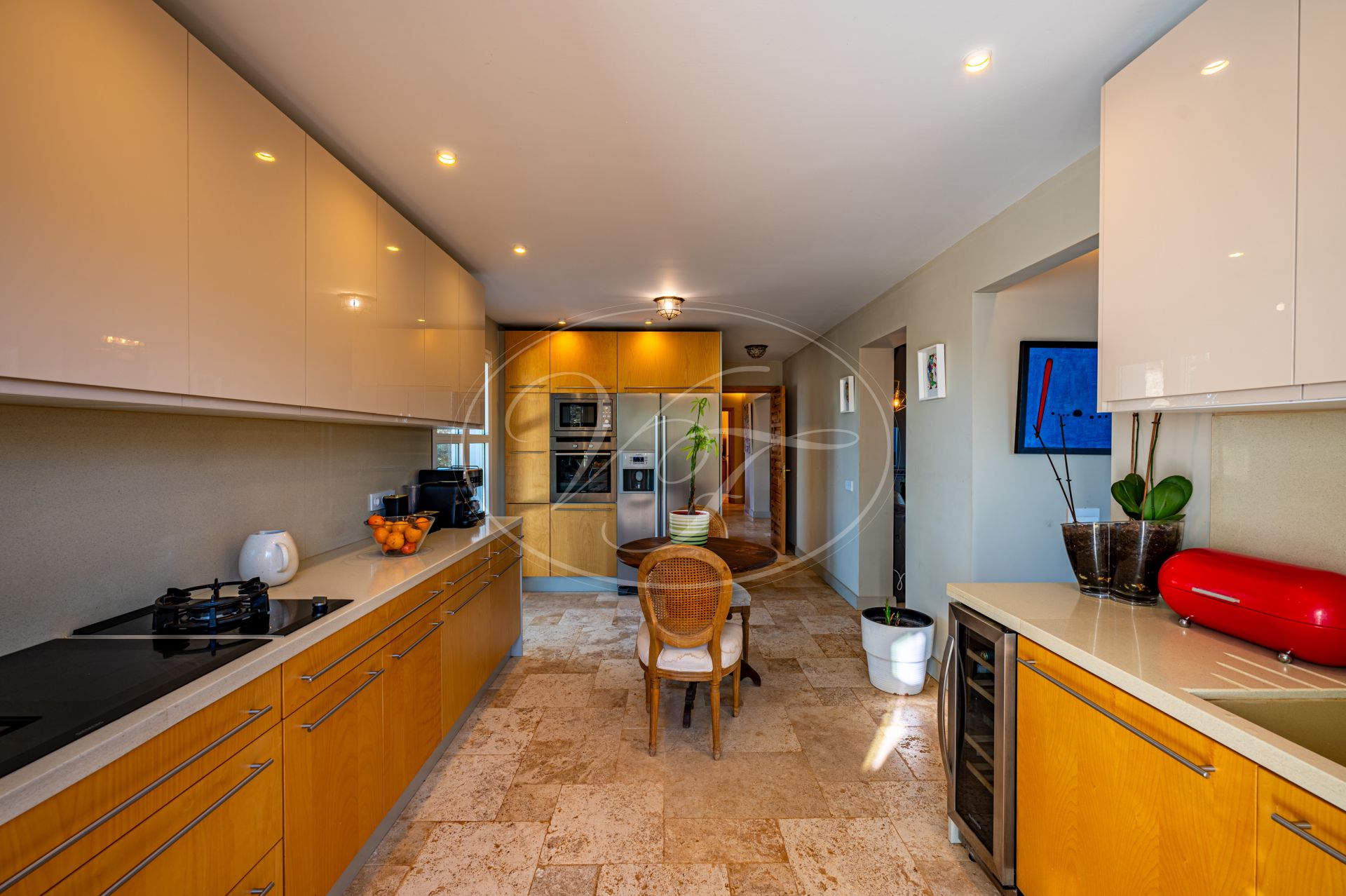 Die geräumige Küche ist entweder von der Eingangshalle oder vom Esszimmer aus zugänglich. Das Gästehaus bietet drei wunderschöne Suiten mit privaten Badezimmern. Von außen führt eine Treppe auf die Dachterrasse – ideal zum Sonnenbaden. Zudem gibt es einen Keller mit Technikraum und zusätzlichem Stauraum.