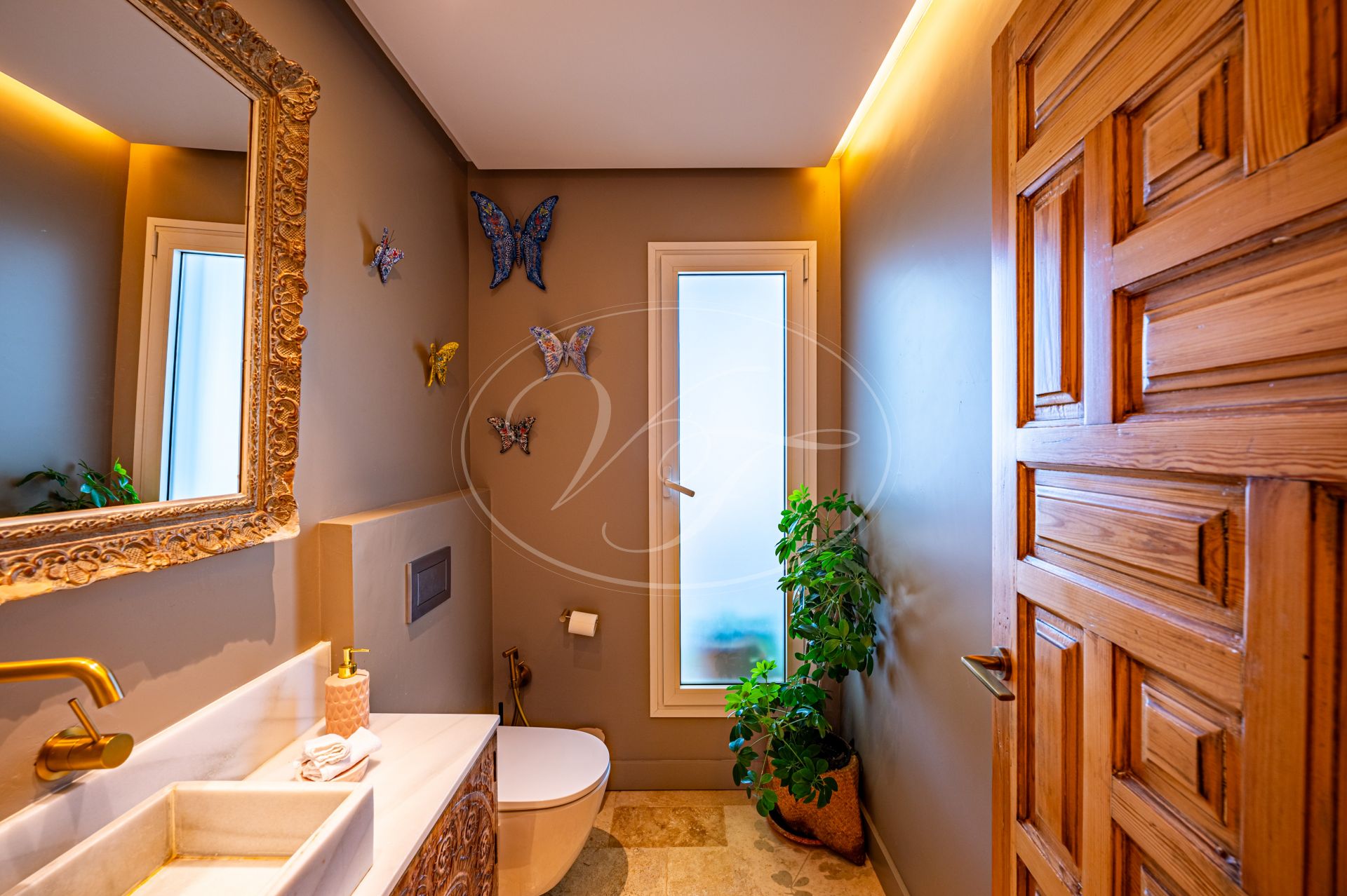 Weiter im rechten Flügel befinden sich zwei zusätzliche Gästesuiten, beide mit eigenem Bad. Ein separates Gäste-WC ist ebenfalls vorhanden. Eine Treppe führt hinunter in den Keller, wo reichlich Stauraum, ein Technikraum, ein Garten-/Werkstattraum und sogar ein Badezimmer zur Verfügung stehen. Vom Keller hat man direkten Zugang ins Freie, in der Nähe der Garage.