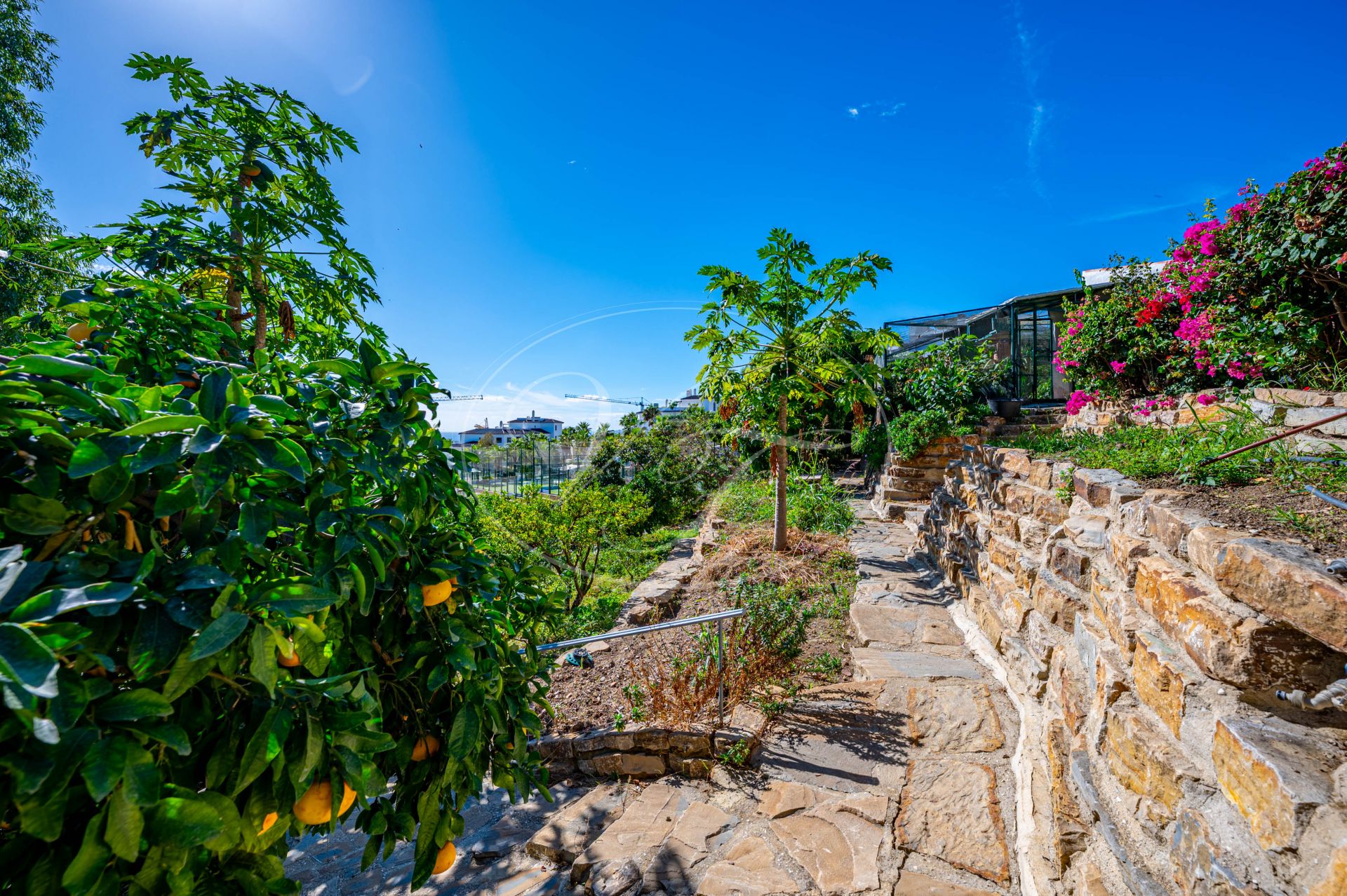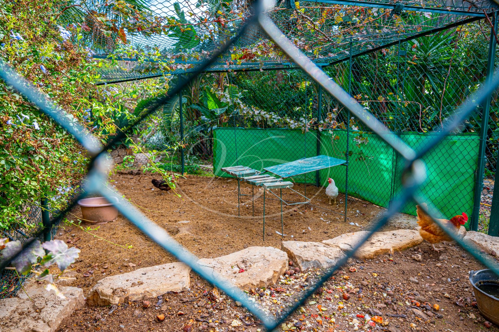Der Garten dieser Villa ist eine wahre Freude. Ein tropischer, gepflegter Garten mit Palmen, voll ausgewachsenen Bougainvillea, Beeten und einer großen Rasenfläche. Rund um den beheizten Pool finden Sie großzügige Sonnenterrassen und eine Veranda mit einem Entspannungsbereich und einer Außenküche. Das gesamte 4000 m² große Grundstück ist landschaftlich gestaltet und wird genutzt. Es gibt Wege, die Sie zur Voliere, zu einer Gartenwerkstatt am unteren Ende des Grundstücks und zum Obst- und Gemüsegarten führen. Außerhalb des Blickfeldes befindet sich ein großer Wasserspeicher und ein Bereich zur Wassersammlung. Regenwasser und Tau werden gesammelt und zur Bewässerung verwendet.