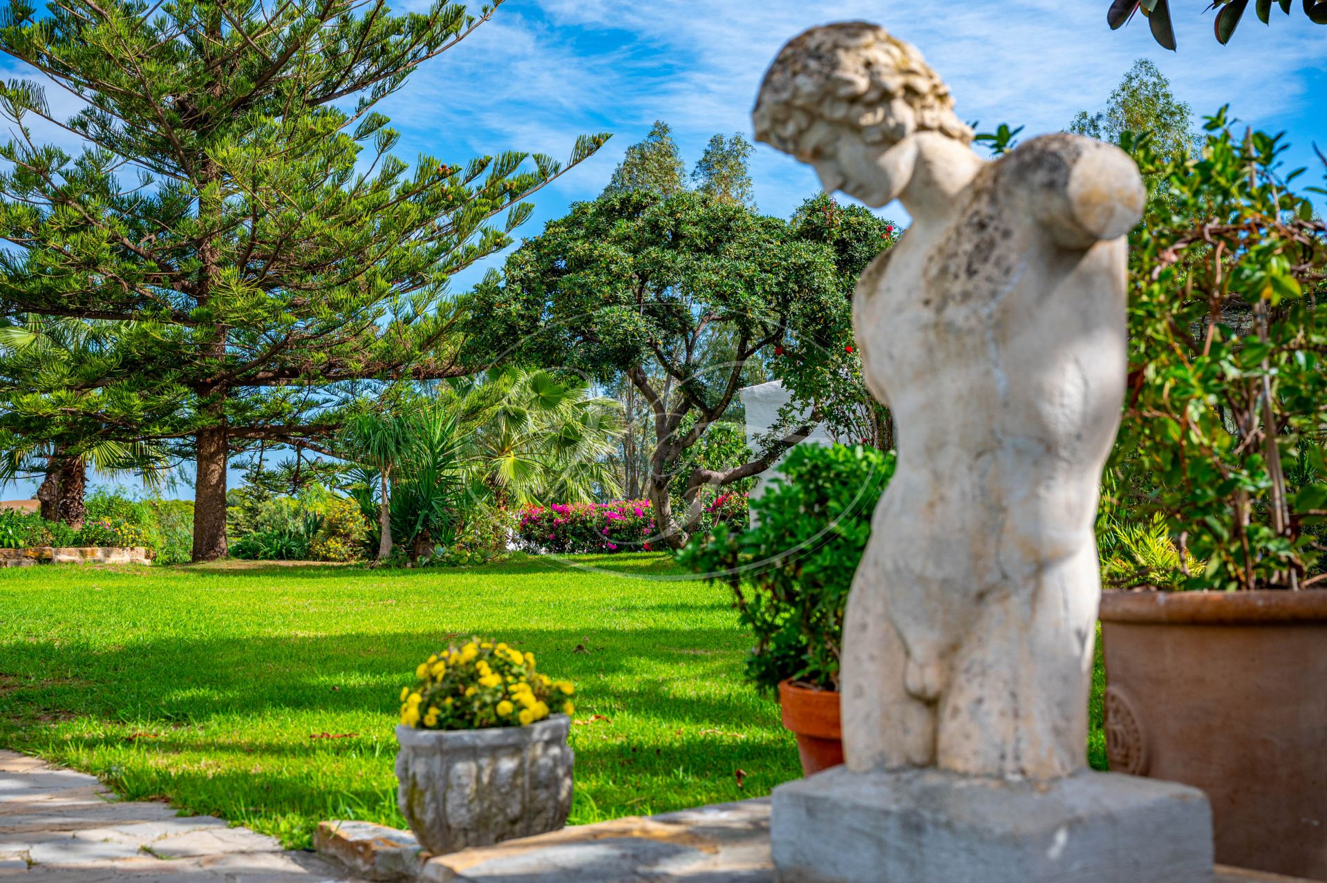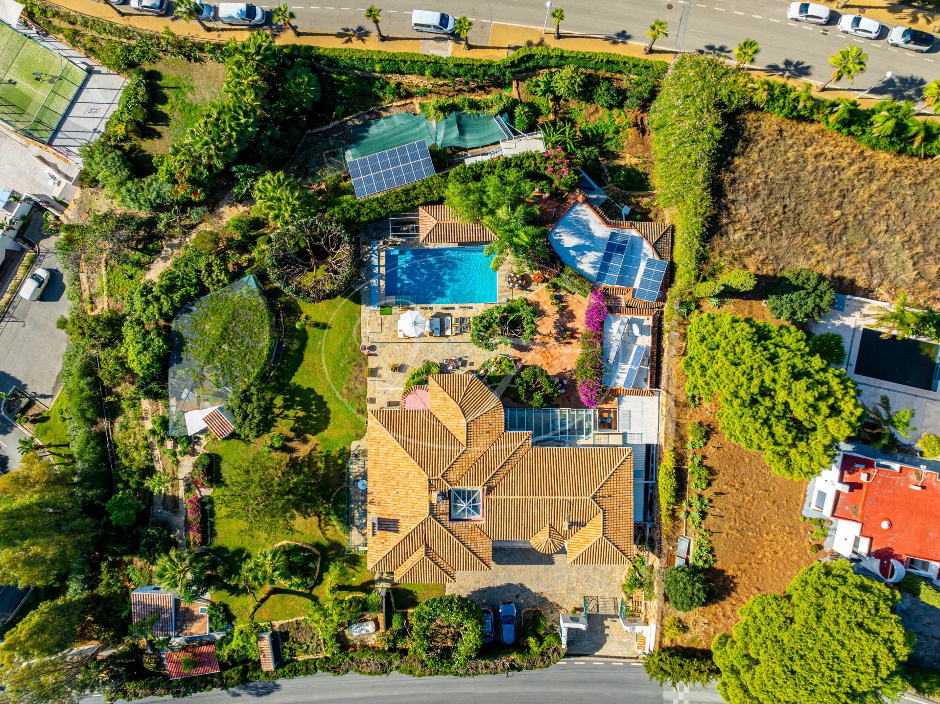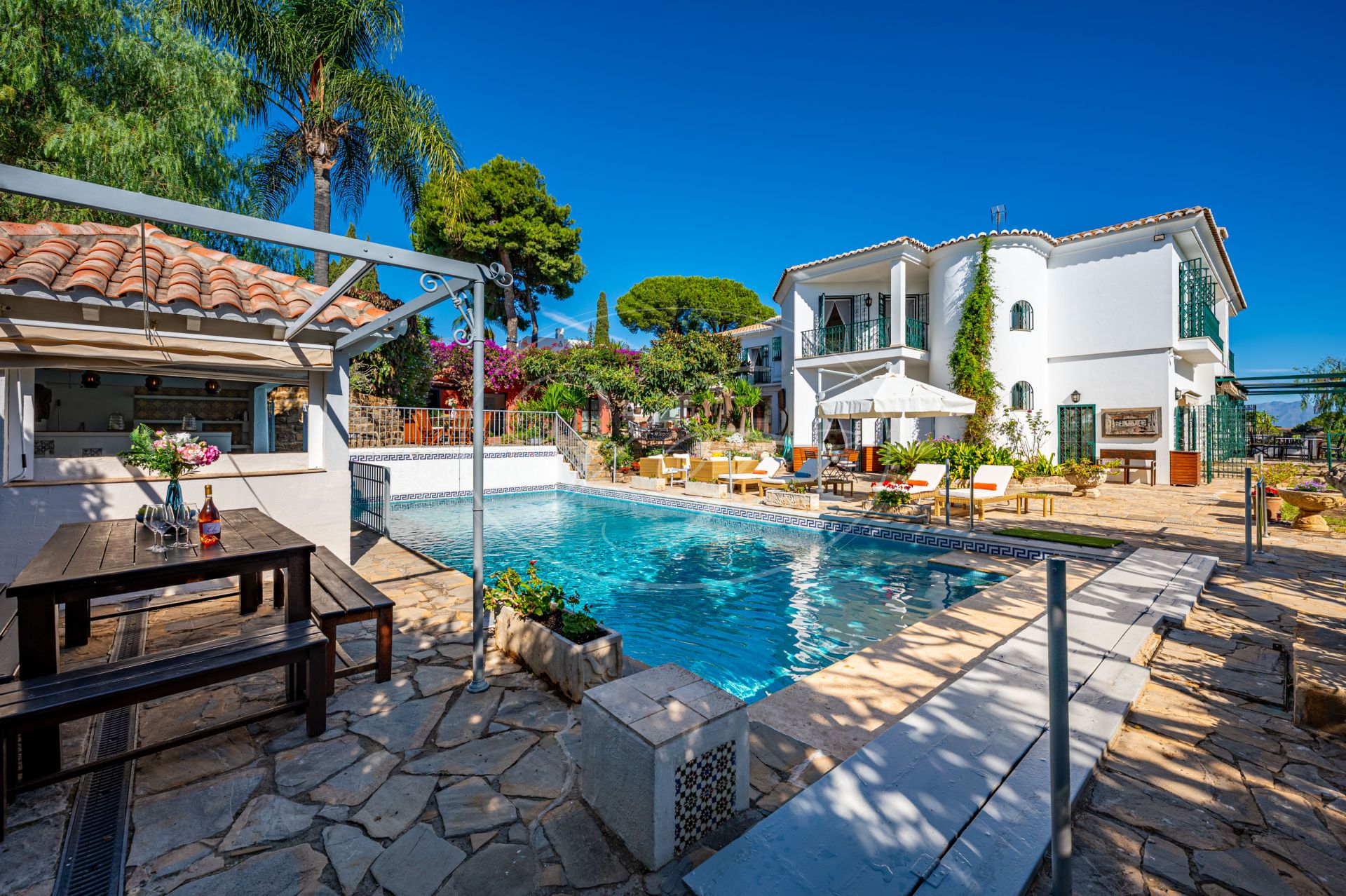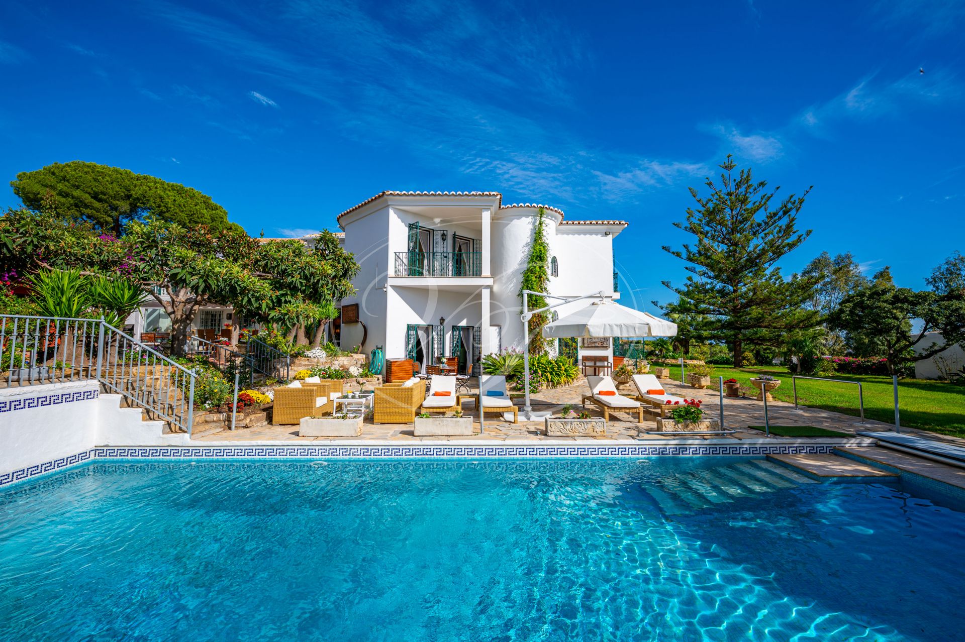 Einzigartige klassische Villa in makellosem Zustand mit Meerblick, Gästewohnung und gepflegtem Garten in Estepona, Costa del Sol, Spanien. Nur 5 Autominuten vom Zentrum von Estepona entfernt. Auf einem großzügigen Grundstück von 4000 m² mit gepflegtem tropischem Garten und beheiztem Pool. Eine einmalige Gelegenheit, ein großes Grundstück und eine großzügige Villa in Laufnähe zum Zentrum von Estepona zu erwerben.