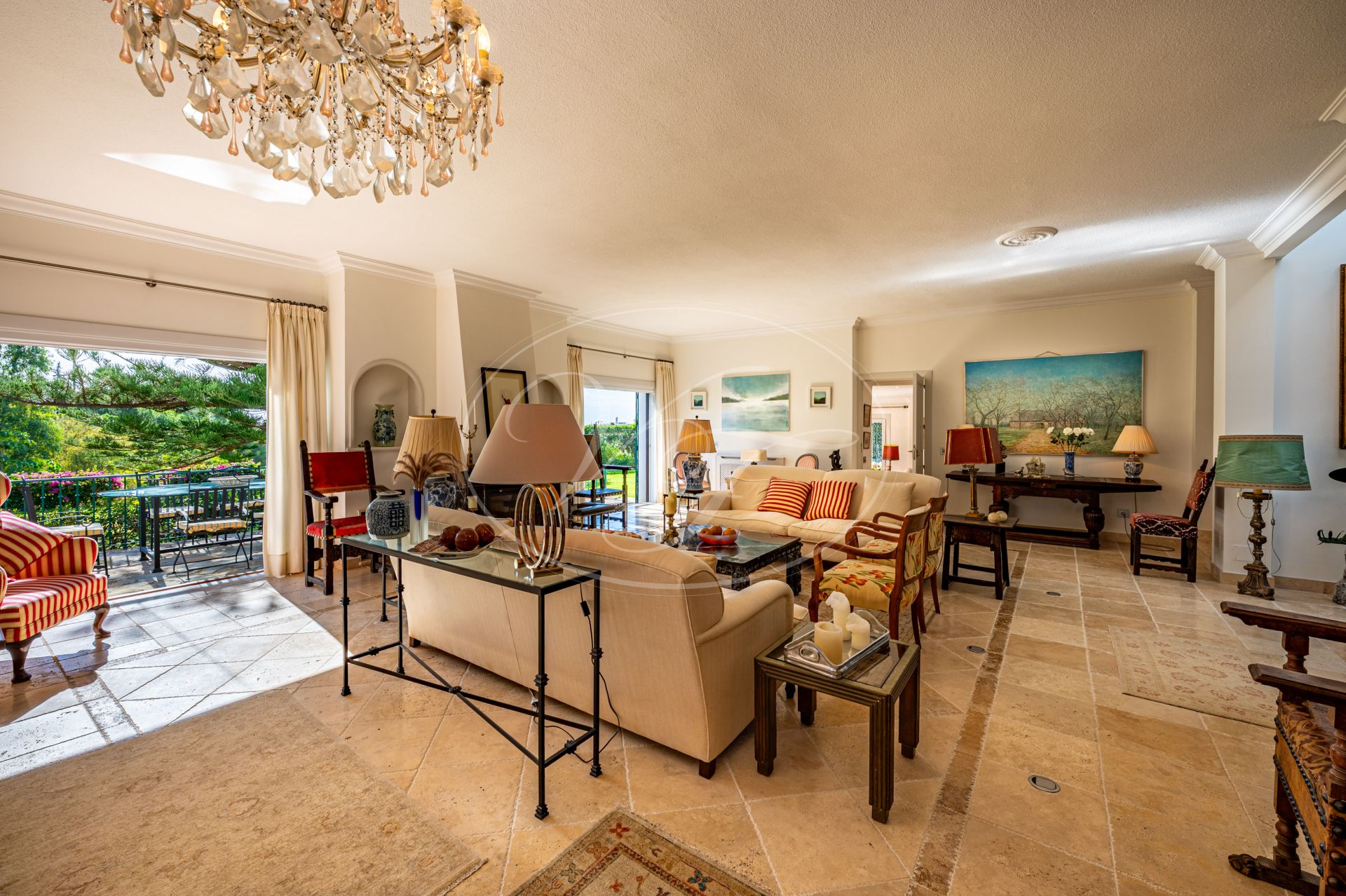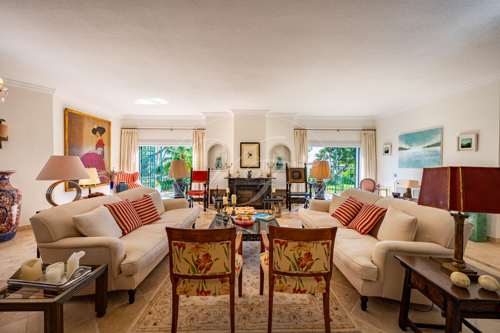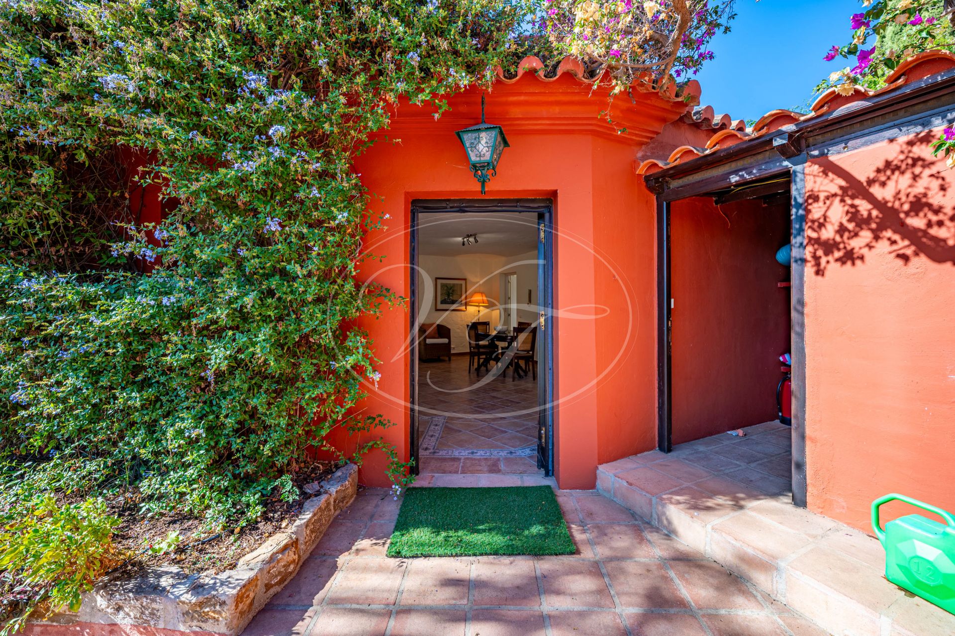 Direkter Zugang von der Hauptstraße. Automatische Tore führen zu einem Parkplatz im Freien und einer Garage für 2 Autos. Die Eingangstür öffnet sich zu einer doppelthohen Eingangshalle mit Gästetoilette. Wunderschöne rustikale Marmorböden im gesamten Haus. Das natürliche Licht strömt durch das große Oberlicht in der Mitte des Hauses herein und verleiht der Immobilie eine sofortige helle und offene Atmosphäre. Auf der linken Seite befindet sich ein geräumiges Wohnzimmer mit gemütlichem Kamin. Große Glastüren führen auf eine Terrasse mit Blick auf den Garten und den Rasen. Neben dem Wohnzimmer befindet sich eine Bibliothek oder ein potenzielles zweites Wohnzimmer, das ebenfalls auf eine romantische Terrasse und den gepflegten Garten führt. In dieser makellosen Landvilla in Estepona können Sie das Leben im Innen- und Außenbereich optimal gestalten. Von der Bibliothek aus haben Sie Zugang zu einem großen Schlafzimmer im Erdgeschoss mit einem geräumigen Bad en-suite. Dieses könnte auch als Home-Office genutzt werden.