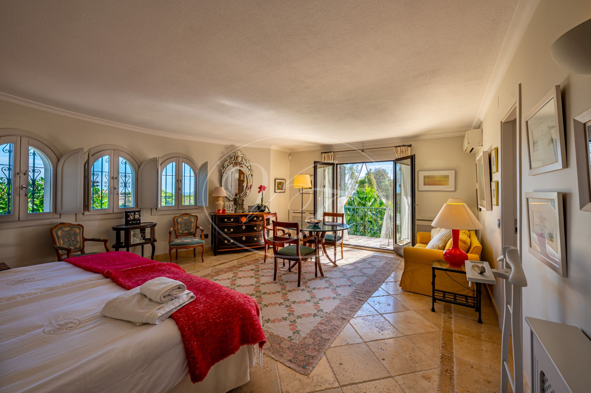 Der erste Stock dieser Landvilla ist über eine Treppe in der Eingangshalle zu erreichen. Vom Treppenabsatz gelangt man direkt in ein kleines Wohnzimmer. Von diesem Raum aus gelangt man zu zwei Gästezimmern, die jeweils über ein eigenes Bad verfügen. Beide Schlafzimmer haben große Fenstertüren, die auf einen Balkon führen. Zurück auf dem Treppenabsatz, der zur Mitte des ersten Stockwerks führt, finden Sie ein weiteres geräumiges Wohnzimmer oder Fernsehzimmer. Ein schöner Raum zum Entspannen im Sommer, um der Mittagshitze zu entfliehen, oder um mit den Kindern an einem Winterabend einen Film anzuschauen. on hier aus gibt es zwei weitere Gästezimmern, die sich ein Badezimmer teilen. Auch diese Schlafzimmern sind geräumig und verfügen über Balkone mit Blick auf den Garten, Estepona und das Mittelmeer in der Ferne. Die großzügige Master-Suite ist komplett privat und verfügt über große Fenster und Türen, die sich zu einem Balkon mit Blick auf den Garten, das Meer und die umliegende Landschaft öffnen. Die Master-Suite ist mit einem eigenen Badezimmer mit Badewanne und Dusche sowie einem großzügigen Ankleidebereich verbunden.