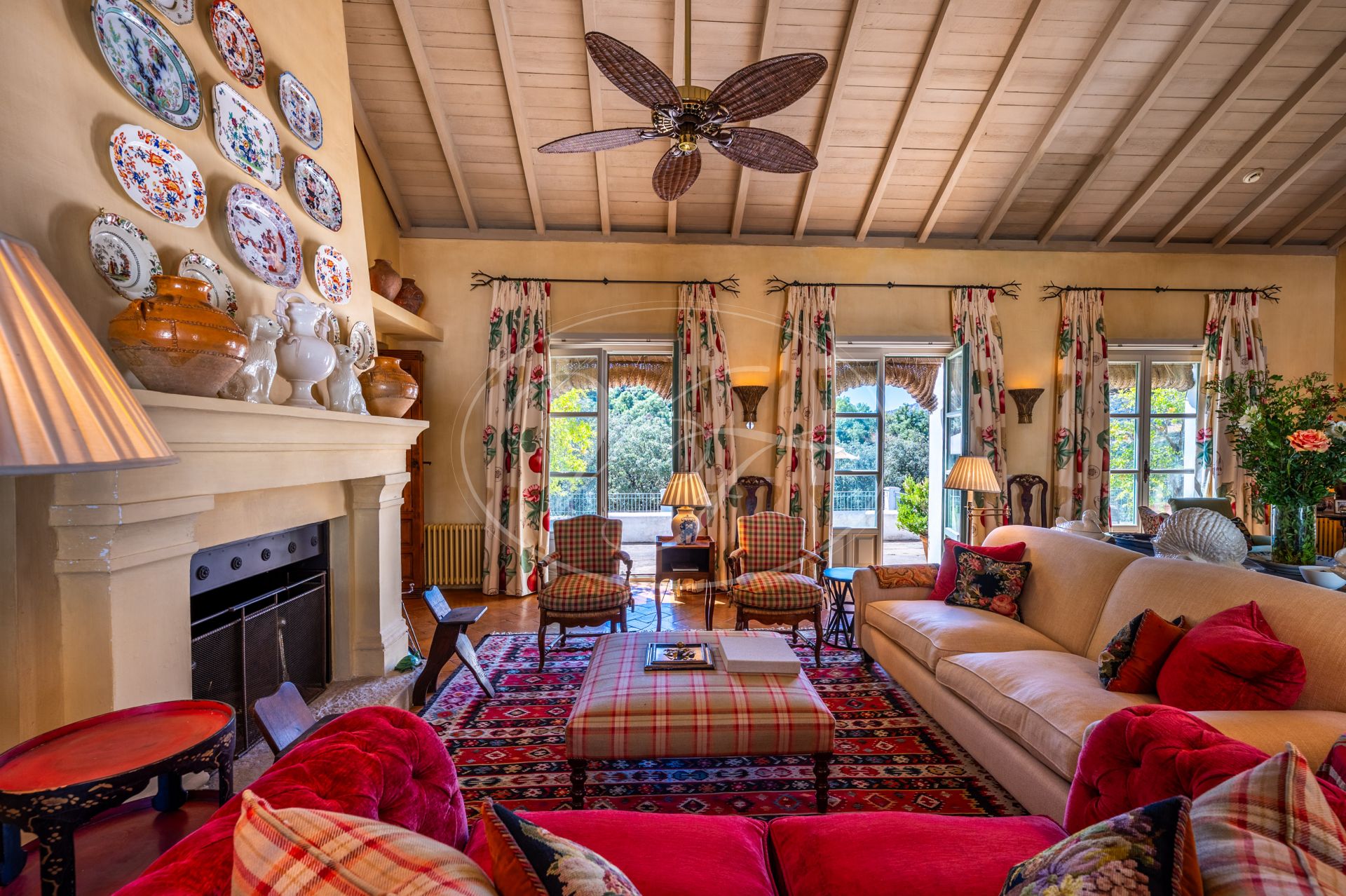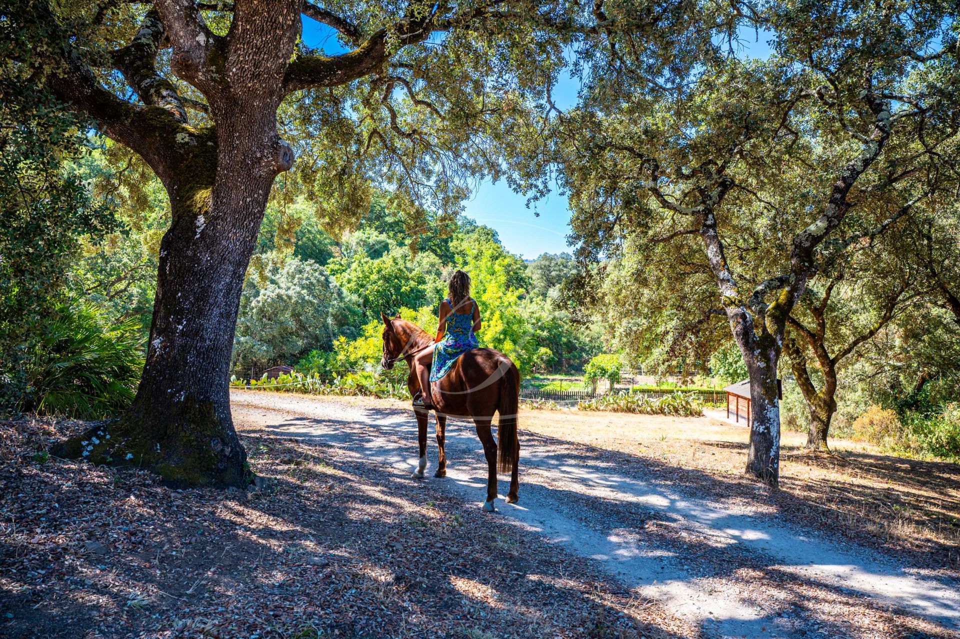 El estar rodeado en su totalidad por un río y un arroyo, hacen que la finca cuente con agua abundante, manteniendo el verde de los árboles y la vegetación casi todo el año. Esto unido a las llanuras de las que dispone la finca, la hacen ideal como finca de caballos. Actualmente hay varias zonas valladas para los caballos, cobertizos y diferentes senderos dentro de la finca para hacer rutas a caballos y disfrutar del espectacular entorno que le rodea. Además, en una parte de la finca hay un palmeral con alrededor de 6.000 palmeras adultas de diferentes especies y unos 6.500 nogales de pacana. La finca cuenta también con un huerto ecológico y un corral con gallinas que permiten disfrutar de verduras/frutas orgánicas y huevos frescos a diario.Dentro de la finca hay una preciosa casa de campo, que fue restaurada con mucho cariño y un gusto exquisito, manteniendo detalles de la casa original. Rehabilitada con suelos, puertas y vigas de madera recicladas de conventos y viviendas antiguas pero adaptada a las necesidades de hoy en día. La vivienda se ha restaurado estilo cortijo, con un patio central que da acceso a distintas dependencias de la villa. En la entrada antes del patio principal hay un amplio parking cubierto para varios vehículos. Desde este patio se accede a un amplio y acogedor salón con techos altos, vigas de madera, chimenea, vistas y acceso a las terrazas cubiertas y piscina. Este salón divide el cortijo en dos alas, en el ala izquierda a continuación del salón encontramos una acogedora biblioteca/sala de lecturas también con techos altos, vigas de maderas, chimenea y amplias ventanas con vistas al jardín. También se encuentra la suite principal con techos altos, vigas de madera, chimenea un amplio vestidor y cuarto de baño en suite con bañera y ducha independiente. Esta habitación tiene amplias ventanas con vistas al jardín y acceso desde el patio central.