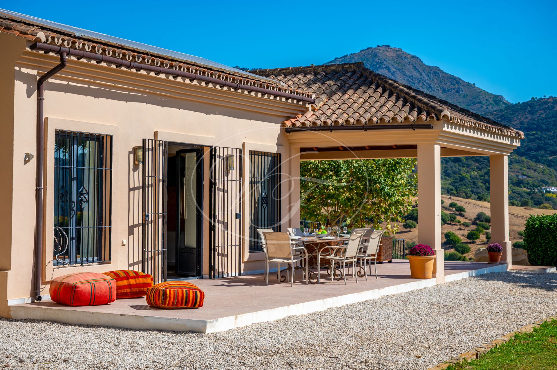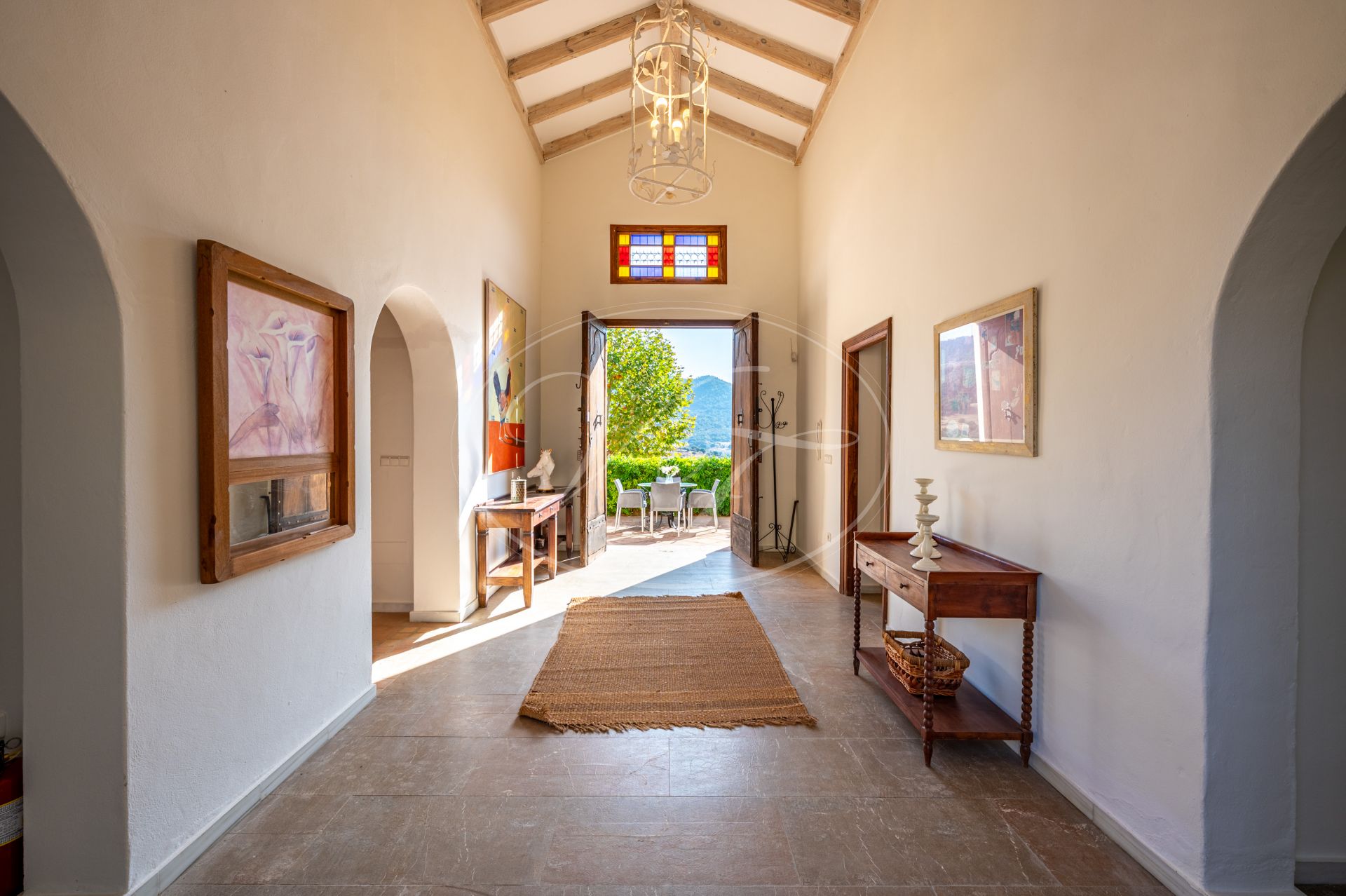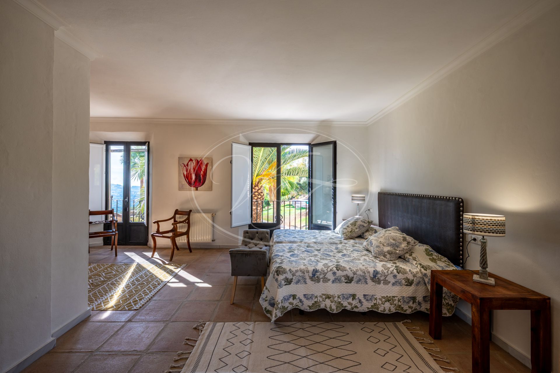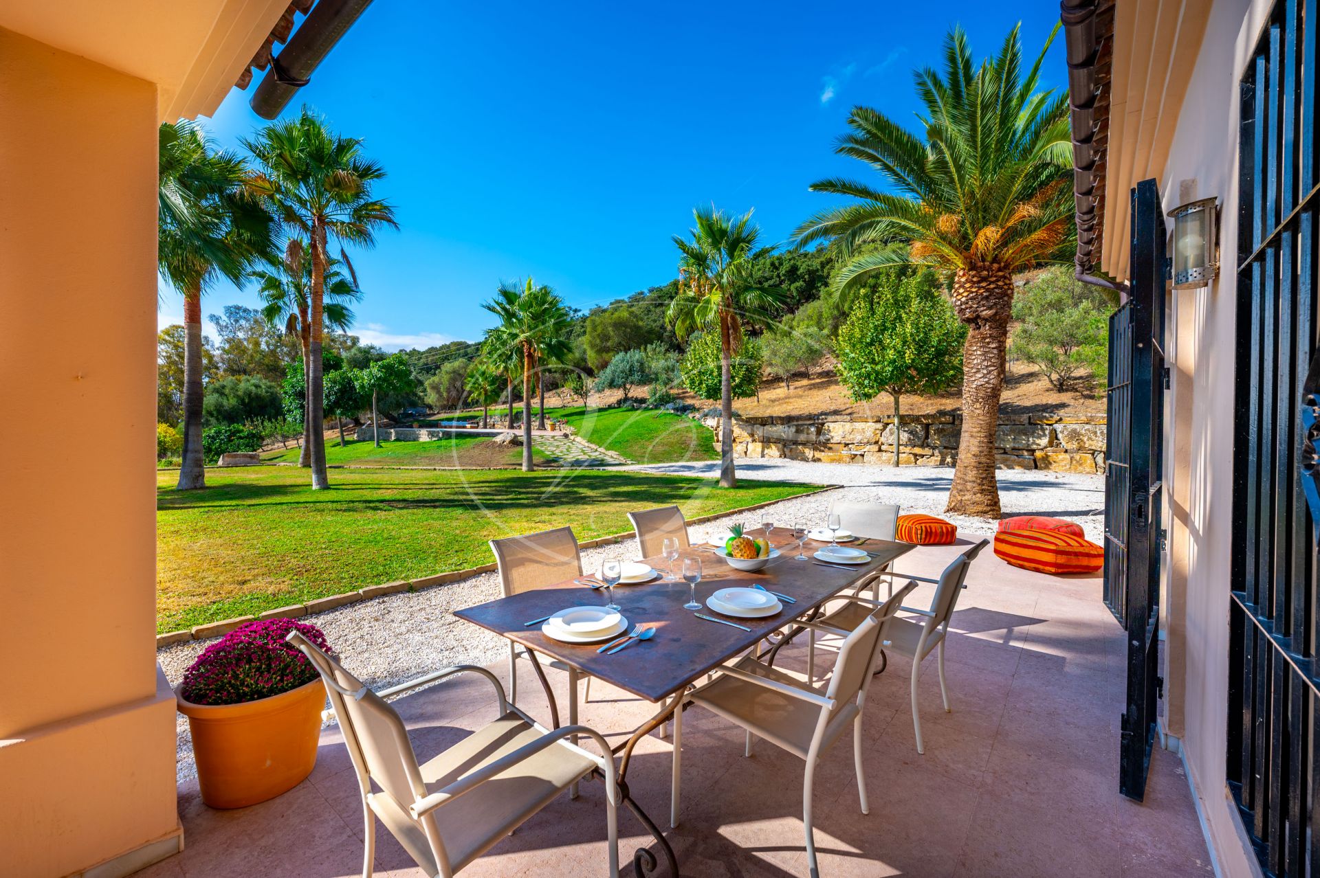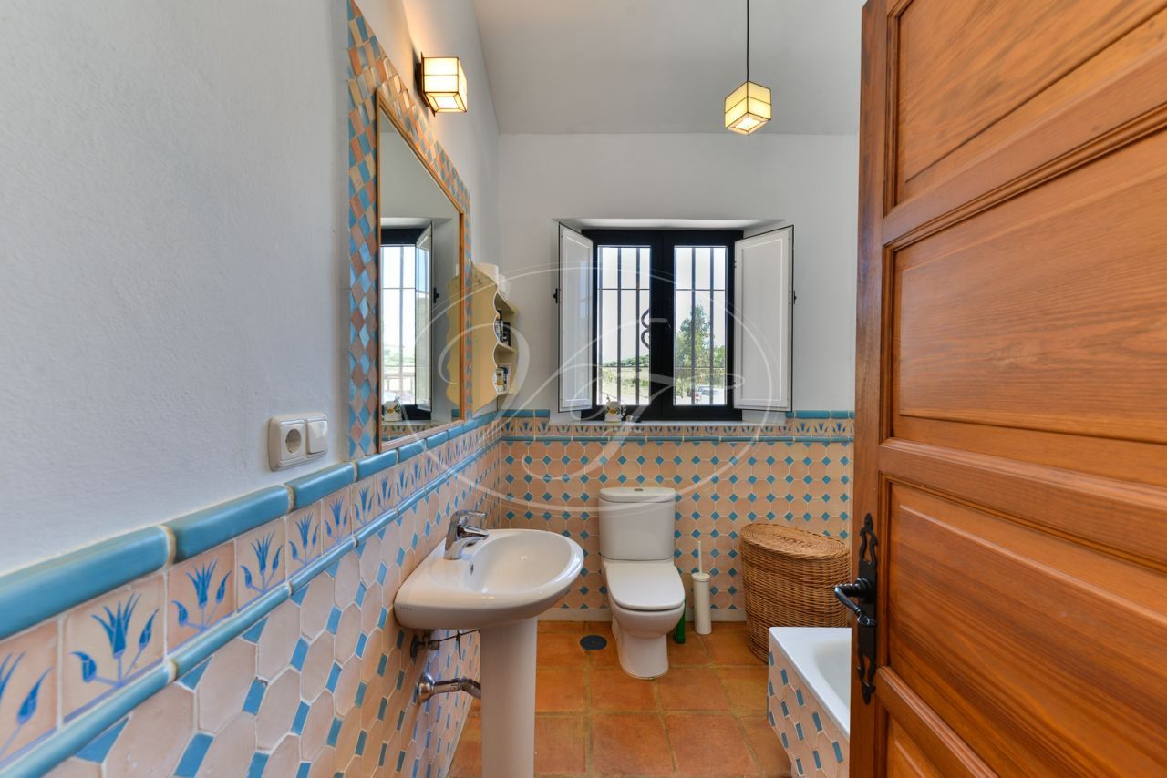 Unos escalones conducen a la entrada de esta impresionante casa de campo, diseñada por César de Leyva. Acabada con exquisitos detalles, como techos altos con vigas, puertas antiguas talladas a mano y herrajes del artista local Sebastián Fisher. Una puerta antigua de madera se abre al espacioso vestíbulo de entrada. Desde aquí, la casa se distribuye en diferentes zonas. En el ala izquierda del cortijo se encuentran las principales zonas de estar y el dormitorio privado. En el ala derecha, las suites de invitados. Todo ello construido alrededor de un precioso y auténtico patio andaluz con palmera y fuente. El lugar perfecto para relajarse.