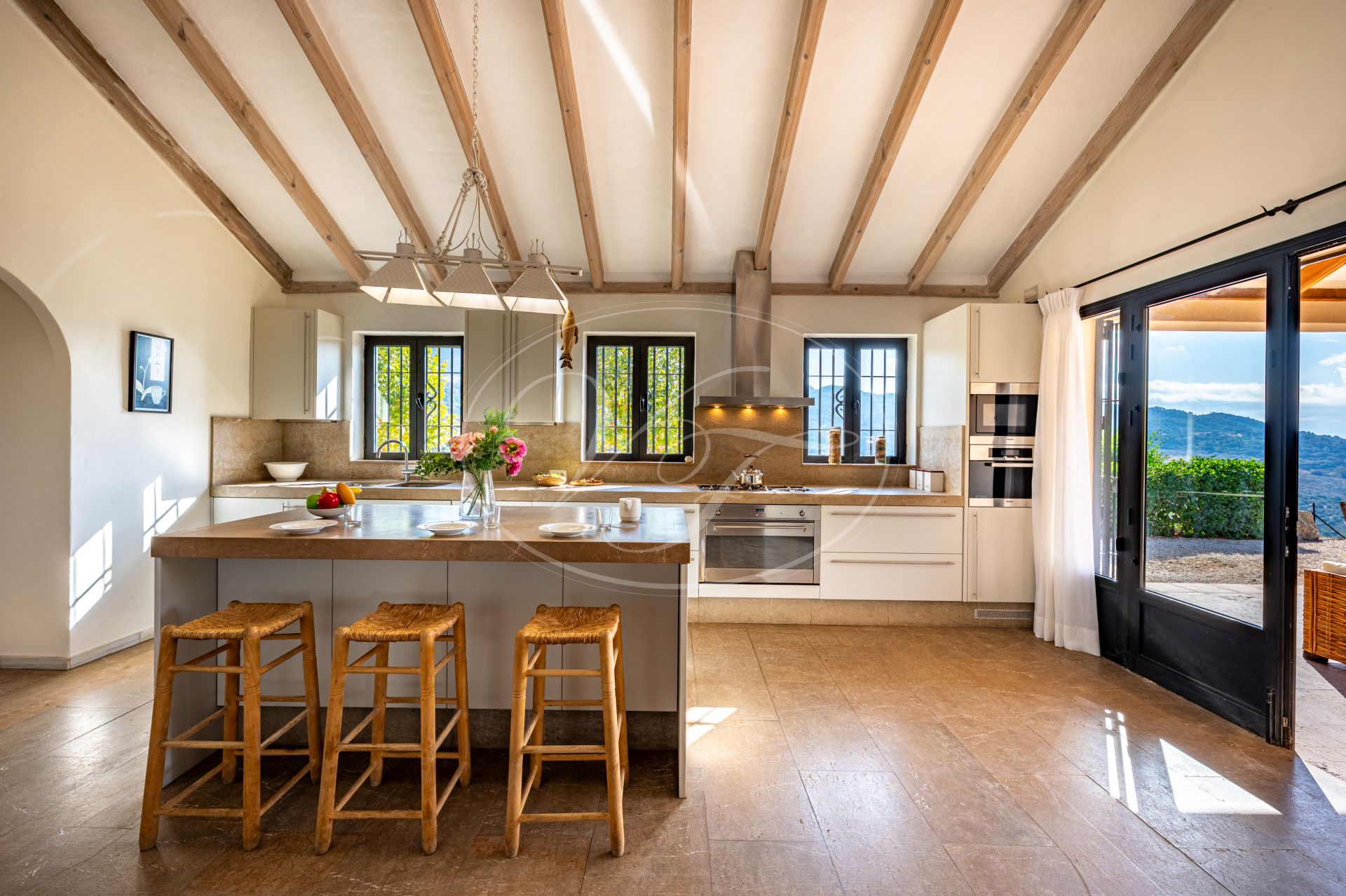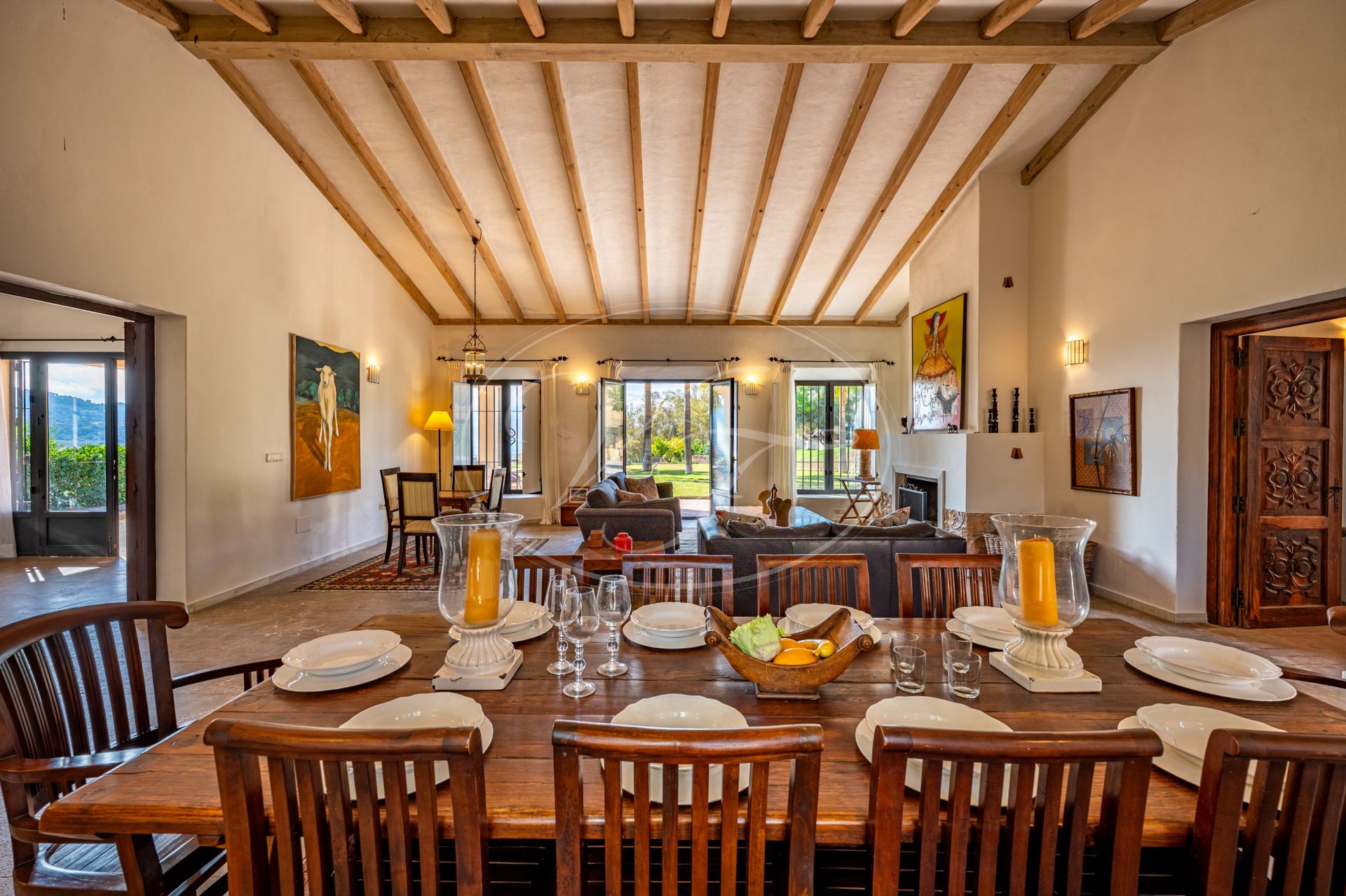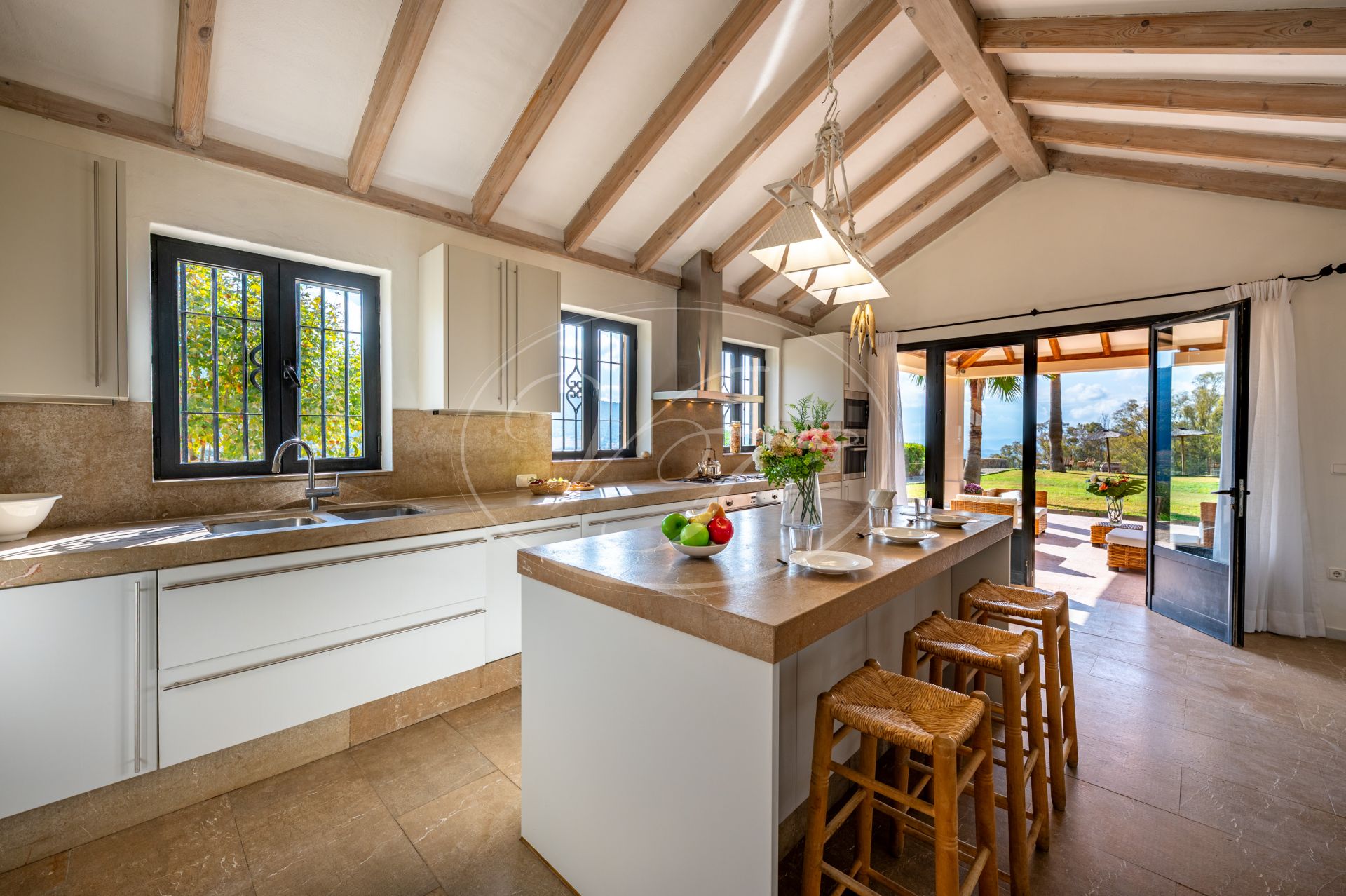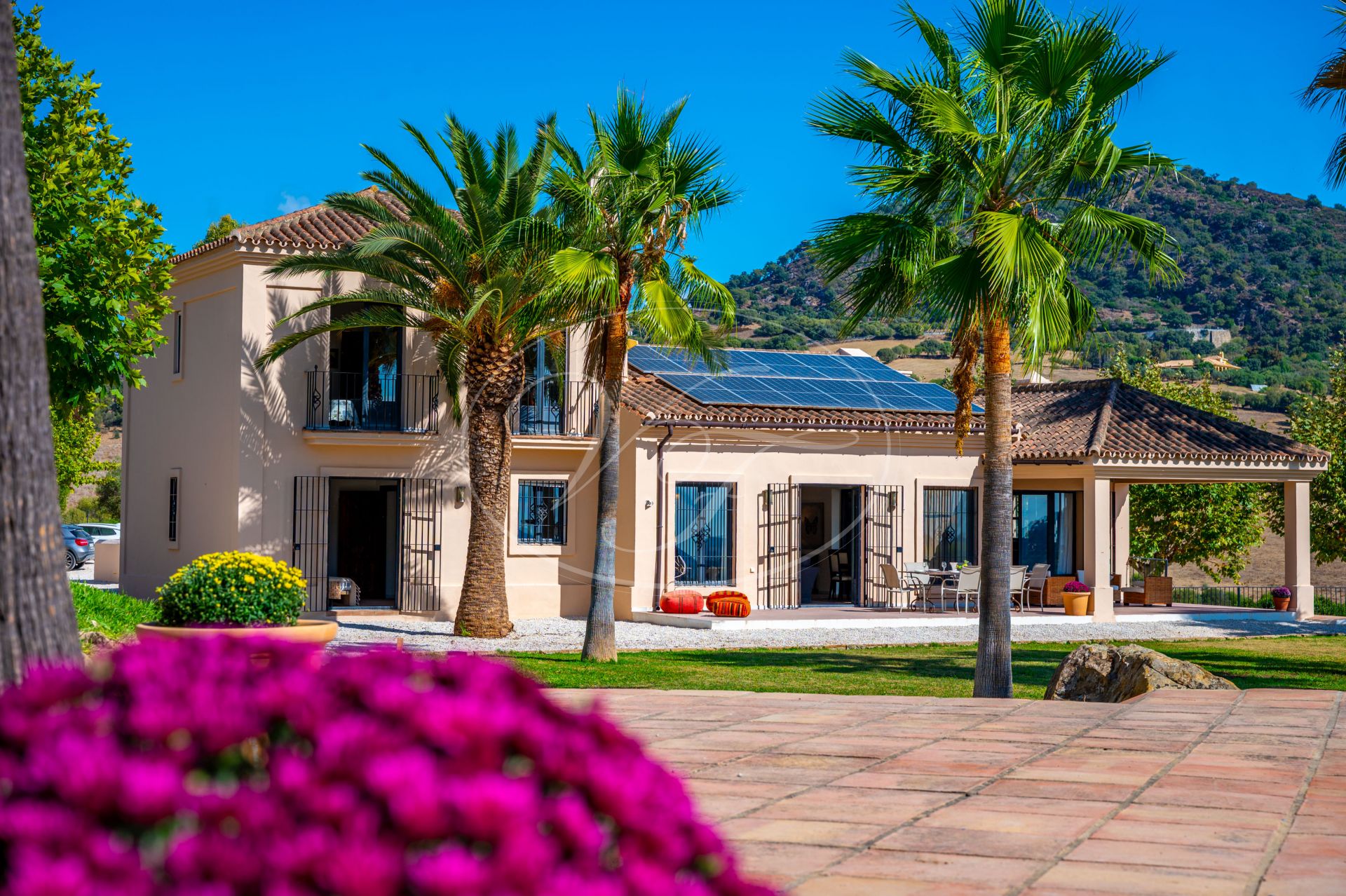 Unos escalones conducen a la entrada de esta impresionante casa de campo, diseñada por César de Leyva. Acabada con exquisitos detalles, como techos altos con vigas, puertas antiguas talladas a mano y herrajes del artista local Sebastián Fisher. Una puerta antigua de madera se abre al espacioso vestíbulo de entrada. Desde aquí, la casa se distribuye en diferentes zonas. En el ala izquierda del cortijo se encuentran las principales zonas de estar y el dormitorio privado. En el ala derecha, las suites de invitados. Todo ello construido alrededor de un precioso y auténtico patio andaluz con palmera y fuente. El lugar perfecto para relajarse.