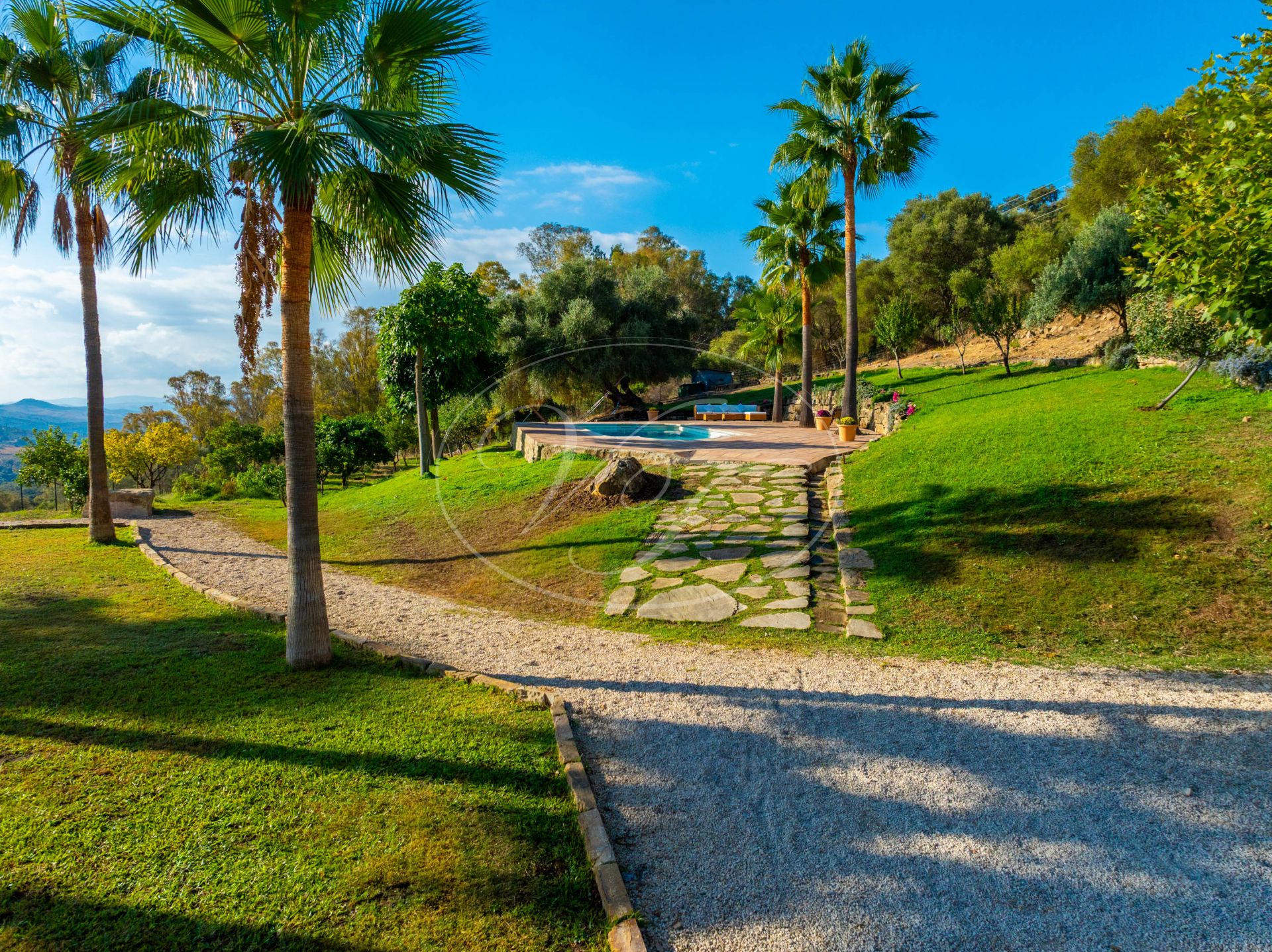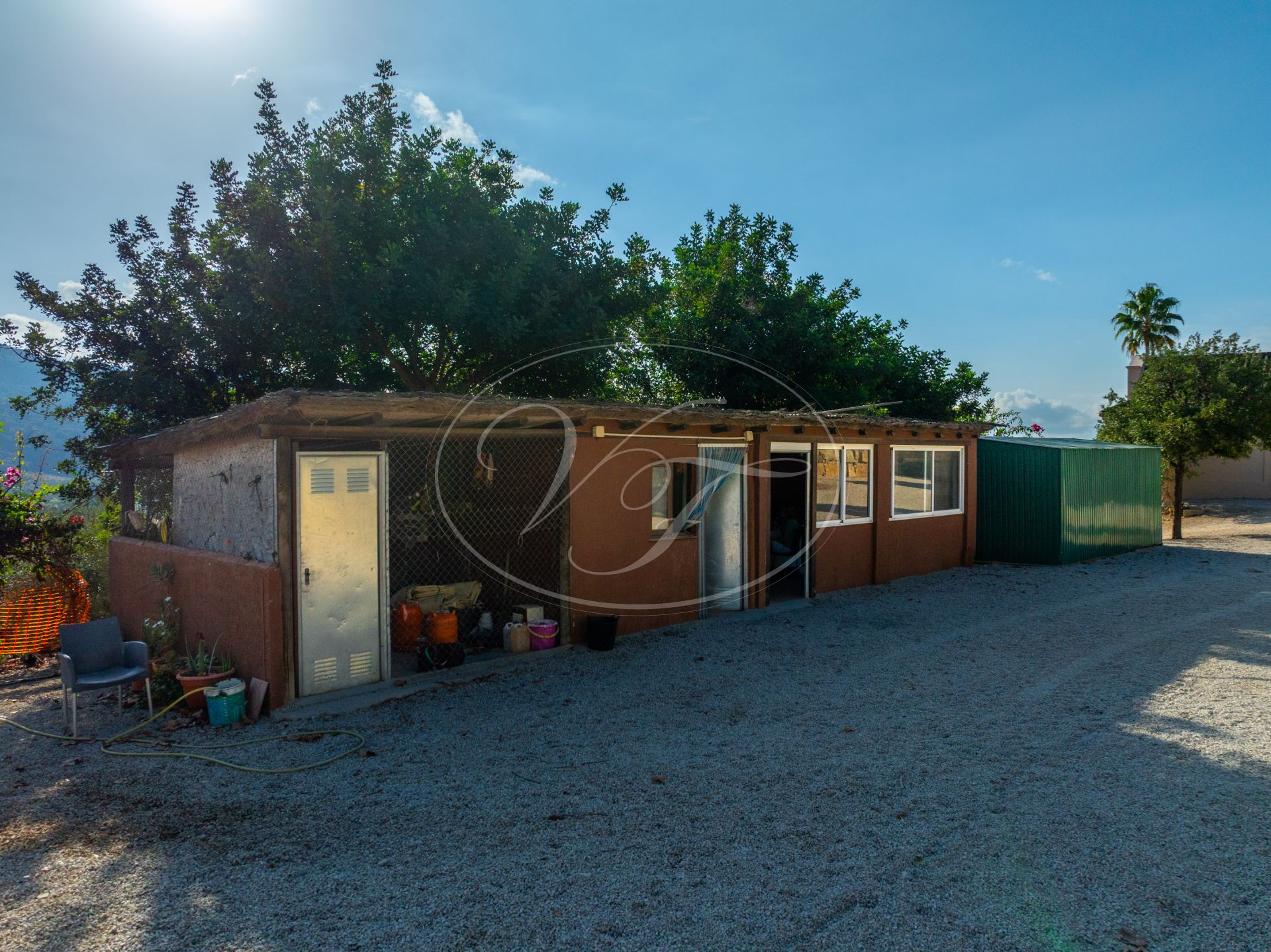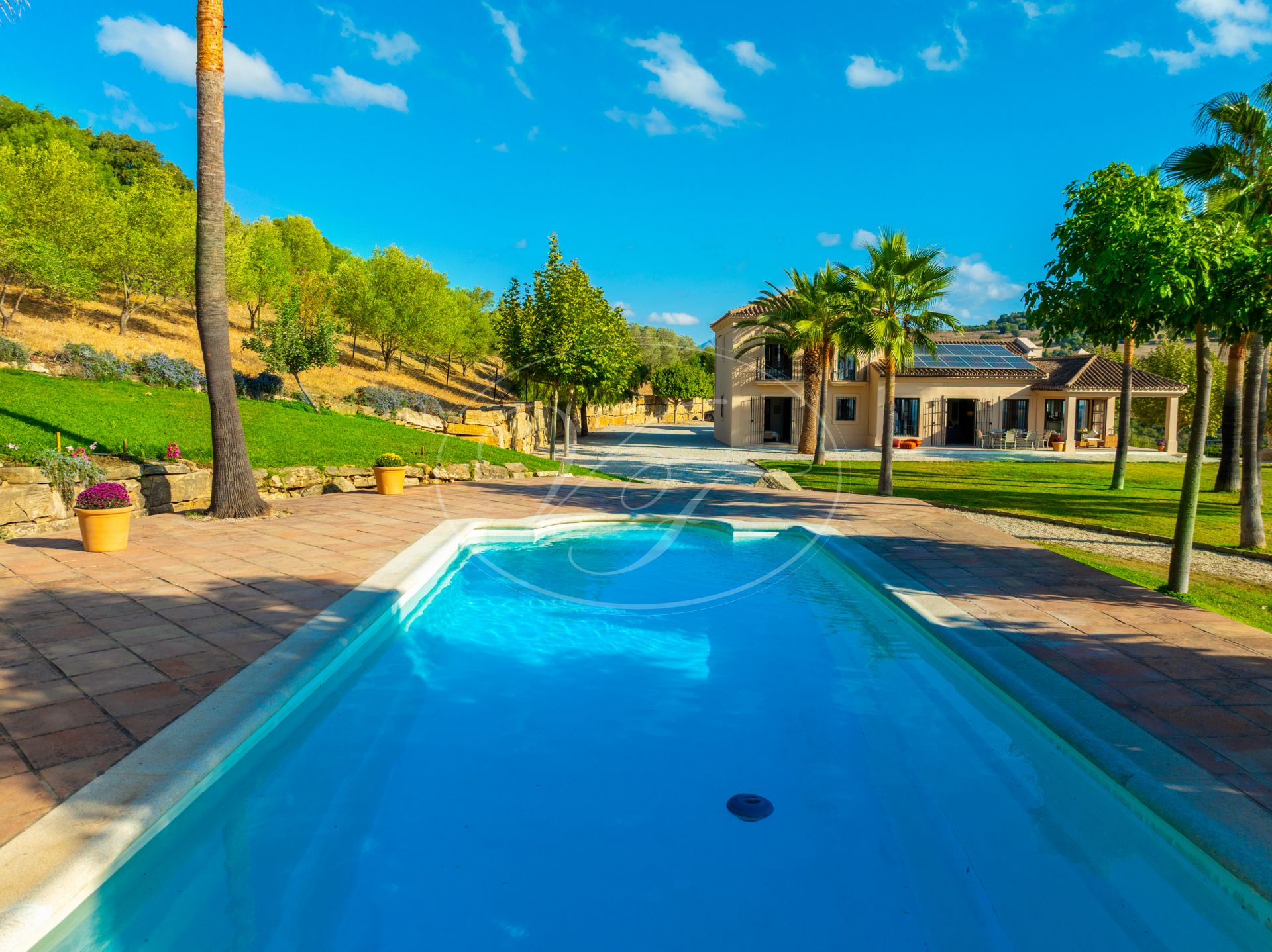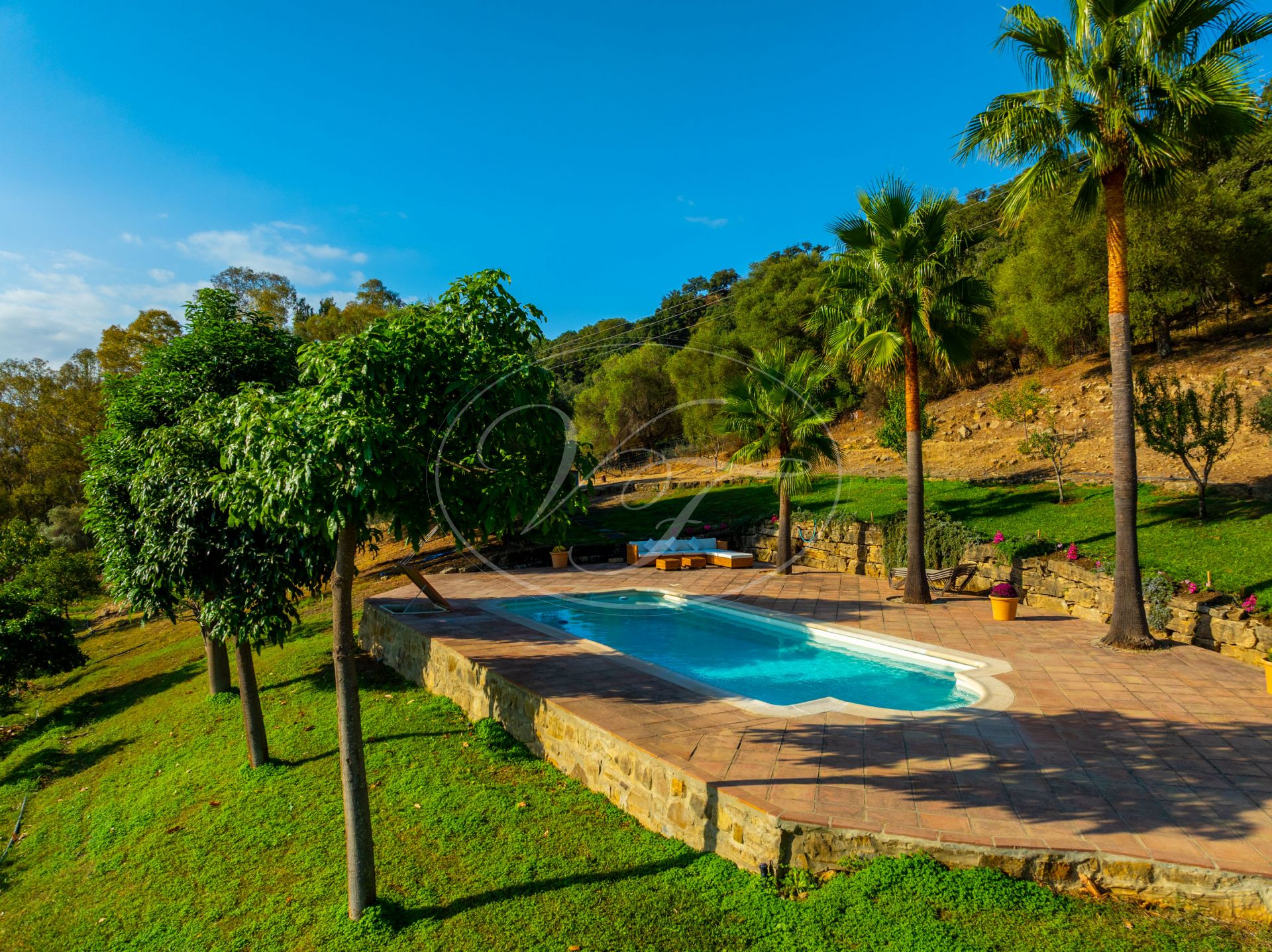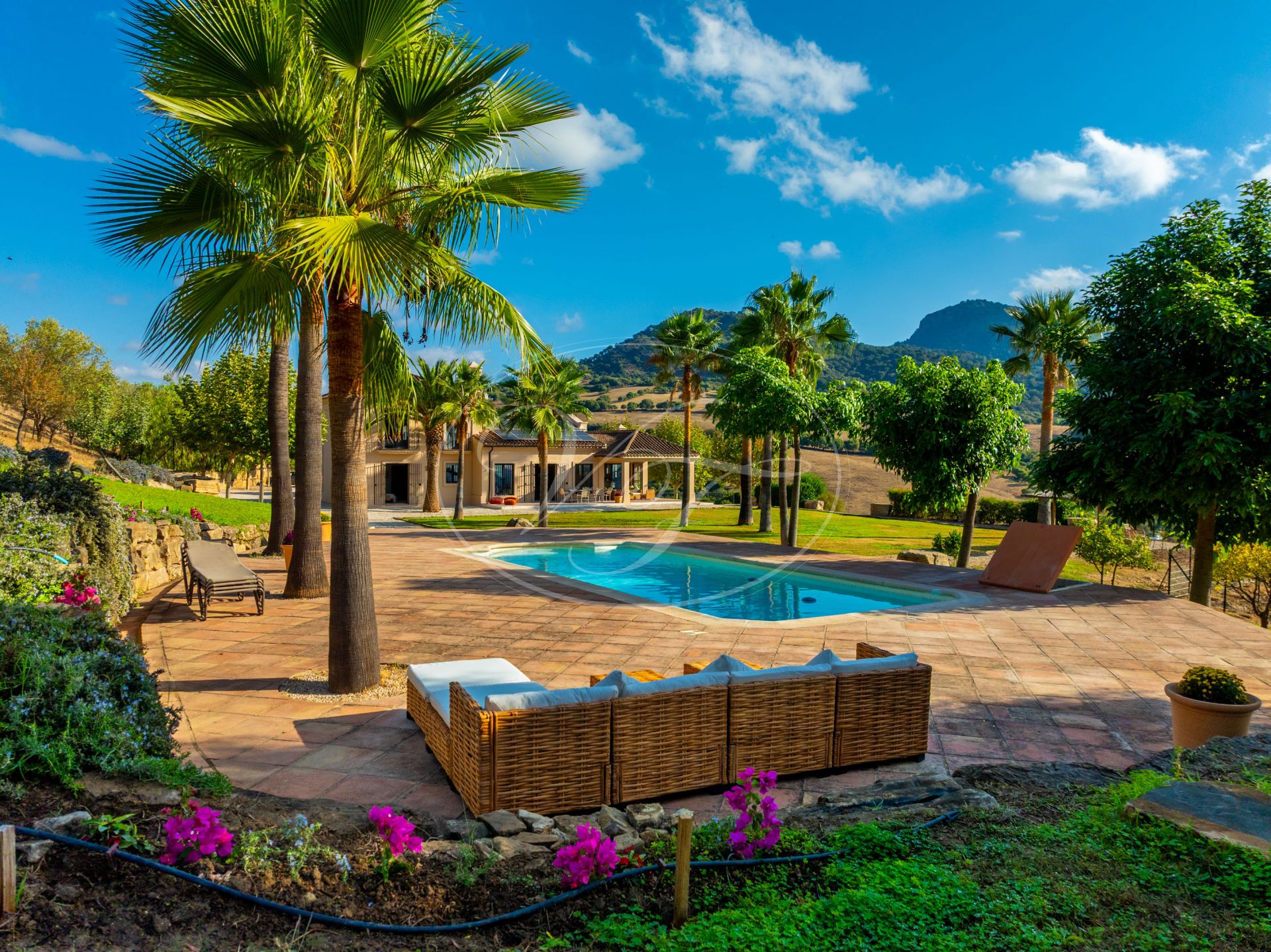 El jardín que rodea esta encantadora casa de campo de estilo cortijo es una auténtica delicia. Una amplia zona de césped llana, exuberantes palmeras, olivos maduros, abundantes árboles frutales y un huerto. La piscina cuenta con amplias zonas para tomar el sol y hermosos árboles que proporcionan sombra natural en verano. Las vistas desde cualquier punto de esta finca son espectaculares. Las colinas onduladas, el Parque de los Alcornocales en la distancia… Aquí estará rodeado de naturaleza, pero sin estar aislado. Actualmente también hay un prado para caballos en la parcela ‘superior’. Se ha creado una zona de descanso para contemplar el campo en buena compañía de sus caballos. En la parte trasera de la casa, junto al aparcamiento, hay un almacén con un gallinero. También en este lado sería posible crear un prado si desea tener sus caballos cerca.