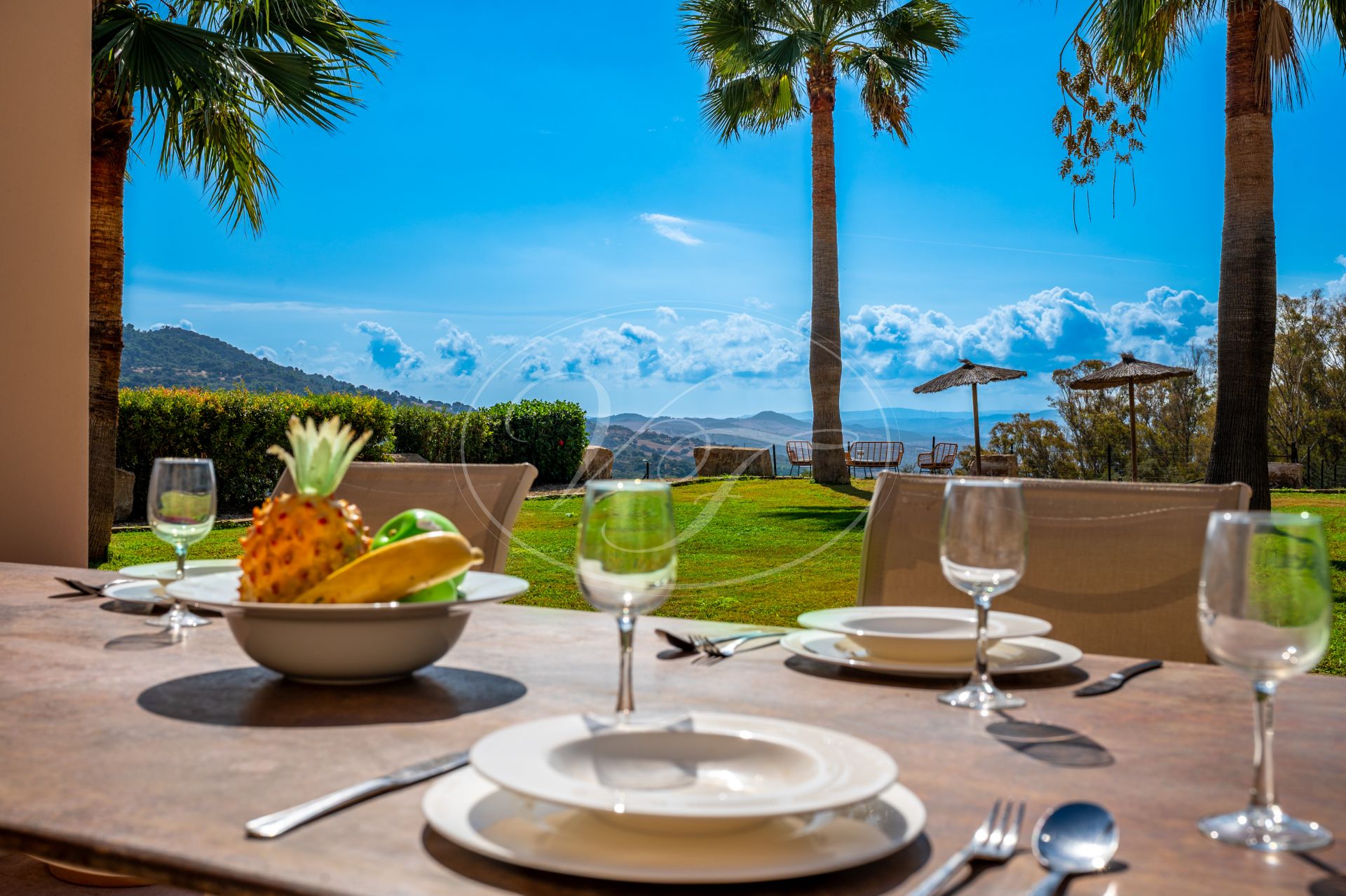Tanto la cocina como el salón se abren a las terrazas parcialmente cubiertas para descansar y comer al aire libre, o pasear por el jardín sobre su amplio y suave césped, hasta la espectacular zona de la piscina. El salón también se abre hacia el patio, donde es agradable pasar un rato de intimidad tanto en verano como en invierno. Desde el salón se puede acceder a un aseo de invitados y a dos suites privadas. Una en la planta baja y otra en la primera planta. Ambas con elegantes cuartos de baño privados y armarios empotrados. La suite de la planta baja tiene puertas acristaladas que dan al jardín. La suite de la primera planta tiene un balcón francés.