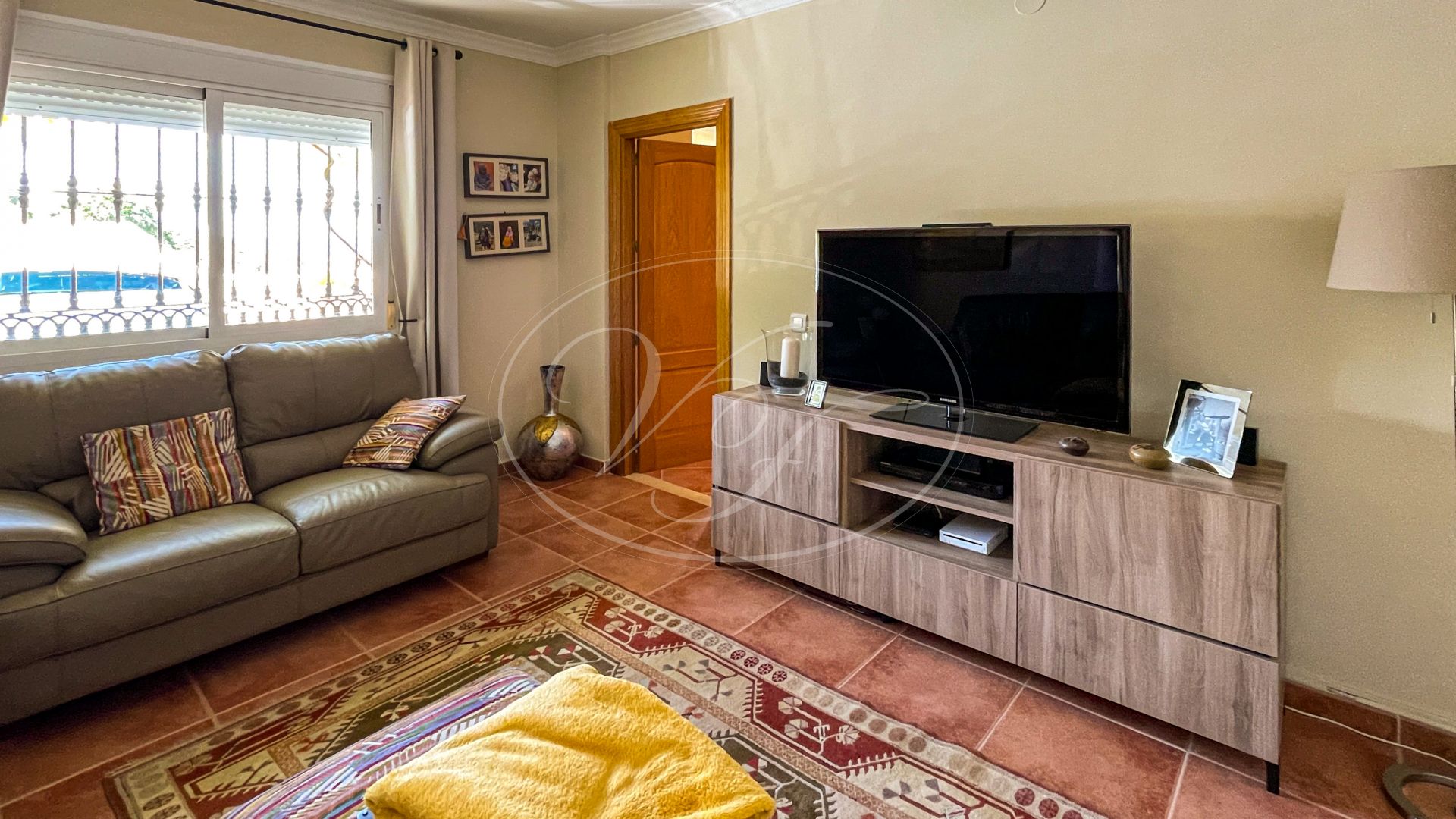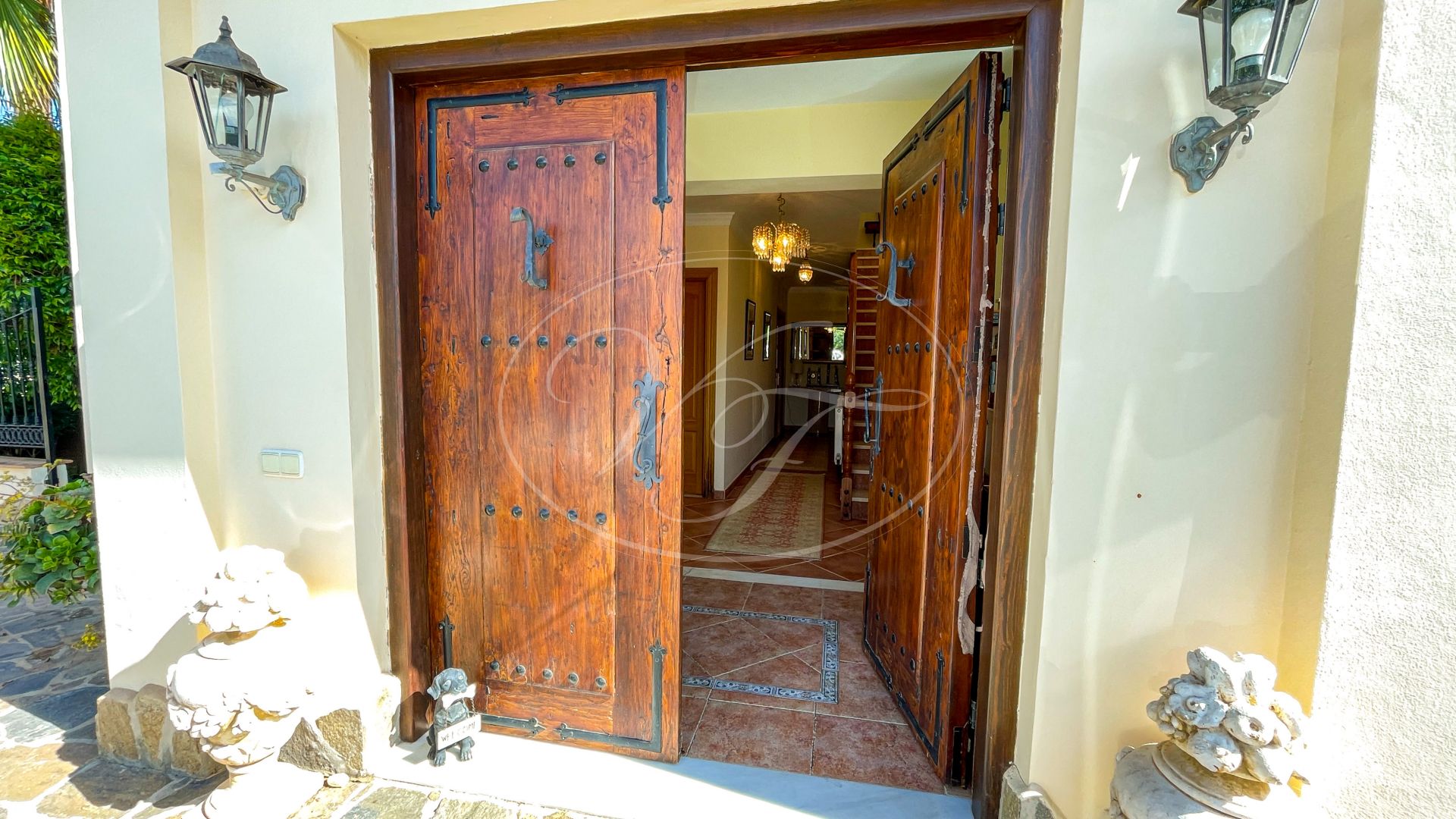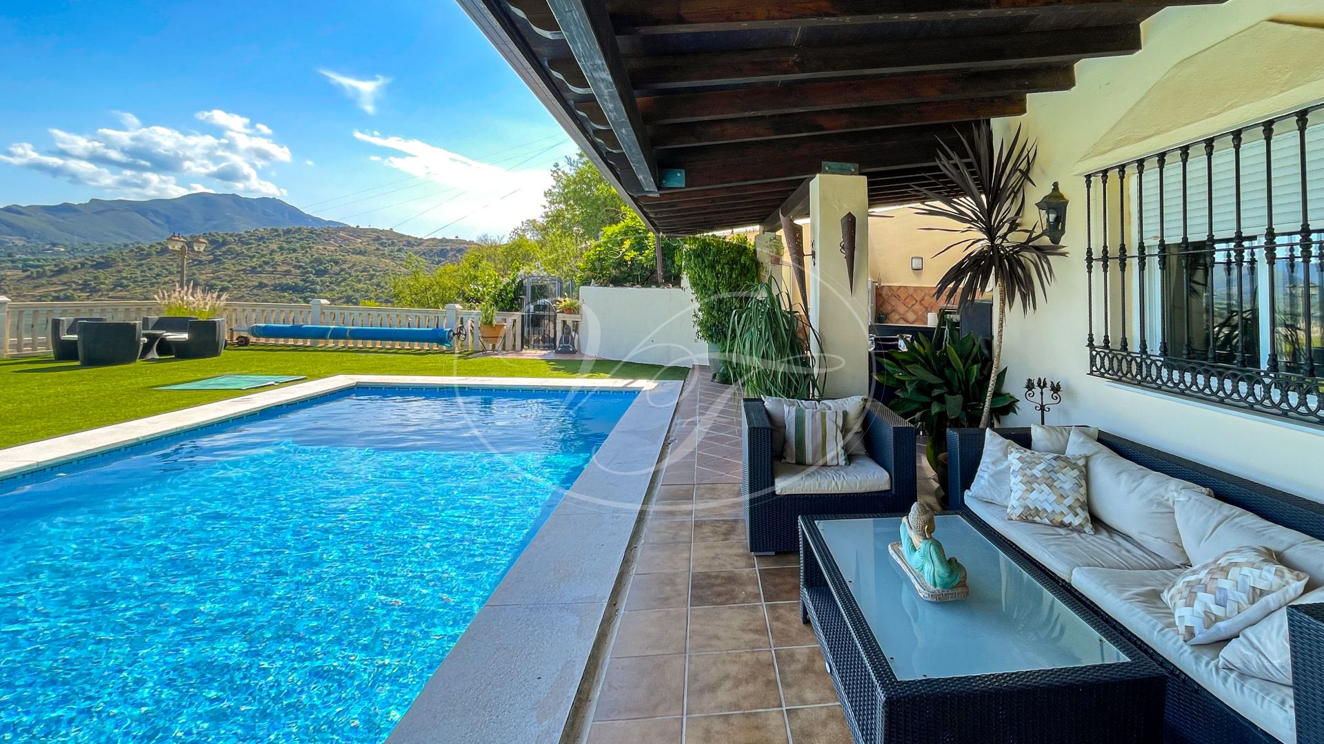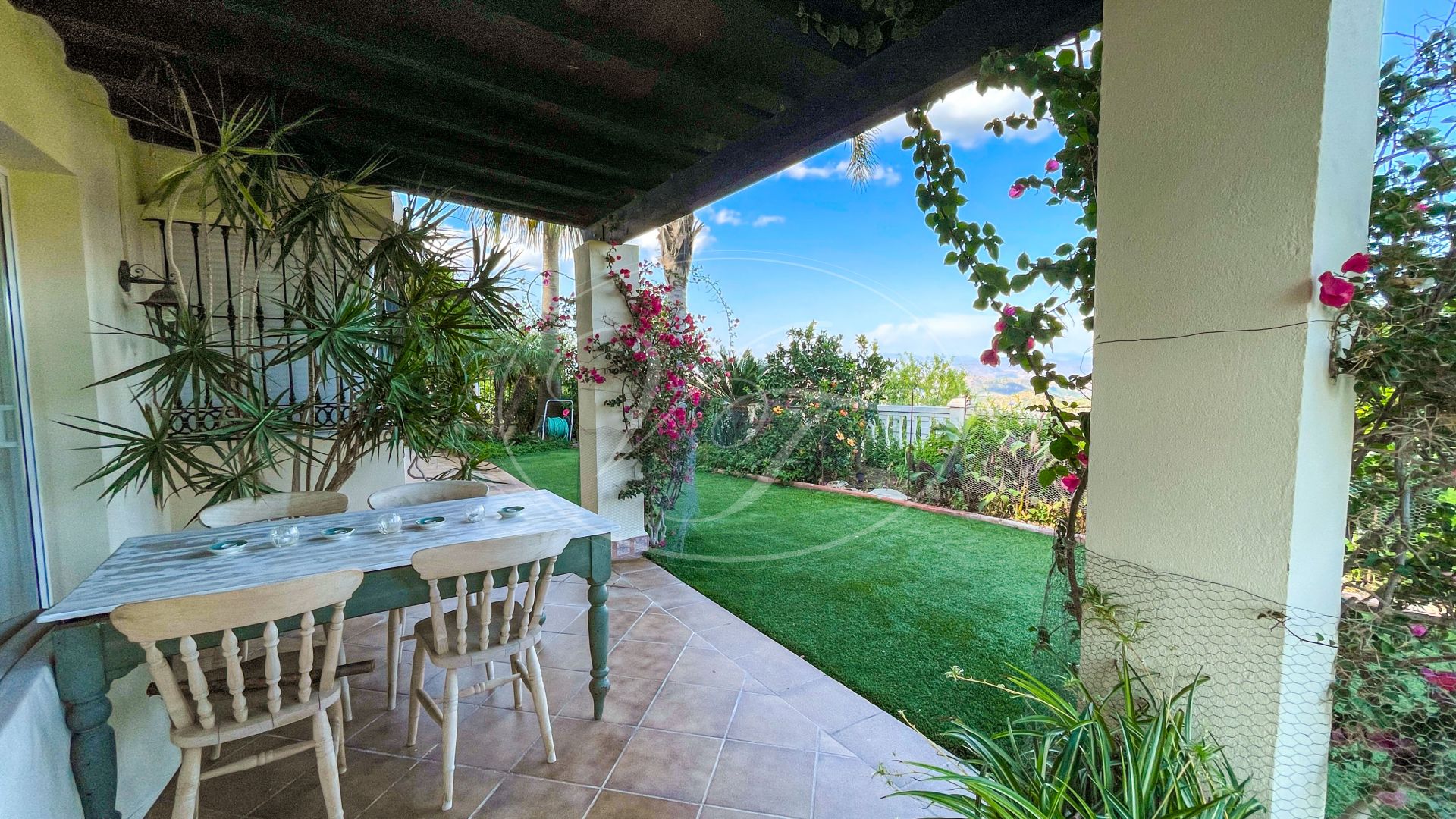 De hoofdingang van het huis met 6 slaapkamers is via een prachtige grote houten deur, die de toon zet voor een Andalusische landelijke sfeer. Het huis heeft 2 verdiepingen. De deur komt uit in de grote hal, die weer uitkomt in de ruime, comfortabele en lichte woon- en eetkamer, met open haard en airconditioning (warm/koud). De schuifdeuren (enkel glas) geven toegang tot het overdekte terras en het zwembad en de tuin. Het uitzicht hier is werkelijk adembenemend! Je kijkt uit over het pittoreske stadje Monda en haar kasteel. Verder zie je de omliggende bergen en op een heldere dag zelfs de zee! Het overdekte terras biedt meer dan genoeg ruimte om te loungen en buiten te eten en te drinken voor een echt Andalusisch gevoel.