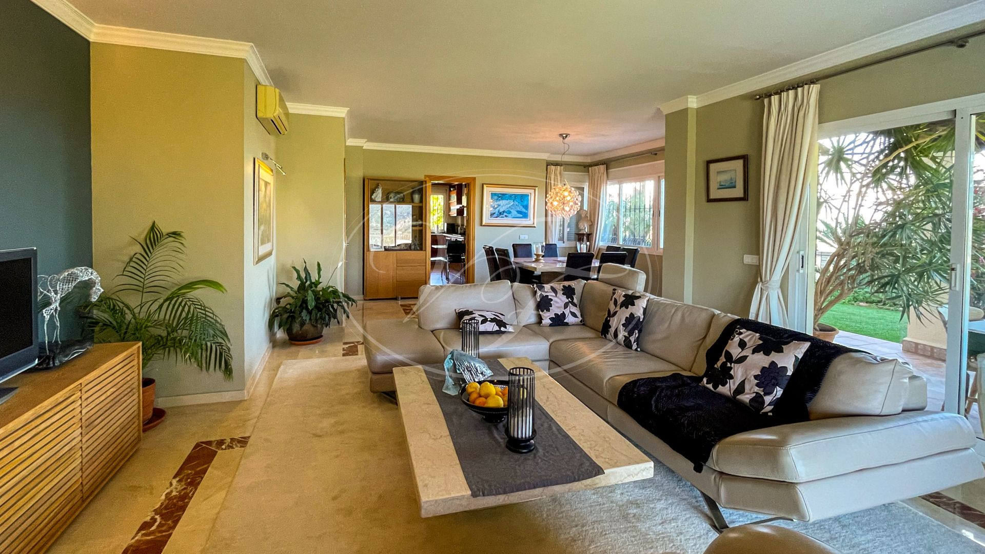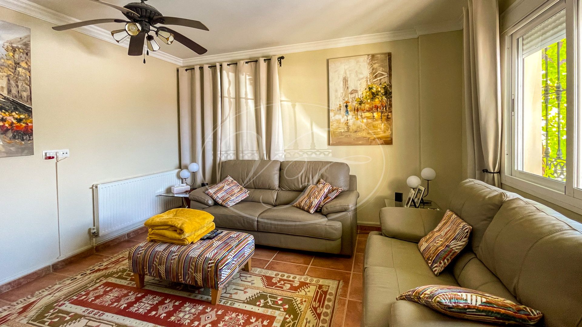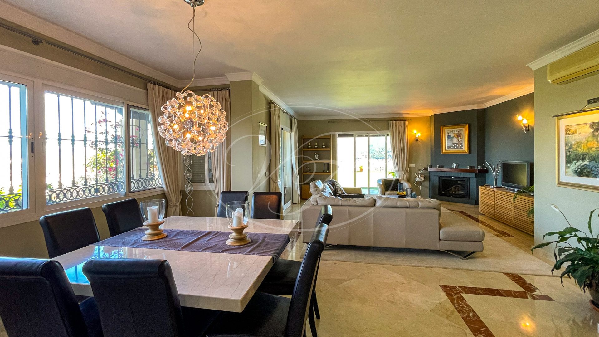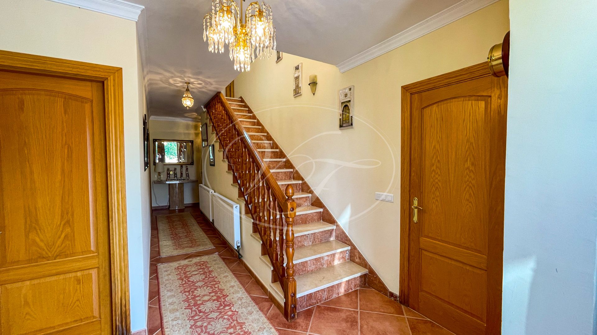 De hoofdingang van het huis met 6 slaapkamers is via een prachtige grote houten deur, die de toon zet voor een Andalusische landelijke sfeer. Het huis heeft 2 verdiepingen. De deur komt uit in de grote hal, die weer uitkomt in de ruime, comfortabele en lichte woon- en eetkamer, met open haard en airconditioning (warm/koud). De schuifdeuren (enkel glas) geven toegang tot het overdekte terras en het zwembad en de tuin. Het uitzicht hier is werkelijk adembenemend! Je kijkt uit over het pittoreske stadje Monda en haar kasteel. Verder zie je de omliggende bergen en op een heldere dag zelfs de zee! Het overdekte terras biedt meer dan genoeg ruimte om te loungen en buiten te eten en te drinken voor een echt Andalusisch gevoel.