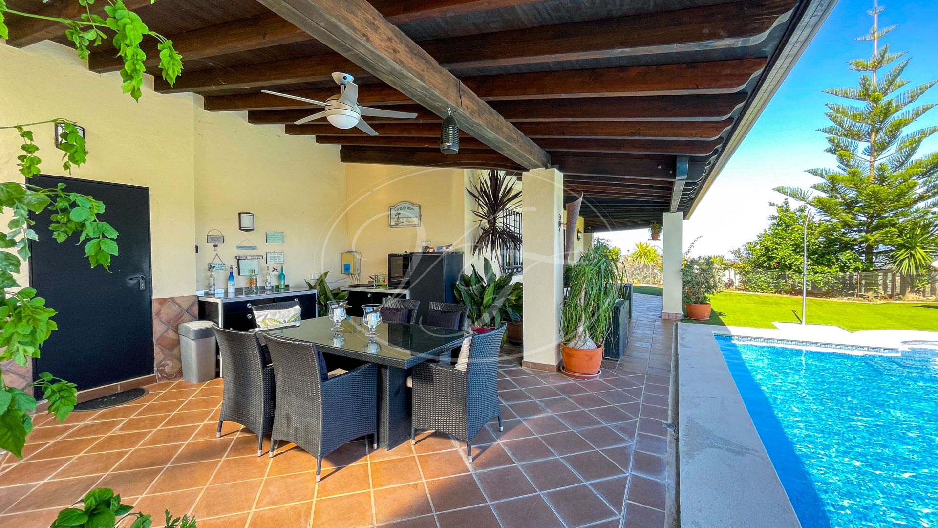 Dit prachtige landhuis is te koop in de buurt van Marbella en heeft terrassen rondom het hele pand, waardoor er meer dan genoeg ruimte is om te ontspannen en te genieten van het luxe leven op het platteland. Op het terras aan de voorzijde ligt het grote zwembad (chloor, niet verwarmd) met een uitgestrekt kunstgrasveld, wat de perfecte omgeving creëert. Er is een buitenterras, verbonden met een achterdeur op de begane grond, voor extra opslagruimte en de barbecueplaats.