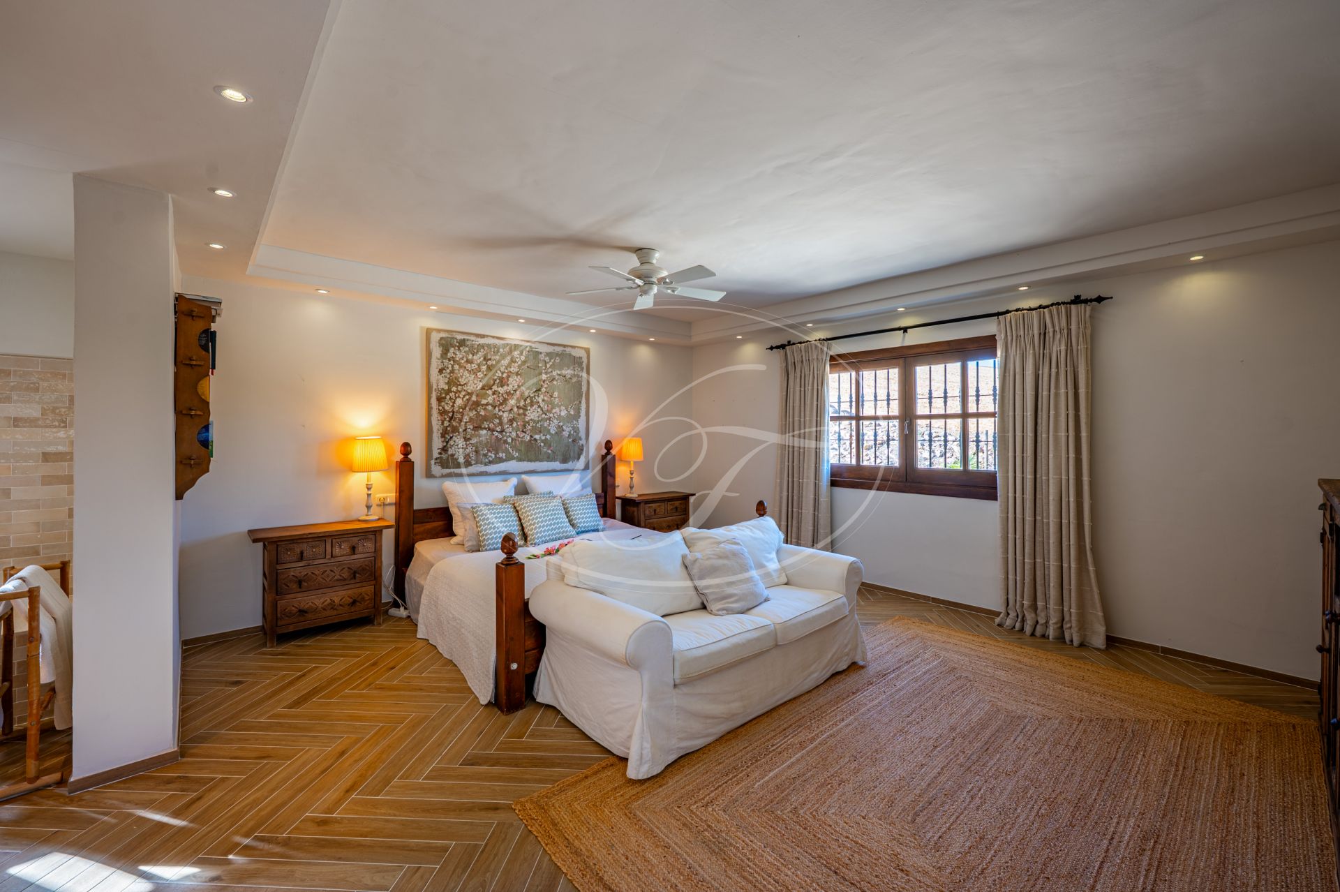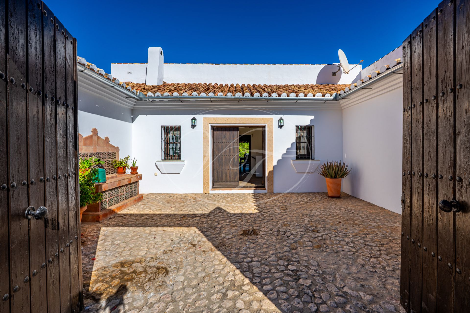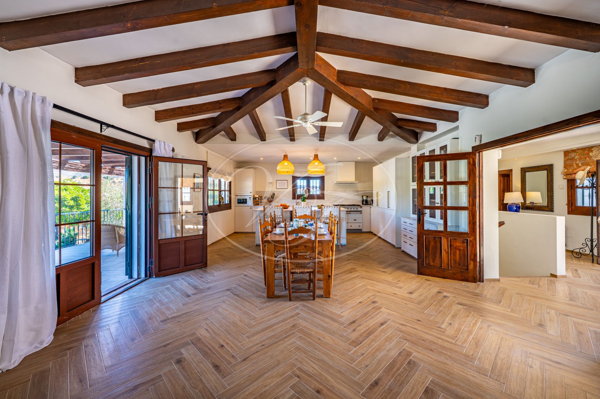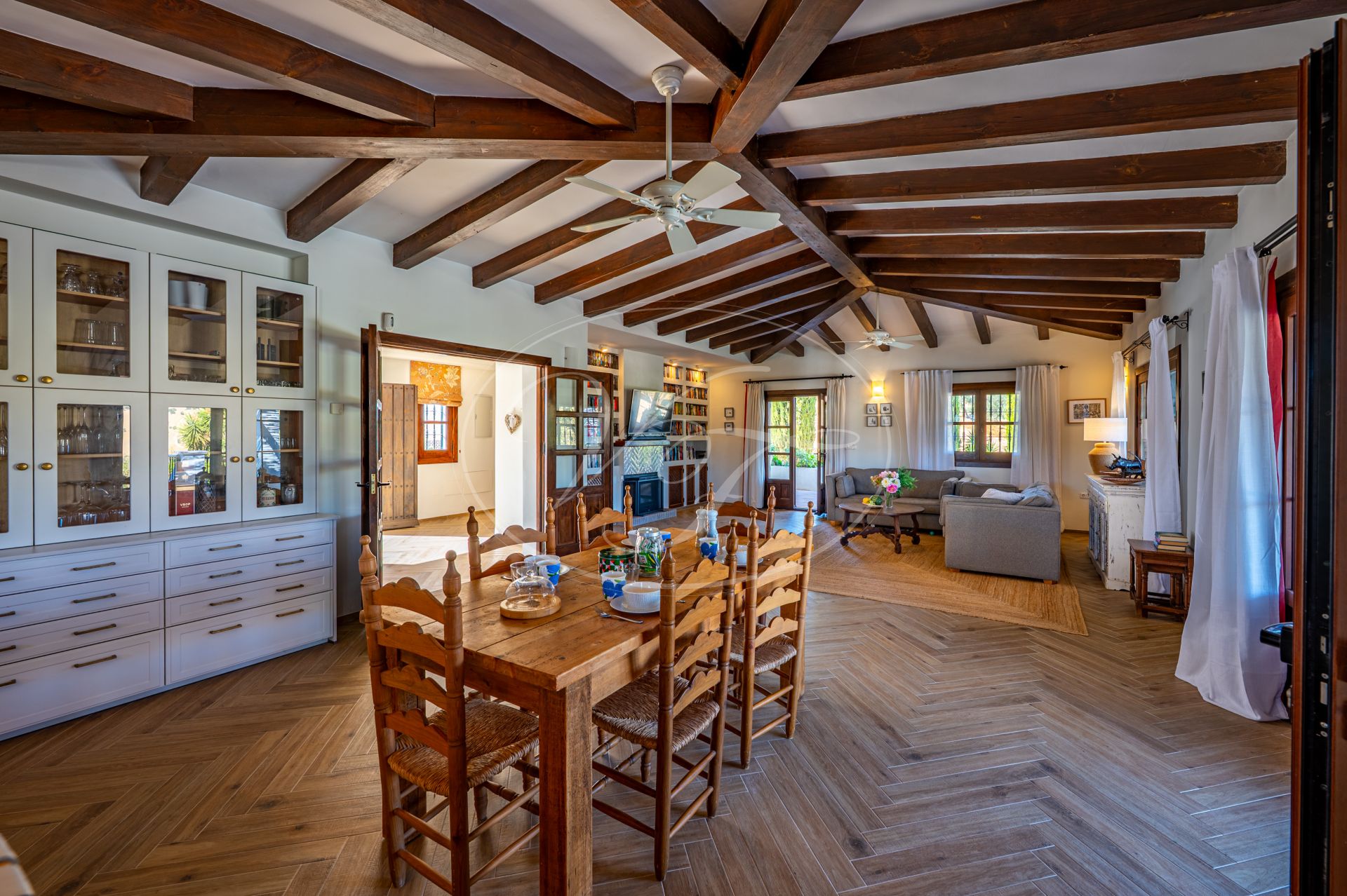 Een korte gravelweg kruist een riviertje en leidt naar de toegangspoort. Er is voldoende parkeergelegenheid rondom het huis. Houten deuren openen naar een prachtige binnenplaats met fontein, vanwaar men toegang heeft tot de finca. Alle accommodatie bevindt zich op één verdieping. Een hal geeft toegang tot een zeer ruime open keuken, eetkamer en woonkamer met een hoog balkenplafond. Terrasdeuren openen naar een overdekt terras aan de zijkant, dat kan worden afgesloten met glasgordijnen. Er is ook een ruim overdekt terras aan de voorkant. Binnen en buiten leven versmelten ihier. U kunt zich voorstellen dat u zowel in de zomer als in de winter op een van de terrassen kunt relaxen of dineren, genietend van het spectaculaire uitzicht over de velden en de bergen in de verte.