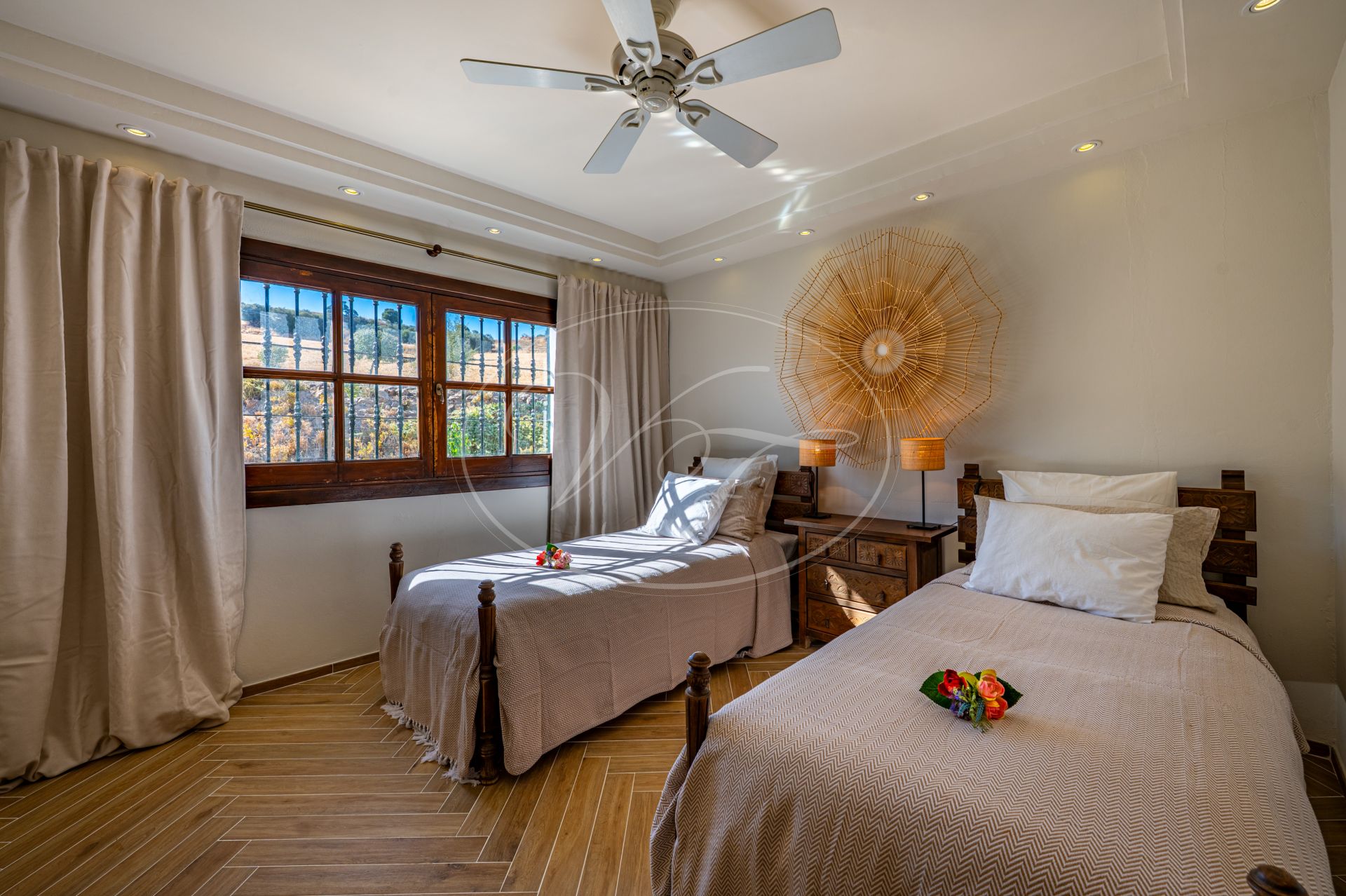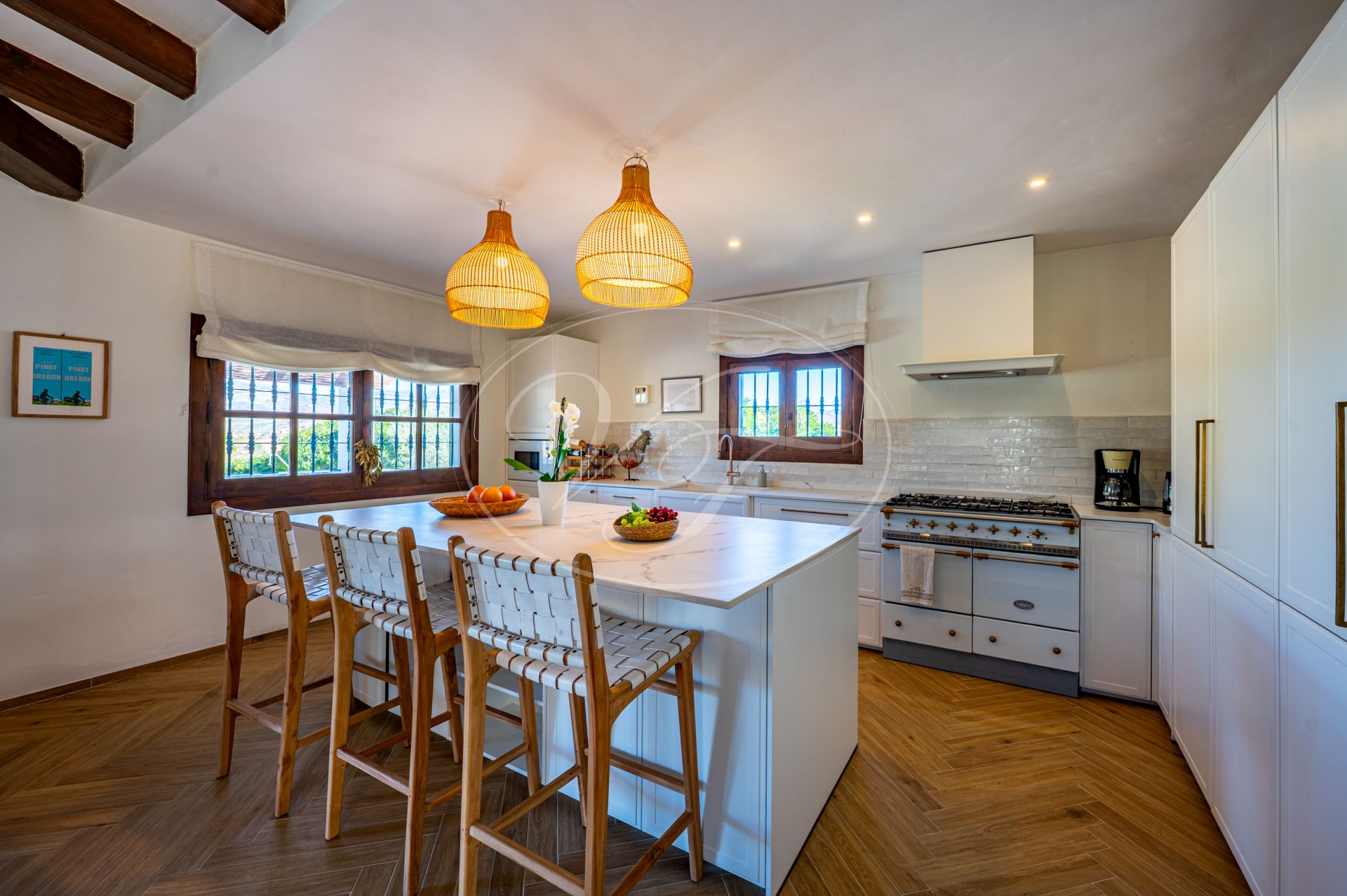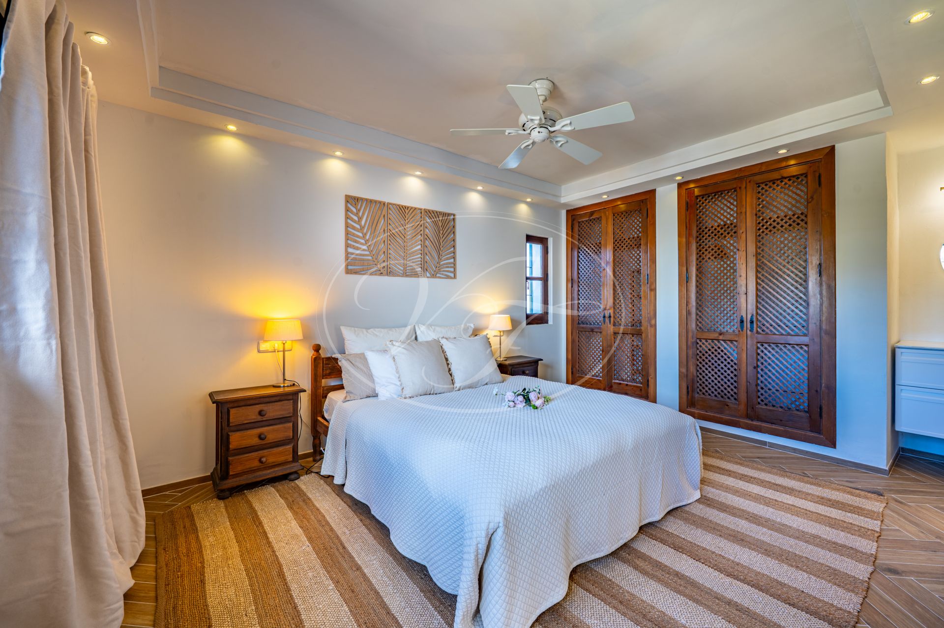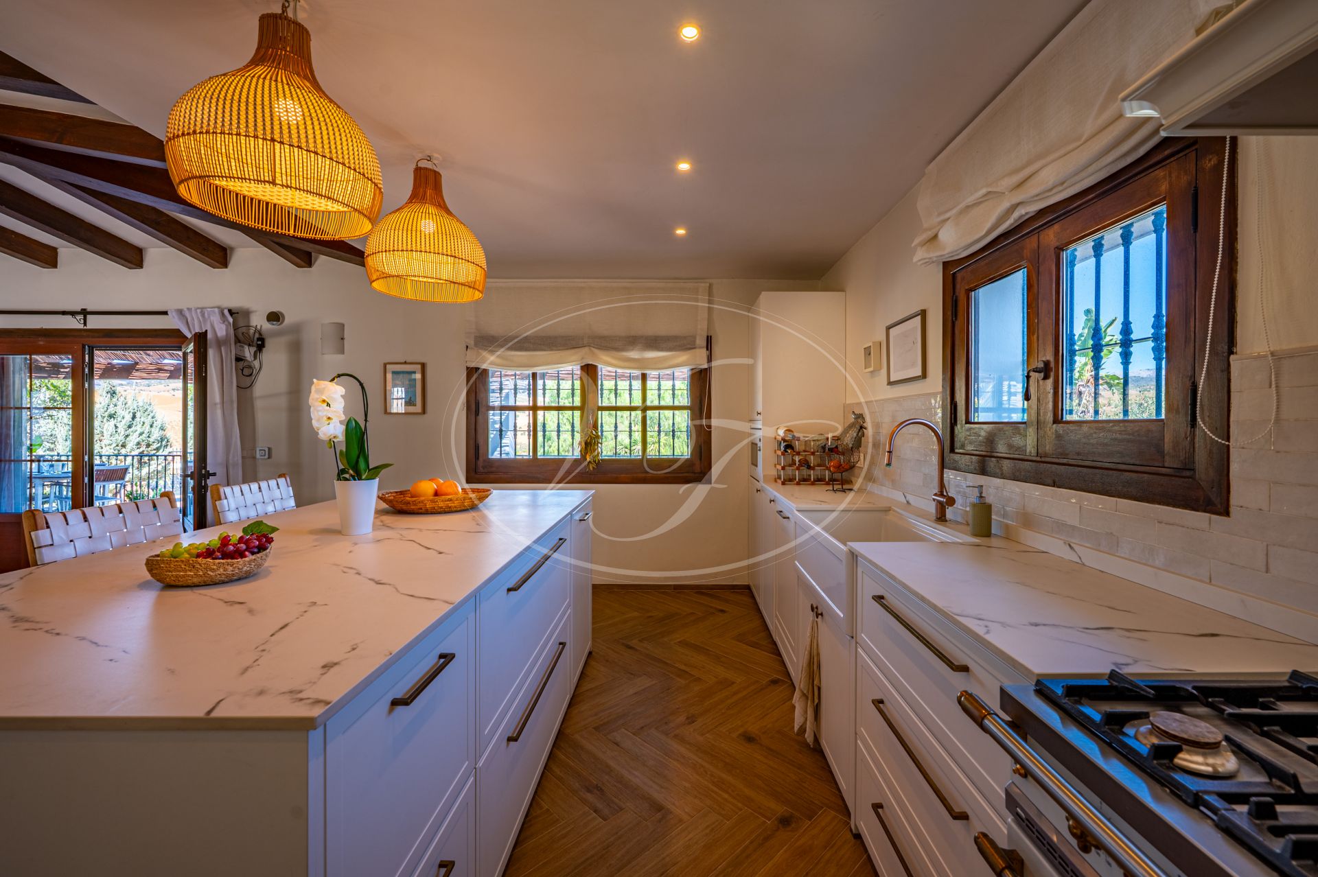 Een korte gravelweg kruist een riviertje en leidt naar de toegangspoort. Er is voldoende parkeergelegenheid rondom het huis. Houten deuren openen naar een prachtige binnenplaats met fontein, vanwaar men toegang heeft tot de finca. Alle accommodatie bevindt zich op één verdieping. Een hal geeft toegang tot een zeer ruime open keuken, eetkamer en woonkamer met een hoog balkenplafond. Terrasdeuren openen naar een overdekt terras aan de zijkant, dat kan worden afgesloten met glasgordijnen. Er is ook een ruim overdekt terras aan de voorkant. Binnen en buiten leven versmelten ihier. U kunt zich voorstellen dat u zowel in de zomer als in de winter op een van de terrassen kunt relaxen of dineren, genietend van het spectaculaire uitzicht over de velden en de bergen in de verte.