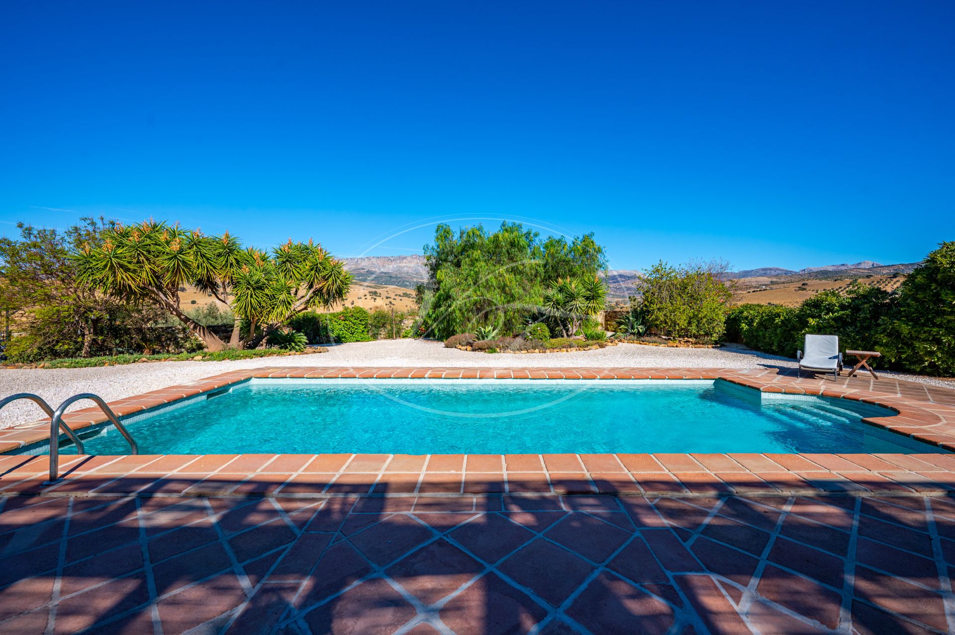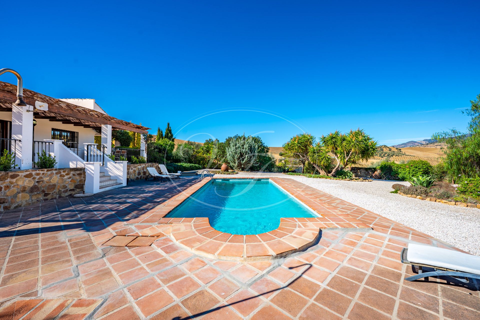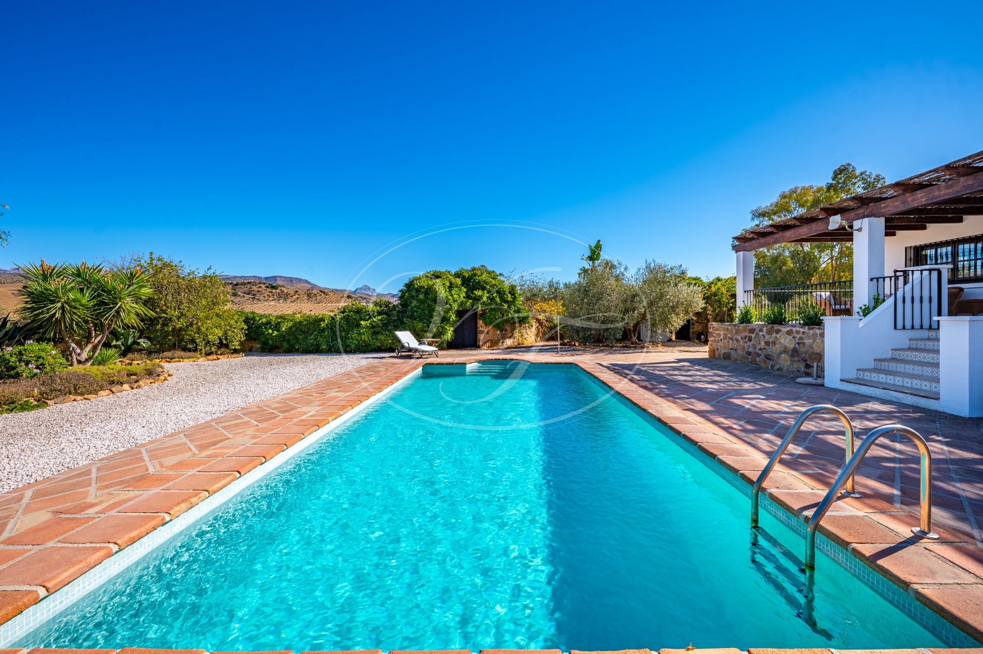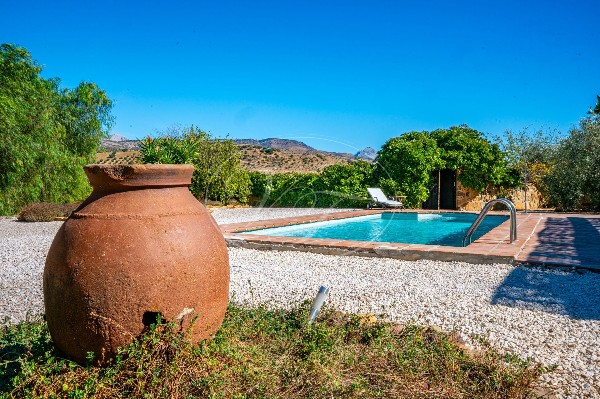 Vanaf de terrassen leidt een trap naar de tuin en het zoutwaterzwembad. Rondom het zwembad is voldoende ruimte om te zonnebaden. De tuin en het grondstuk van deze finca maken dit spectaculaire landhuis uniek. Direct rondom het huis zijn de tuin en het zwembad aangelegd met veel bloembedden. Een boog geeft toegang tot een geplaveide ronde cirkel, een ‘era’. Dit is een oude dorsvloer, waar het graan werd uitgespreid voor de wind, of waar ezels rond werden gedreven, om het eetbare deel van de stengels te scheiden. Een stukje Andalusische landbouwgeschiedenis bewaard op deze prachtige finca! Vanaf hier komt u in de minder formele tuin met fruitbomen zoals moerbeibomen, wijnstokken, citrusbomen en vijgenbomen. Verder heeft de finca een eigen kleine olijf- en amandelboomgaard. Er zijn ongeveer 250-300 olijfbomen, van de variëteiten Hojiblanca en Manzanilla. Afhankelijk van de opbrengst houdt de huidige eigenaar de olie of verkoopt hij deze aan de coöperatie.Achter het huis ligt ook een akker die jaarlijks met tarwe wordt ingezaaid. Deze wordt volledig onderhouden en geoogst door een lokale boer.