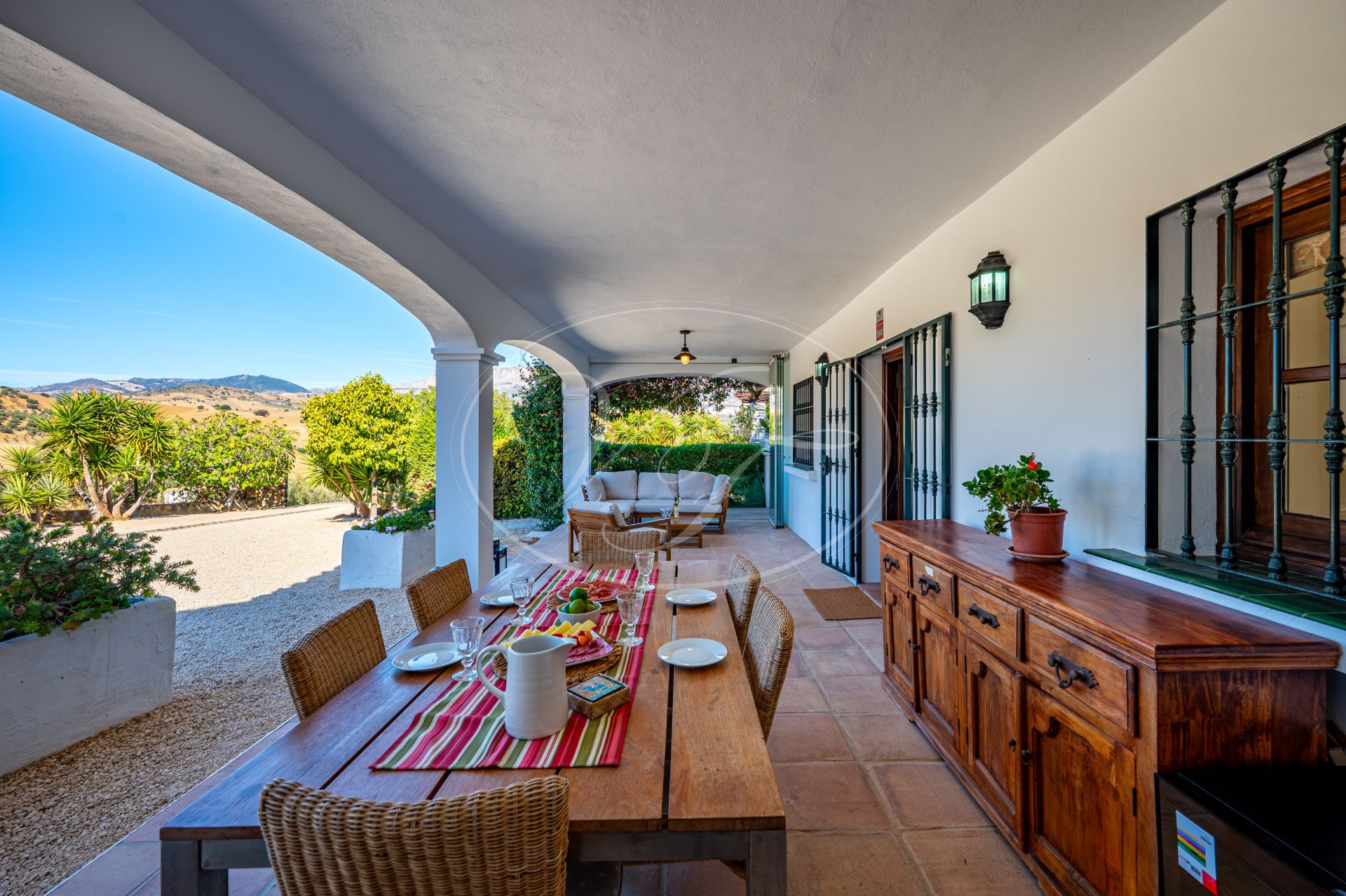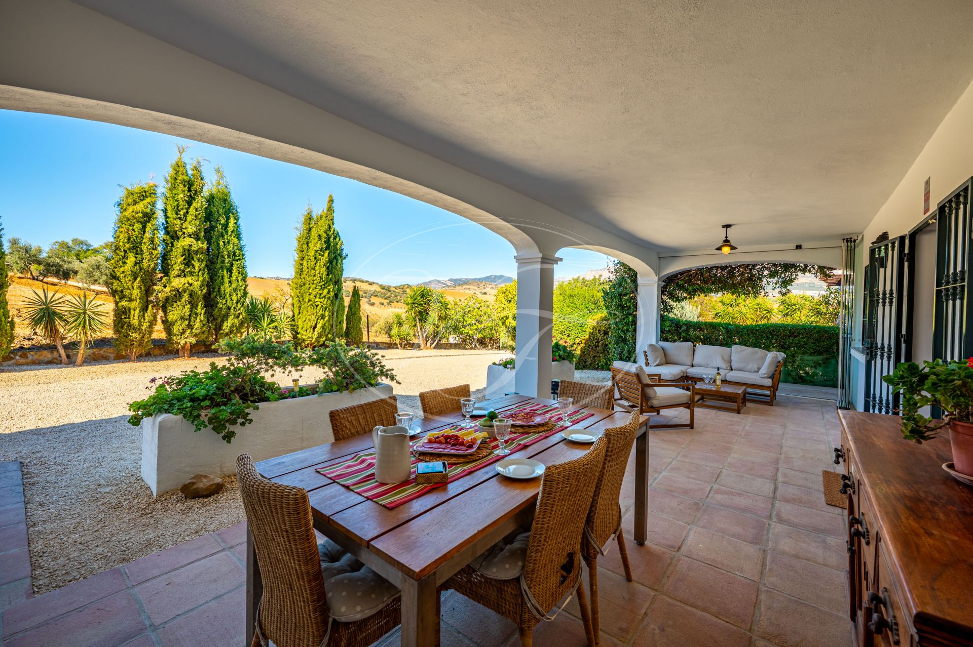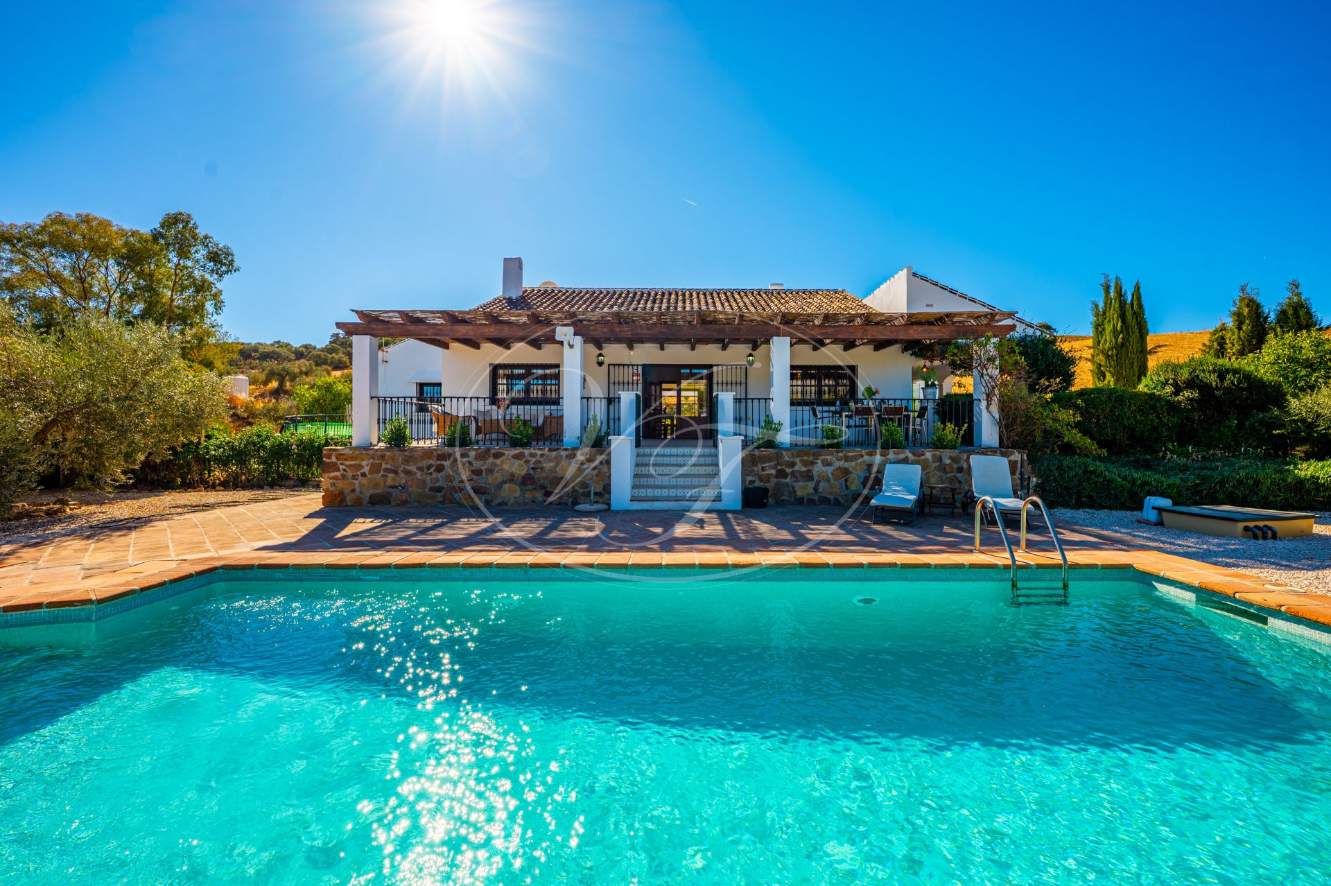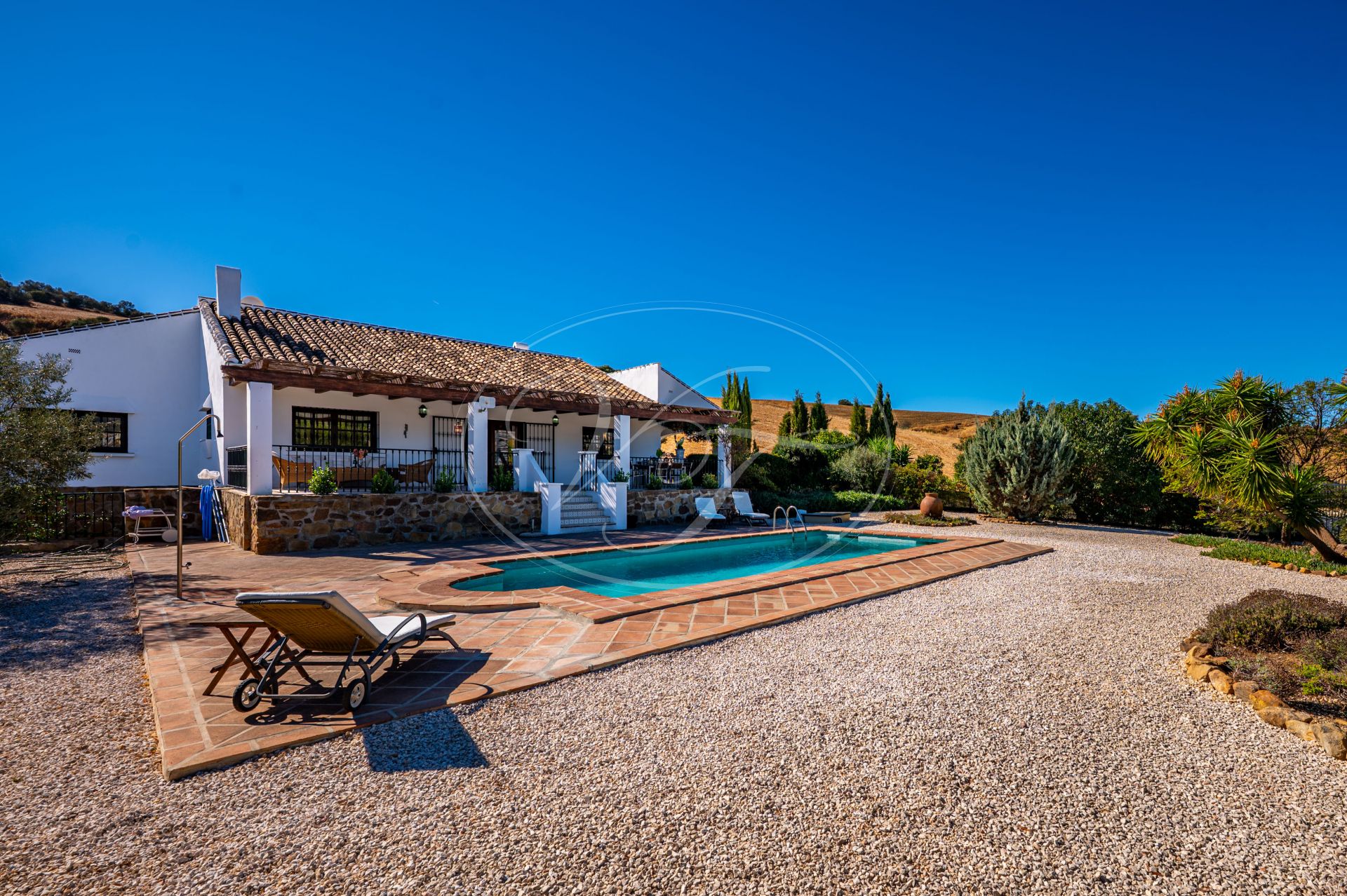 Vanaf de terrassen leidt een trap naar de tuin en het zoutwaterzwembad. Rondom het zwembad is voldoende ruimte om te zonnebaden. De tuin en het grondstuk van deze finca maken dit spectaculaire landhuis uniek. Direct rondom het huis zijn de tuin en het zwembad aangelegd met veel bloembedden. Een boog geeft toegang tot een geplaveide ronde cirkel, een ‘era’. Dit is een oude dorsvloer, waar het graan werd uitgespreid voor de wind, of waar ezels rond werden gedreven, om het eetbare deel van de stengels te scheiden. Een stukje Andalusische landbouwgeschiedenis bewaard op deze prachtige finca! Vanaf hier komt u in de minder formele tuin met fruitbomen zoals moerbeibomen, wijnstokken, citrusbomen en vijgenbomen. Verder heeft de finca een eigen kleine olijf- en amandelboomgaard. Er zijn ongeveer 250-300 olijfbomen, van de variëteiten Hojiblanca en Manzanilla. Afhankelijk van de opbrengst houdt de huidige eigenaar de olie of verkoopt hij deze aan de coöperatie.Achter het huis ligt ook een akker die jaarlijks met tarwe wordt ingezaaid. Deze wordt volledig onderhouden en geoogst door een lokale boer.