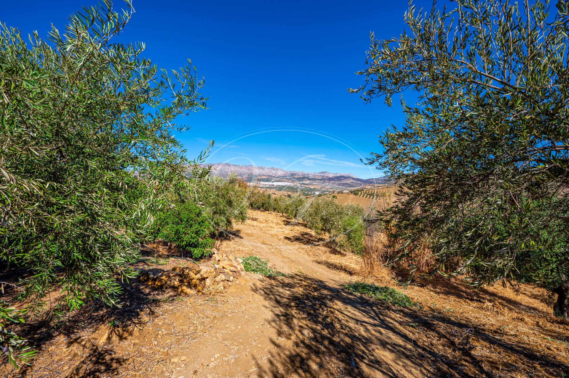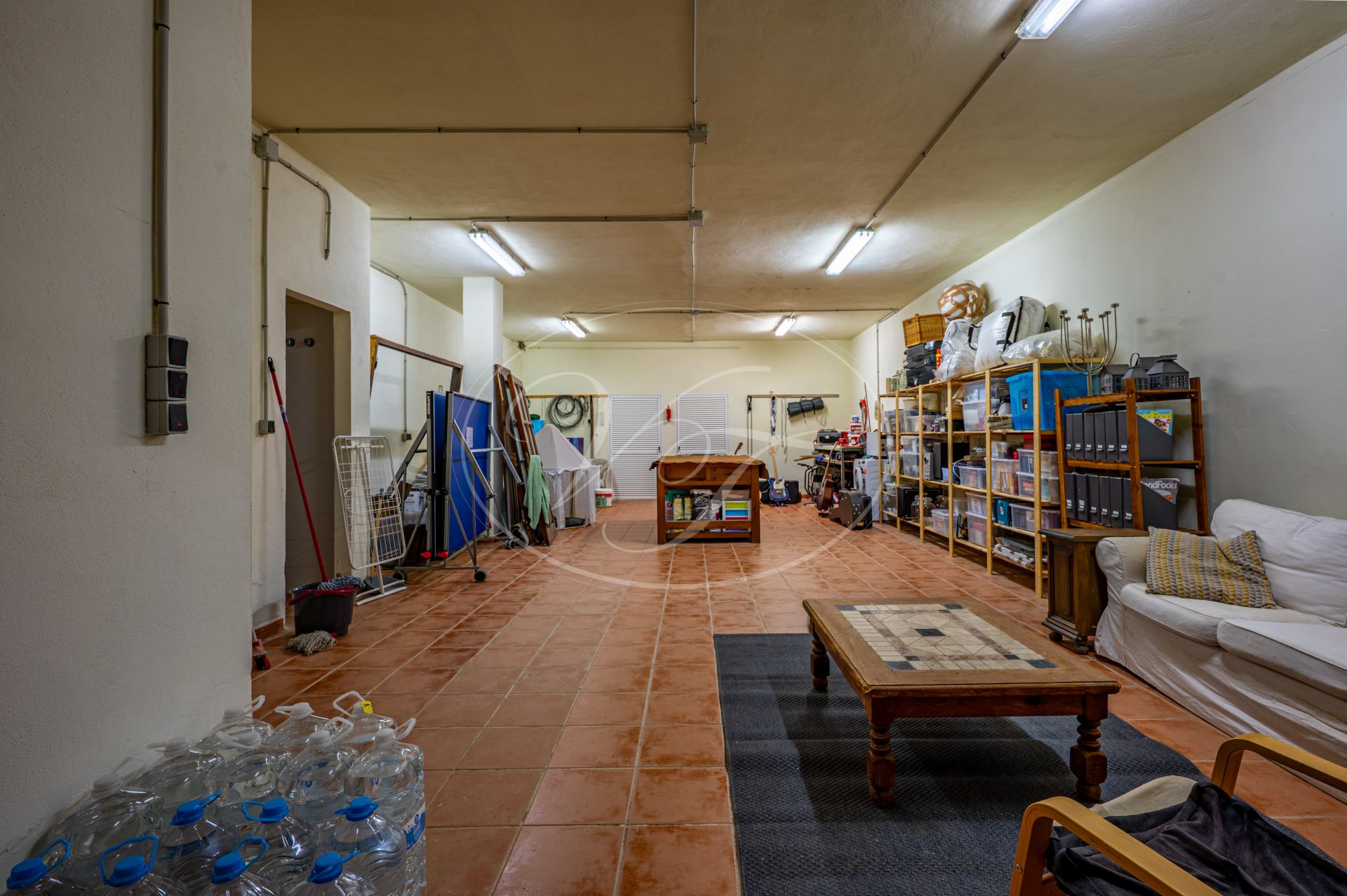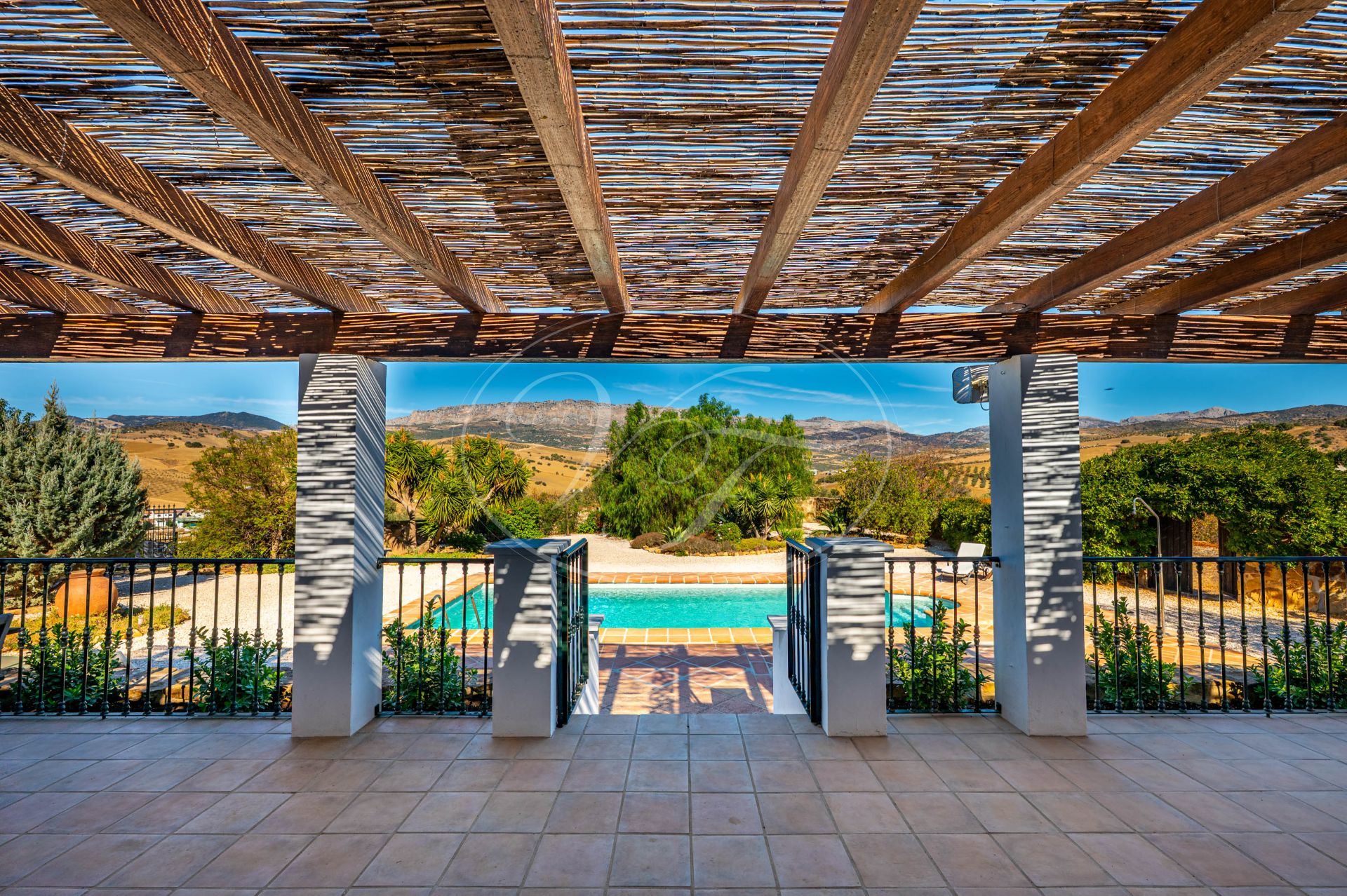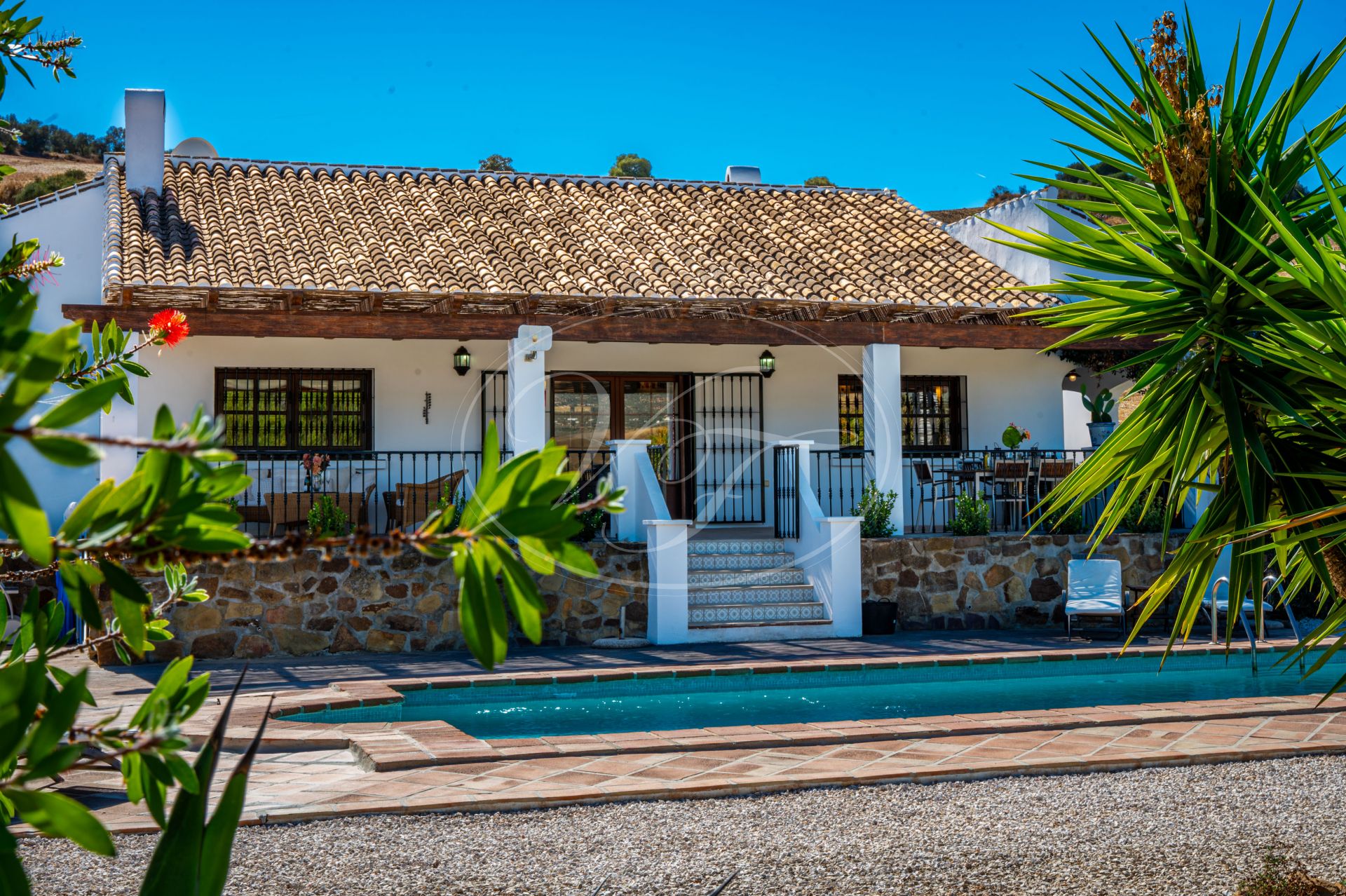 Vanaf de terrassen leidt een trap naar de tuin en het zoutwaterzwembad. Rondom het zwembad is voldoende ruimte om te zonnebaden. De tuin en het grondstuk van deze finca maken dit spectaculaire landhuis uniek. Direct rondom het huis zijn de tuin en het zwembad aangelegd met veel bloembedden. Een boog geeft toegang tot een geplaveide ronde cirkel, een ‘era’. Dit is een oude dorsvloer, waar het graan werd uitgespreid voor de wind, of waar ezels rond werden gedreven, om het eetbare deel van de stengels te scheiden. Een stukje Andalusische landbouwgeschiedenis bewaard op deze prachtige finca! Vanaf hier komt u in de minder formele tuin met fruitbomen zoals moerbeibomen, wijnstokken, citrusbomen en vijgenbomen. Verder heeft de finca een eigen kleine olijf- en amandelboomgaard. Er zijn ongeveer 250-300 olijfbomen, van de variëteiten Hojiblanca en Manzanilla. Afhankelijk van de opbrengst houdt de huidige eigenaar de olie of verkoopt hij deze aan de coöperatie.Achter het huis ligt ook een akker die jaarlijks met tarwe wordt ingezaaid. Deze wordt volledig onderhouden en geoogst door een lokale boer.