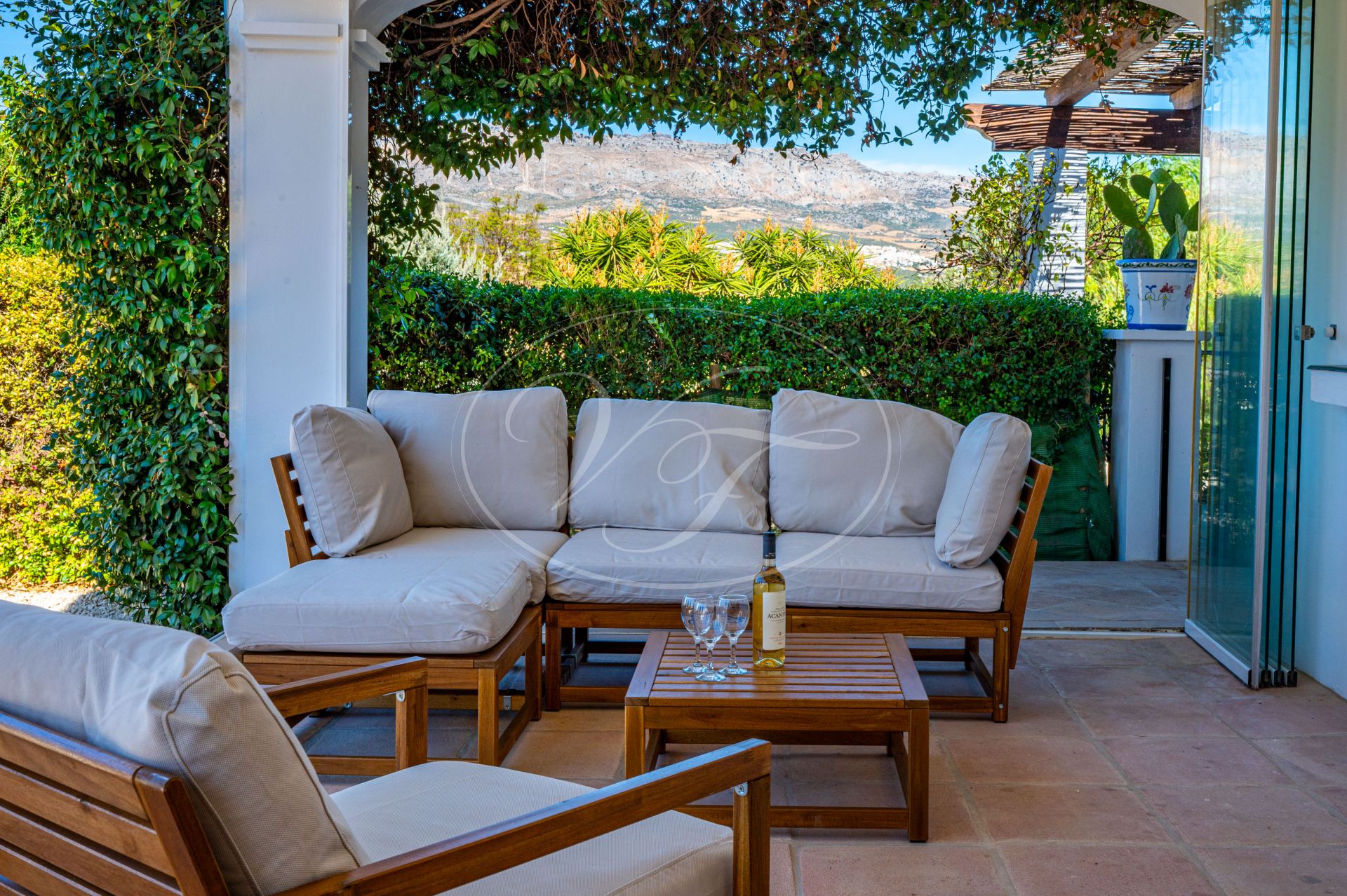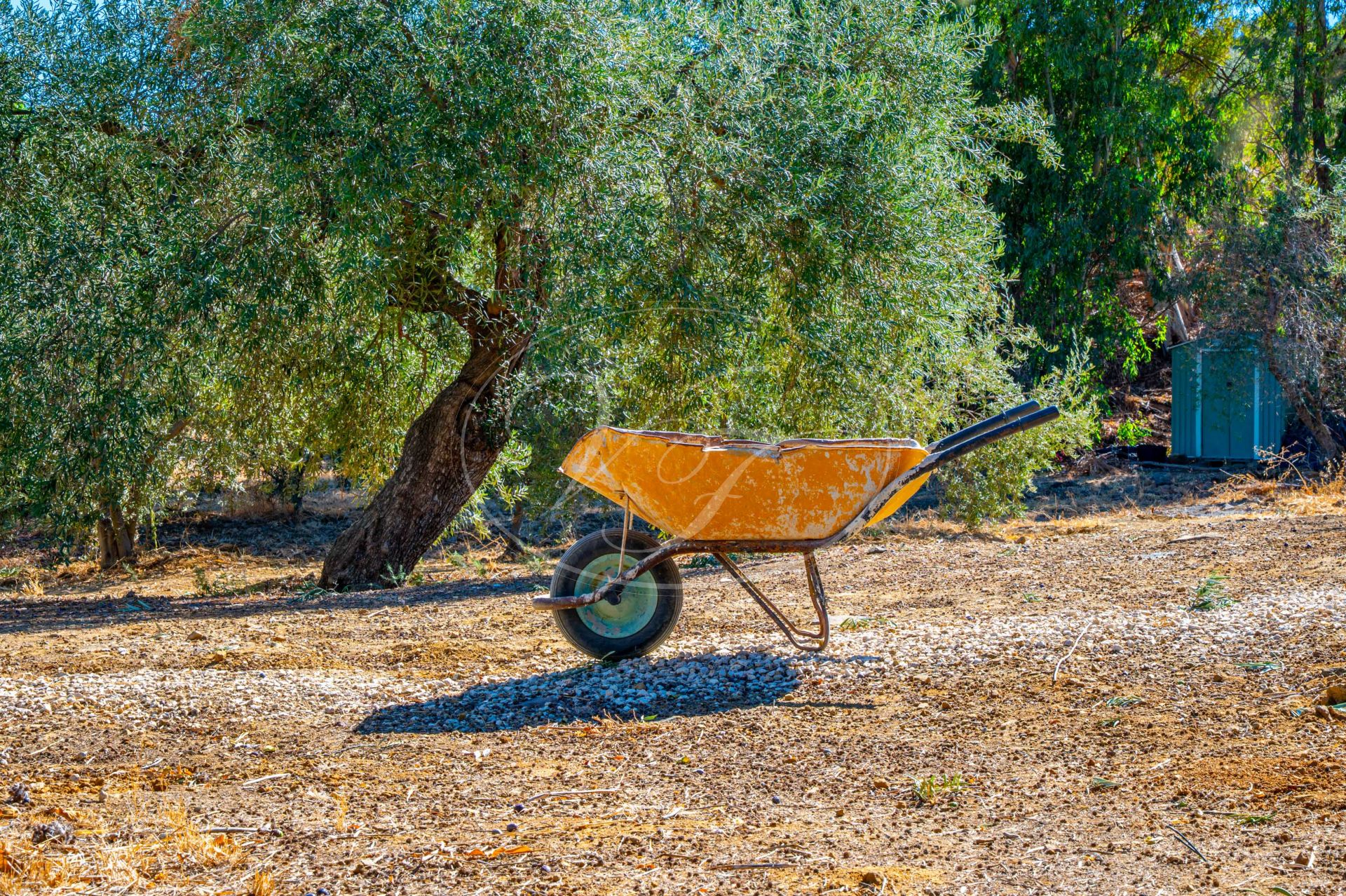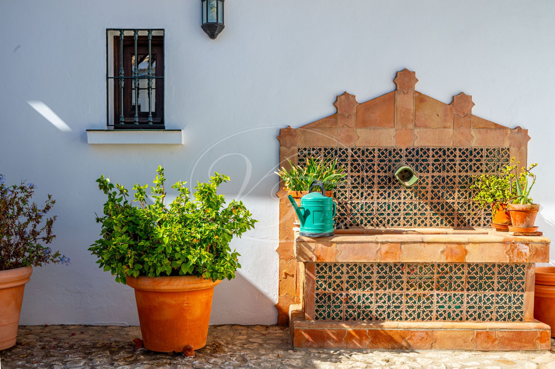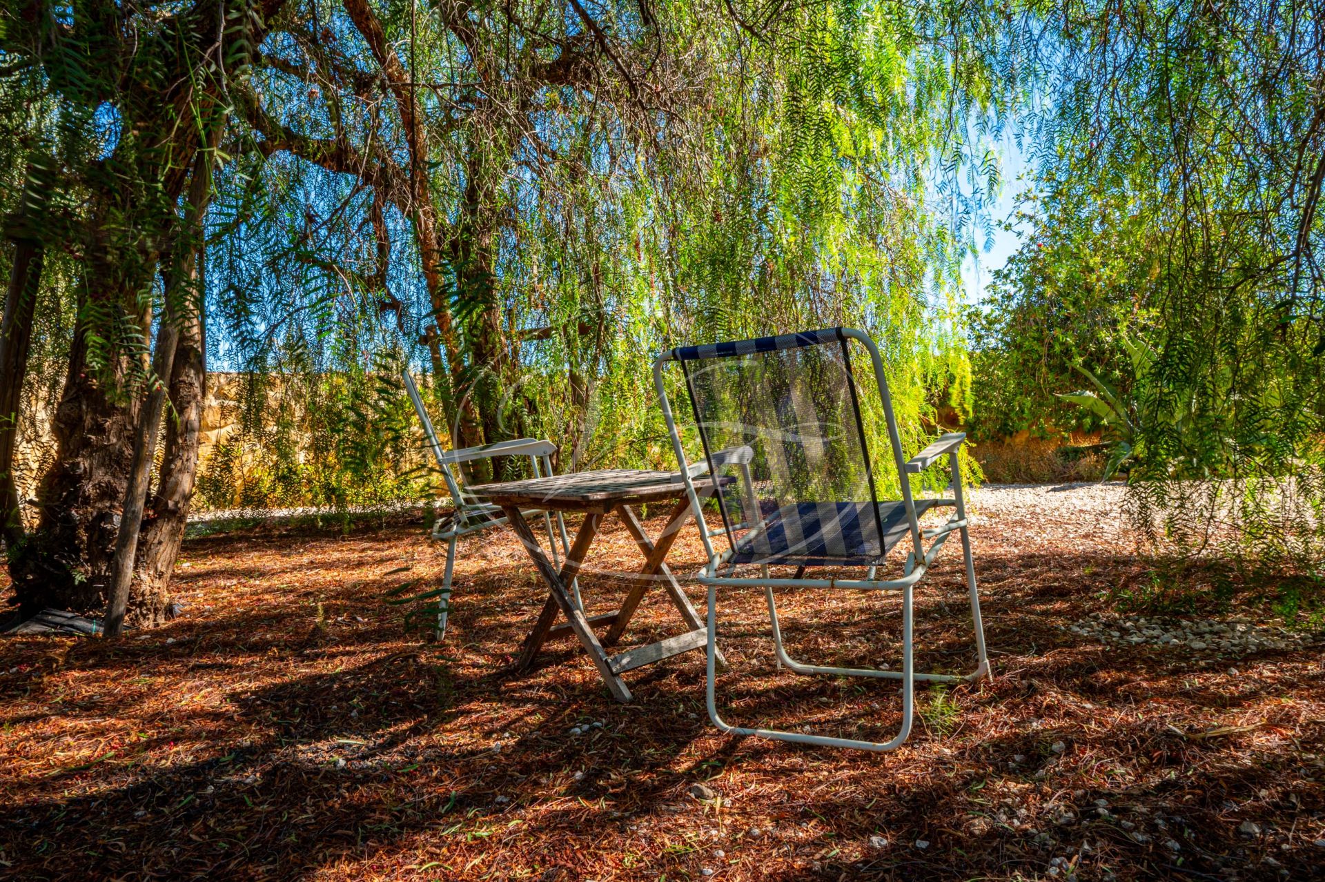 Vanaf de terrassen leidt een trap naar de tuin en het zoutwaterzwembad. Rondom het zwembad is voldoende ruimte om te zonnebaden. De tuin en het grondstuk van deze finca maken dit spectaculaire landhuis uniek. Direct rondom het huis zijn de tuin en het zwembad aangelegd met veel bloembedden. Een boog geeft toegang tot een geplaveide ronde cirkel, een ‘era’. Dit is een oude dorsvloer, waar het graan werd uitgespreid voor de wind, of waar ezels rond werden gedreven, om het eetbare deel van de stengels te scheiden. Een stukje Andalusische landbouwgeschiedenis bewaard op deze prachtige finca! Vanaf hier komt u in de minder formele tuin met fruitbomen zoals moerbeibomen, wijnstokken, citrusbomen en vijgenbomen. Verder heeft de finca een eigen kleine olijf- en amandelboomgaard. Er zijn ongeveer 250-300 olijfbomen, van de variëteiten Hojiblanca en Manzanilla. Afhankelijk van de opbrengst houdt de huidige eigenaar de olie of verkoopt hij deze aan de coöperatie.Achter het huis ligt ook een akker die jaarlijks met tarwe wordt ingezaaid. Deze wordt volledig onderhouden en geoogst door een lokale boer.